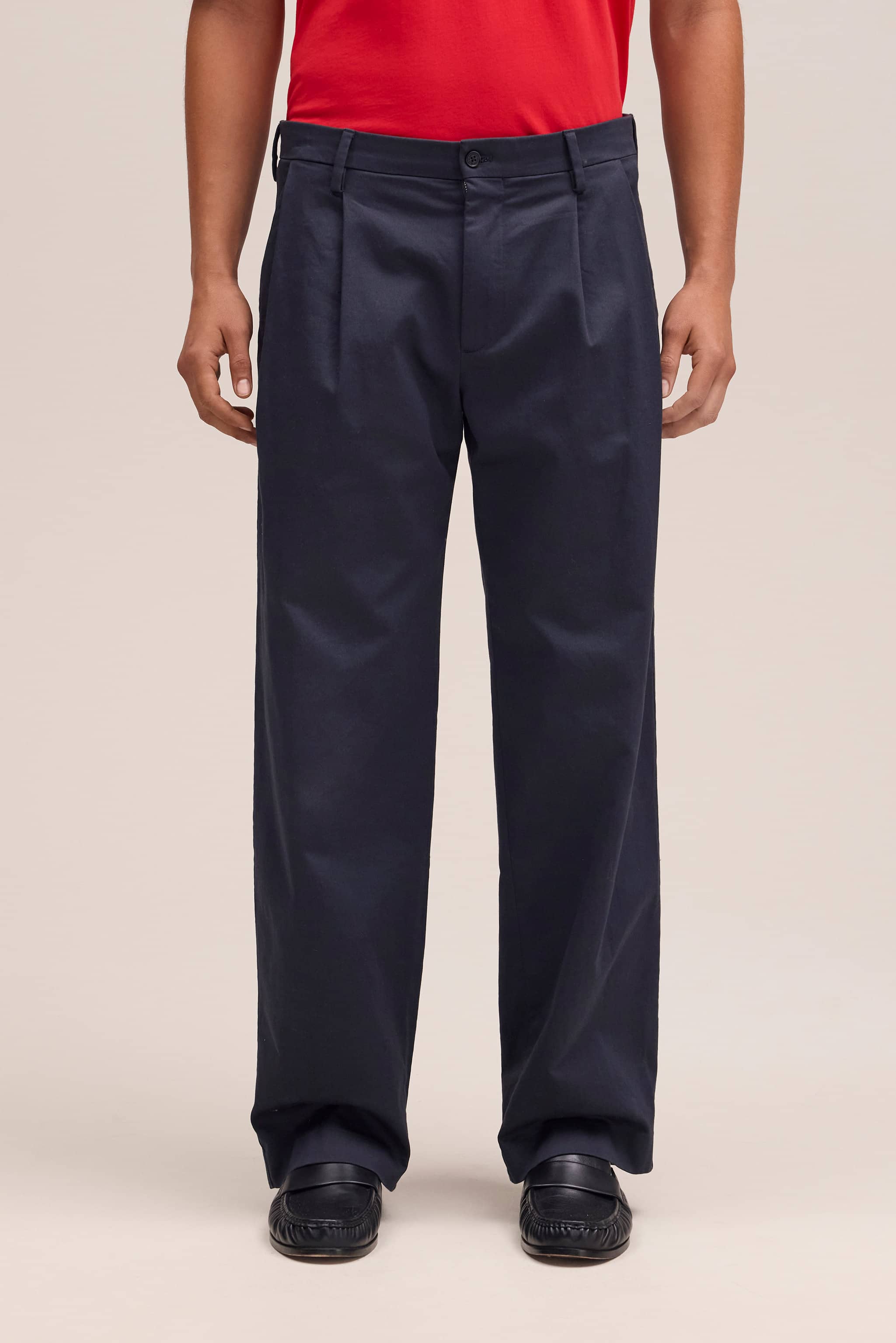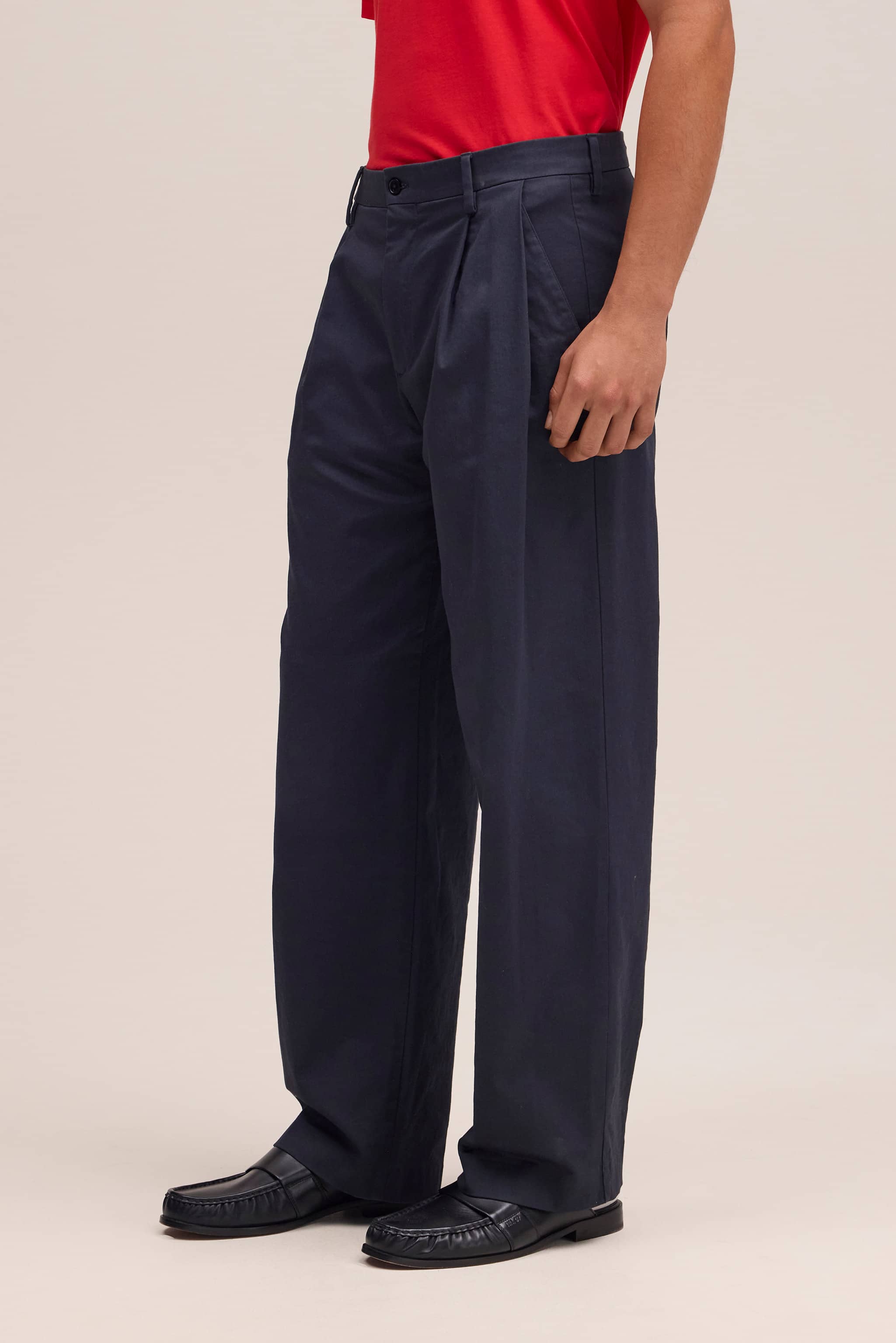 Relaxed fit trousers in a wide-leg silhouette made from organic cotton with a soft brushed finish. Features double pleats and waistband buckle detailing for tailored elegance.