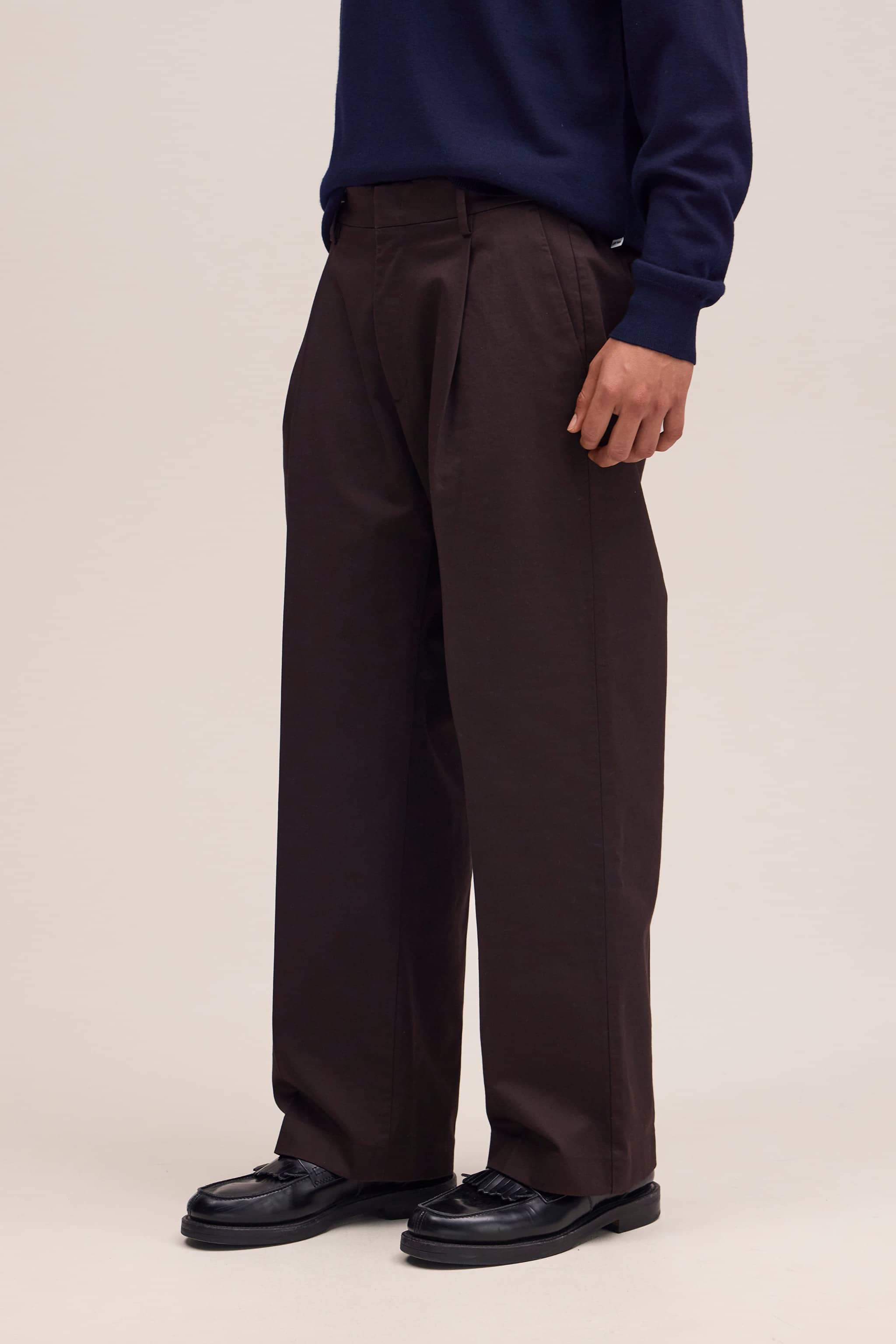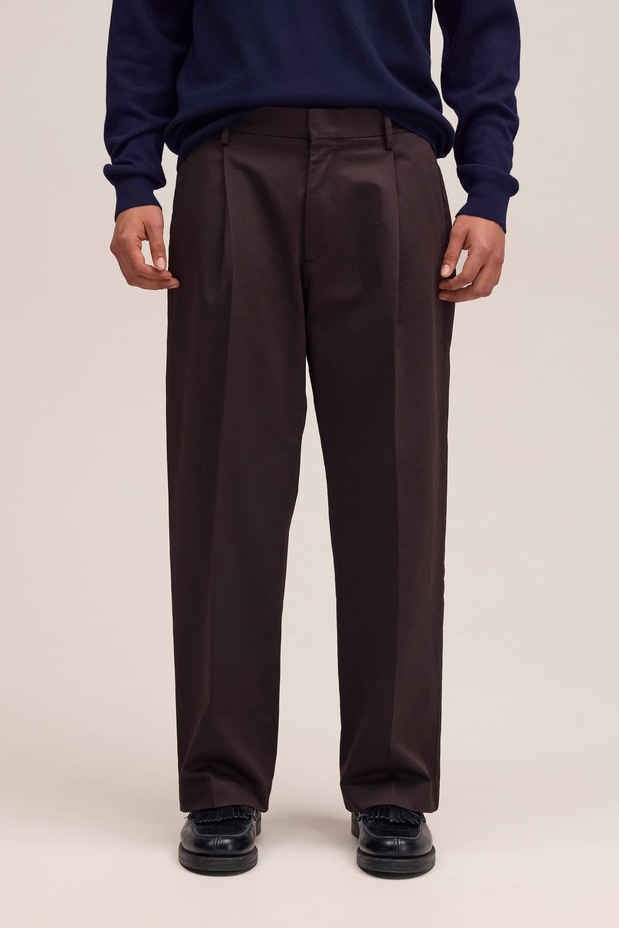 Relaxed-fit pleated trousers crafted from soft organic cotton with a lustrous satin finish. Designed with double pleats at the front and a hook and bar closure, offering a drapey yet crisp handfeel.