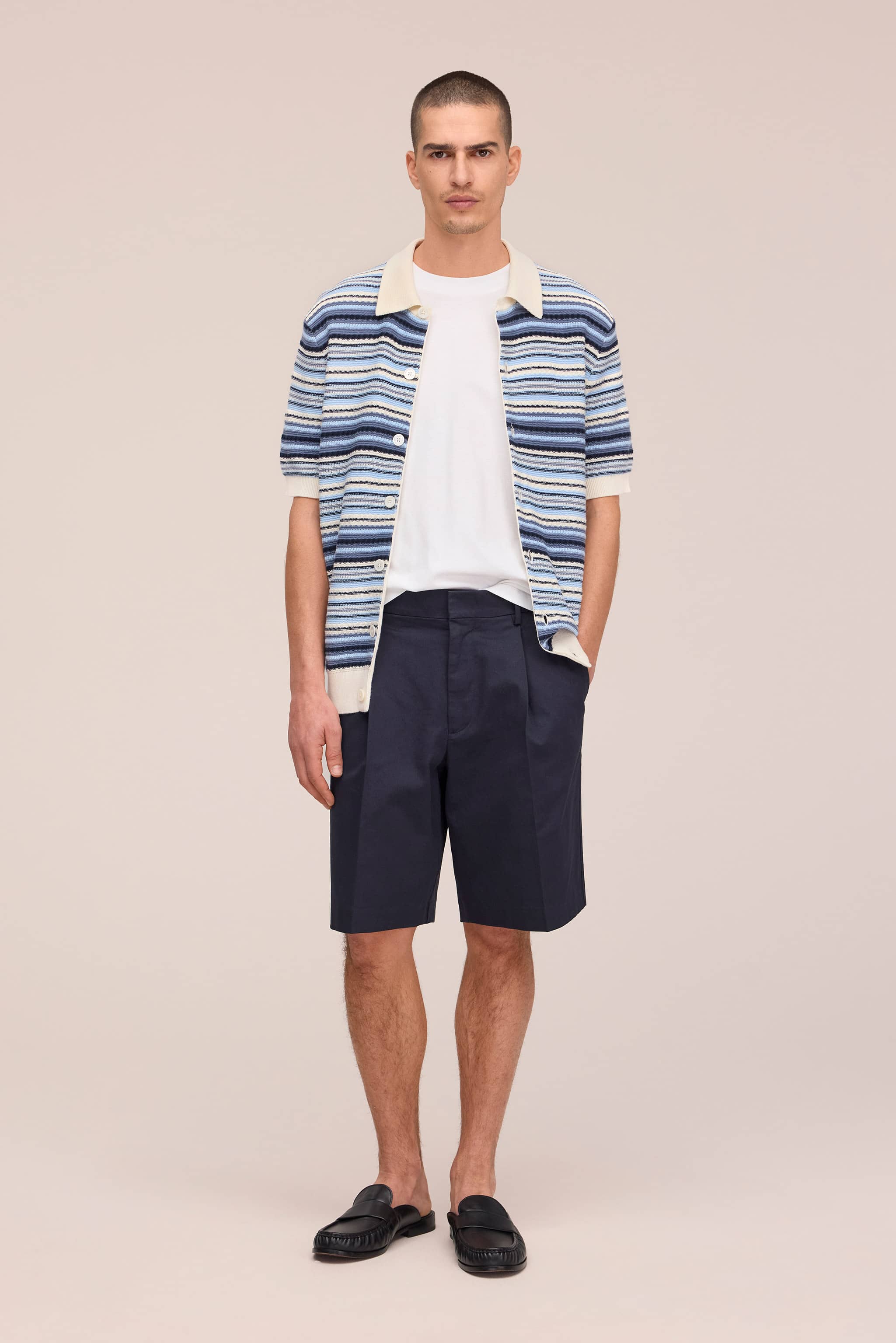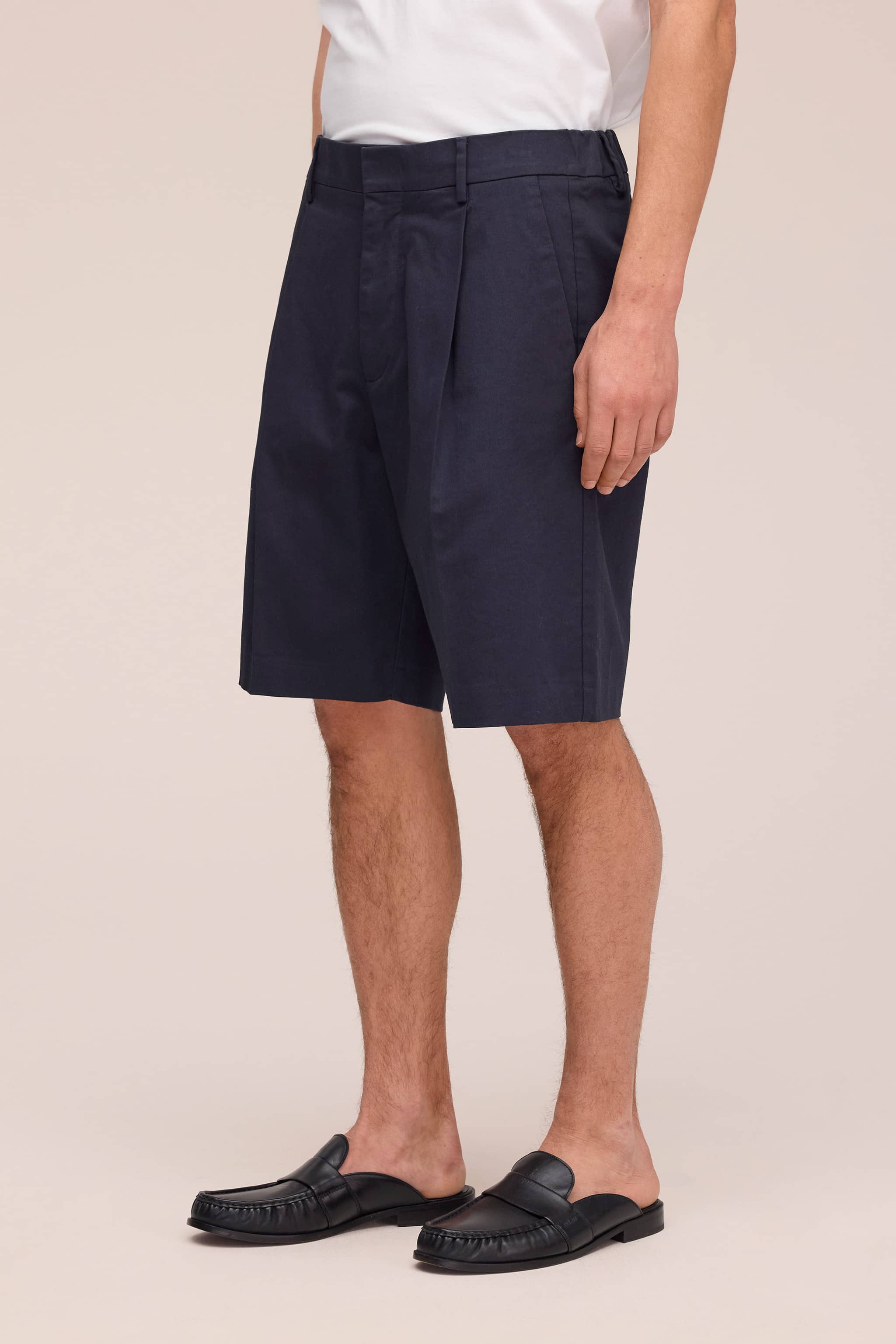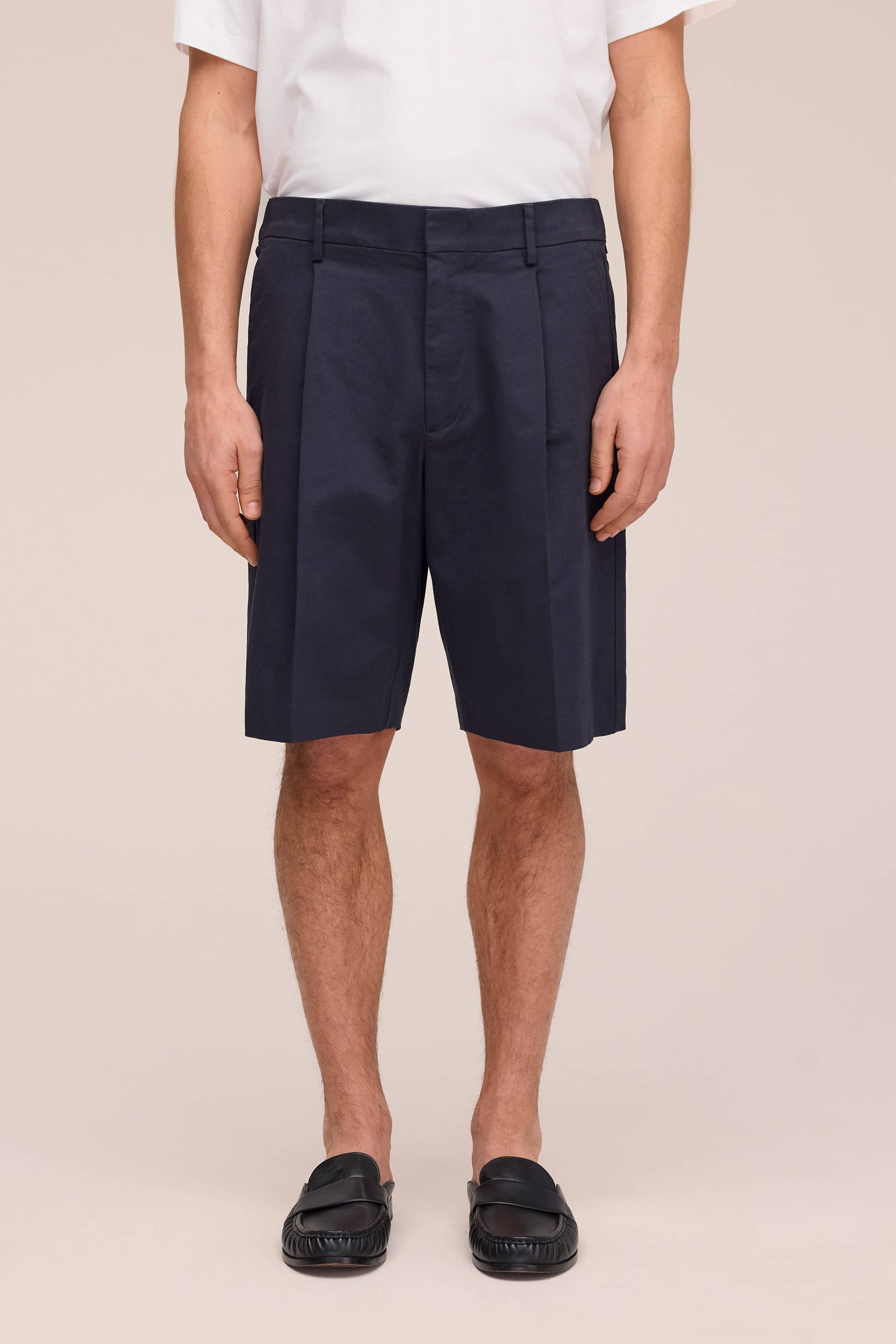 Relaxed-fit dress shorts crafted in organic cotton with a touch of elastane in a smooth satin weave. Designed with front pleats for a sophisticated drape and finished with a hook and bar closure and back pockets.