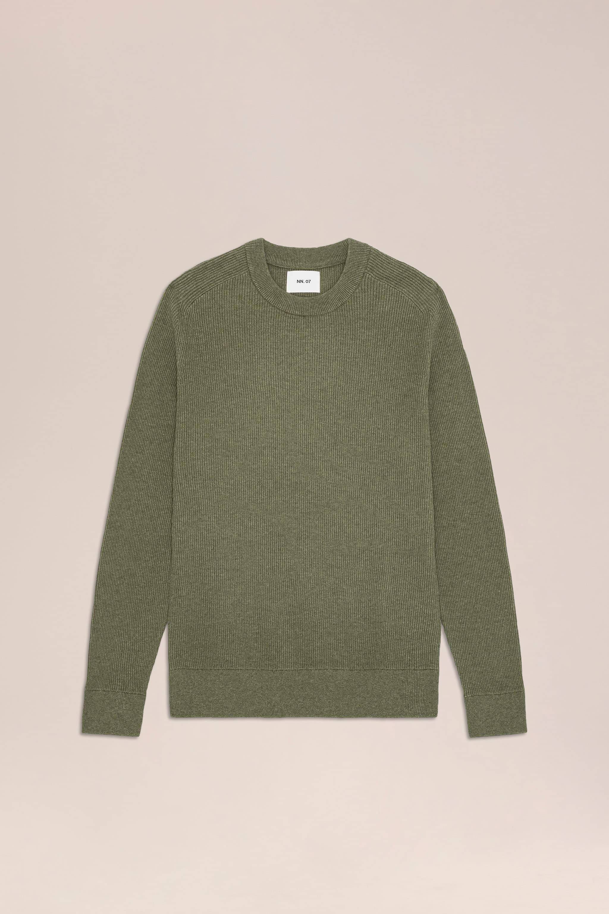 Crew neck sweater knit in a rib stitch, crafted in a cotton blend.