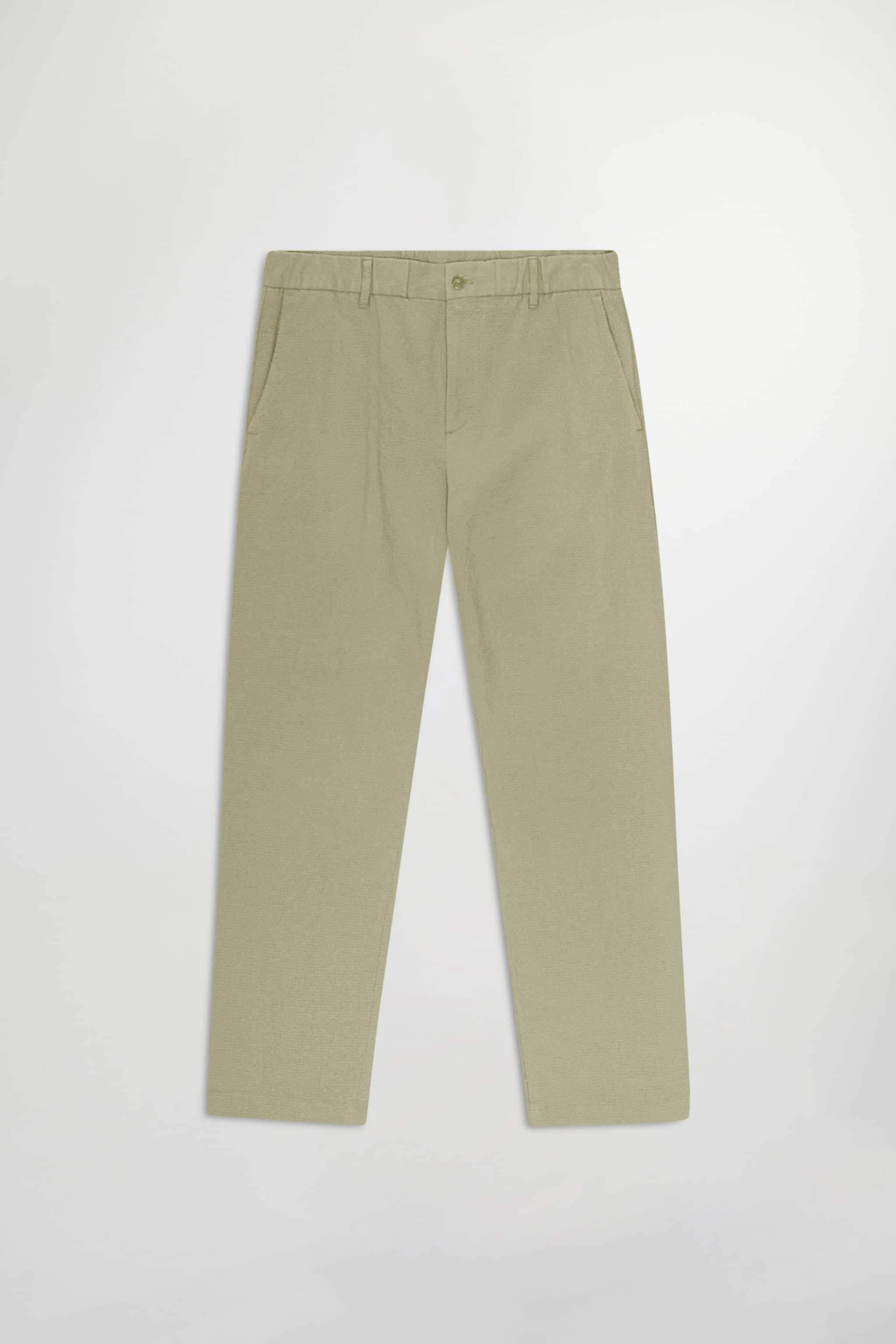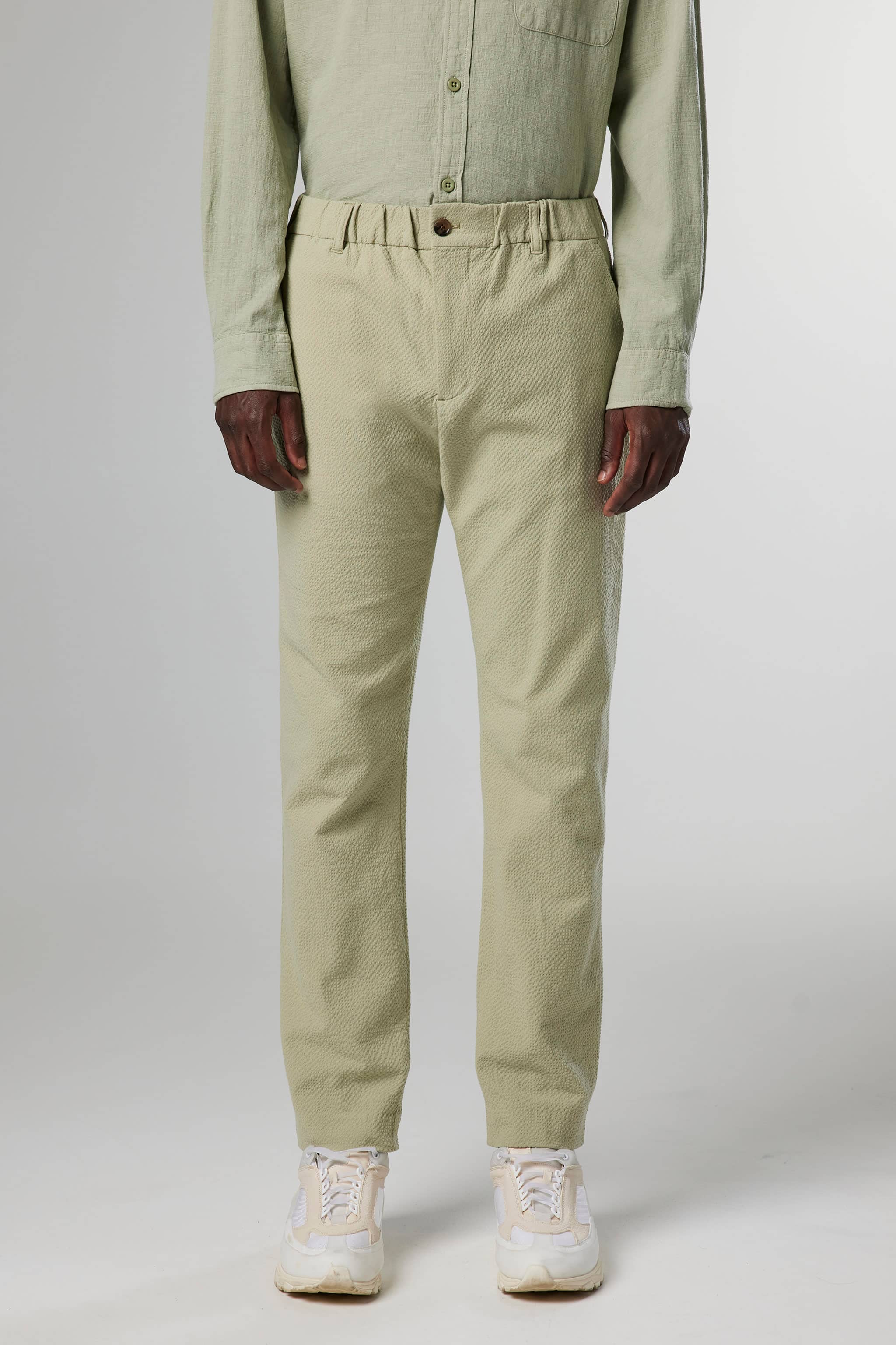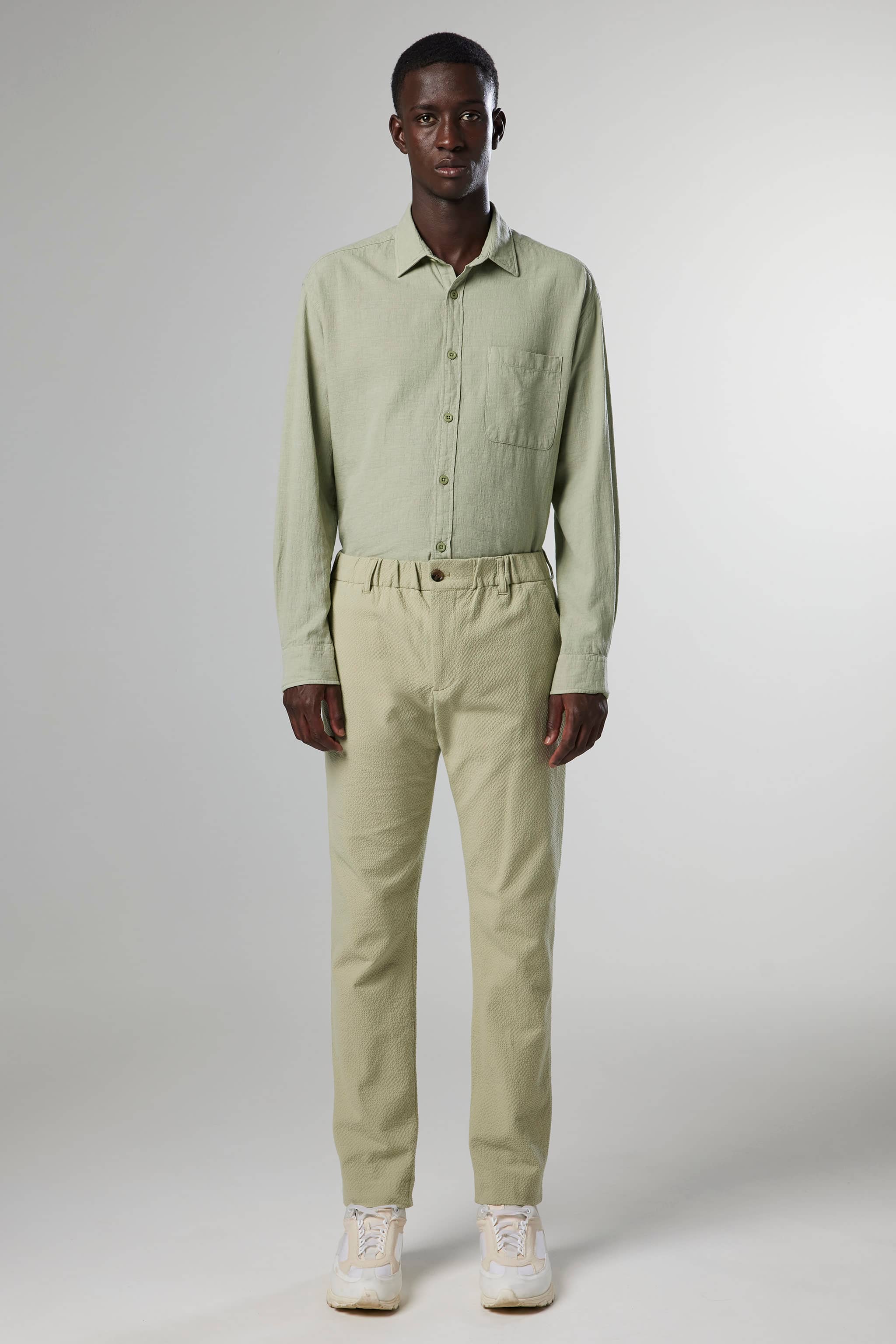 Seersucker trousers in a regular fit with tapered leg, crafted in a 180 g/m2 organic cotton fabric with a touch of stretch. Features a crisp crease and blind hem. Finished with an earthhorn top button and zip-fly closure.
