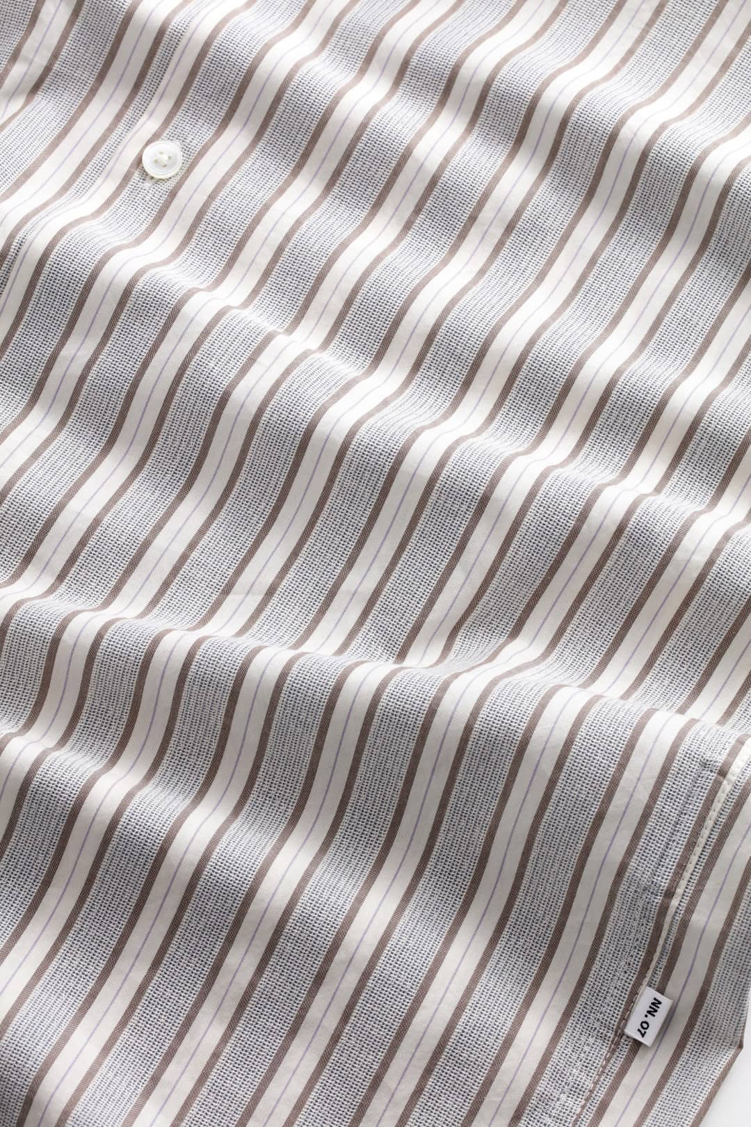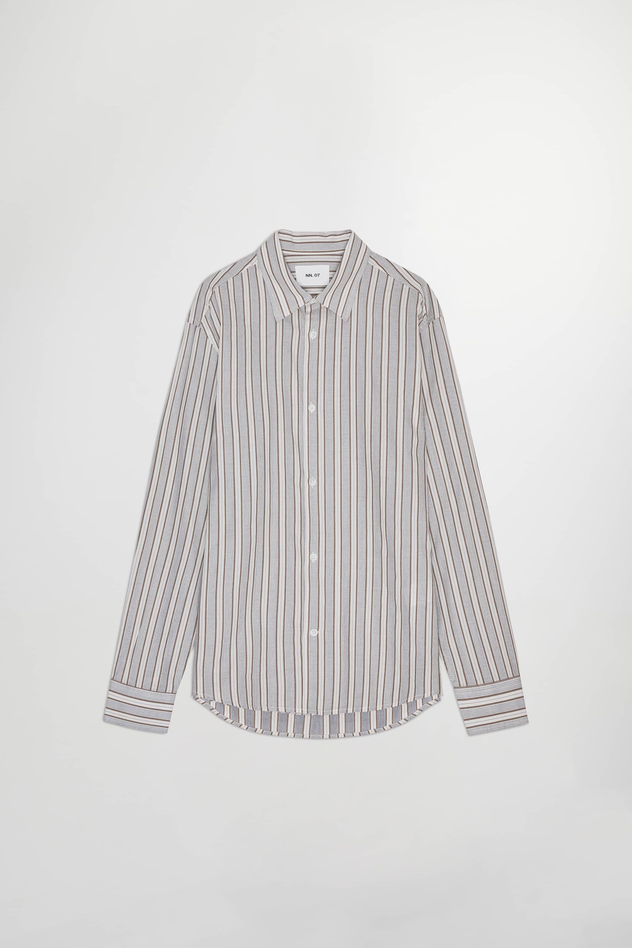 Lightweight shirt in a smooth organic cotton woven in a yarn dyed stripe, finished with Mother-of-Pearl buttons.