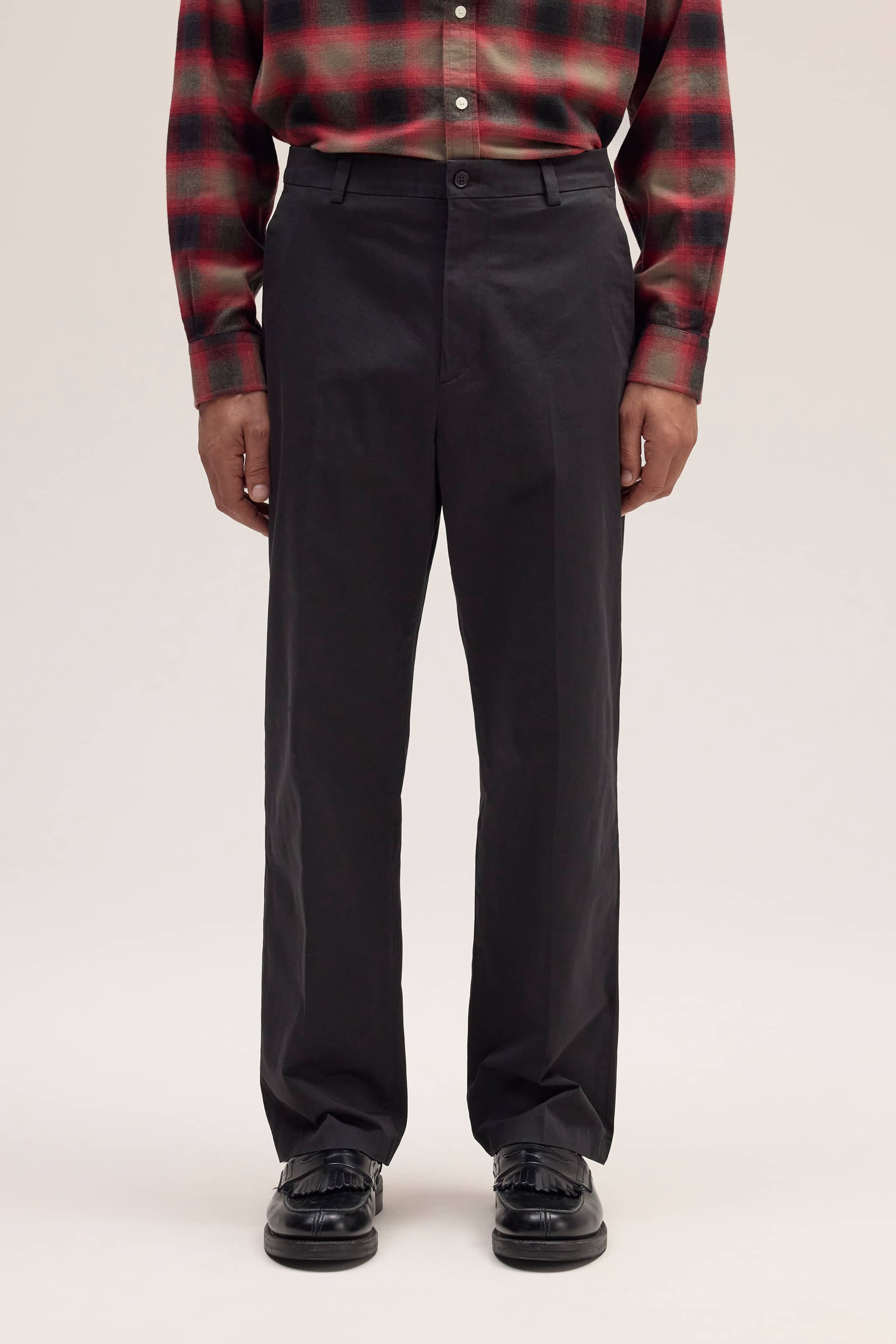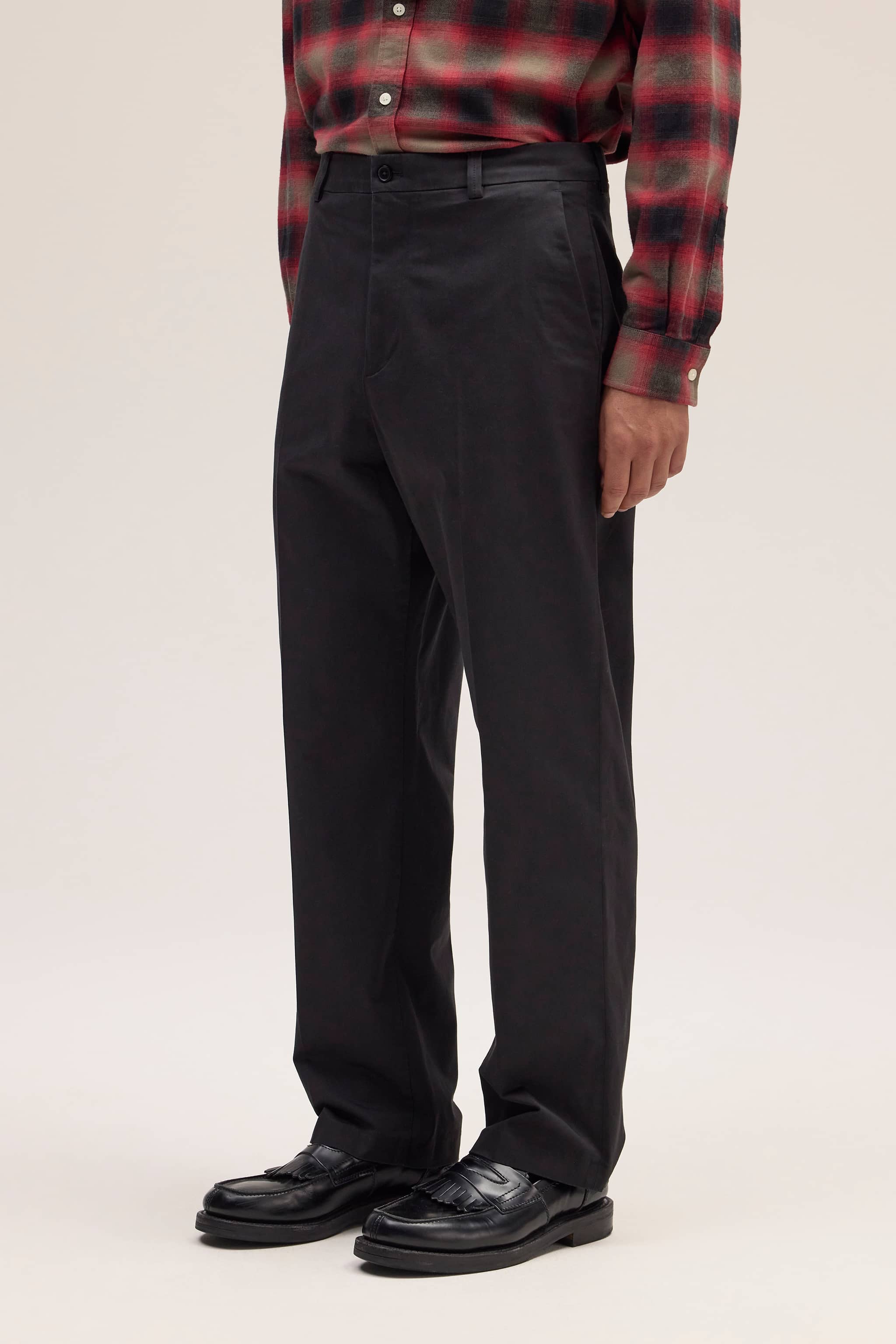 A pair of relaxed, straight-leg trousers crafted in a soft satin 220 g/m2 organic cotton and TENCEL™ lyocell blend with a touch of stretch. Tailored with slanted side pockets and dual back welt pockets.