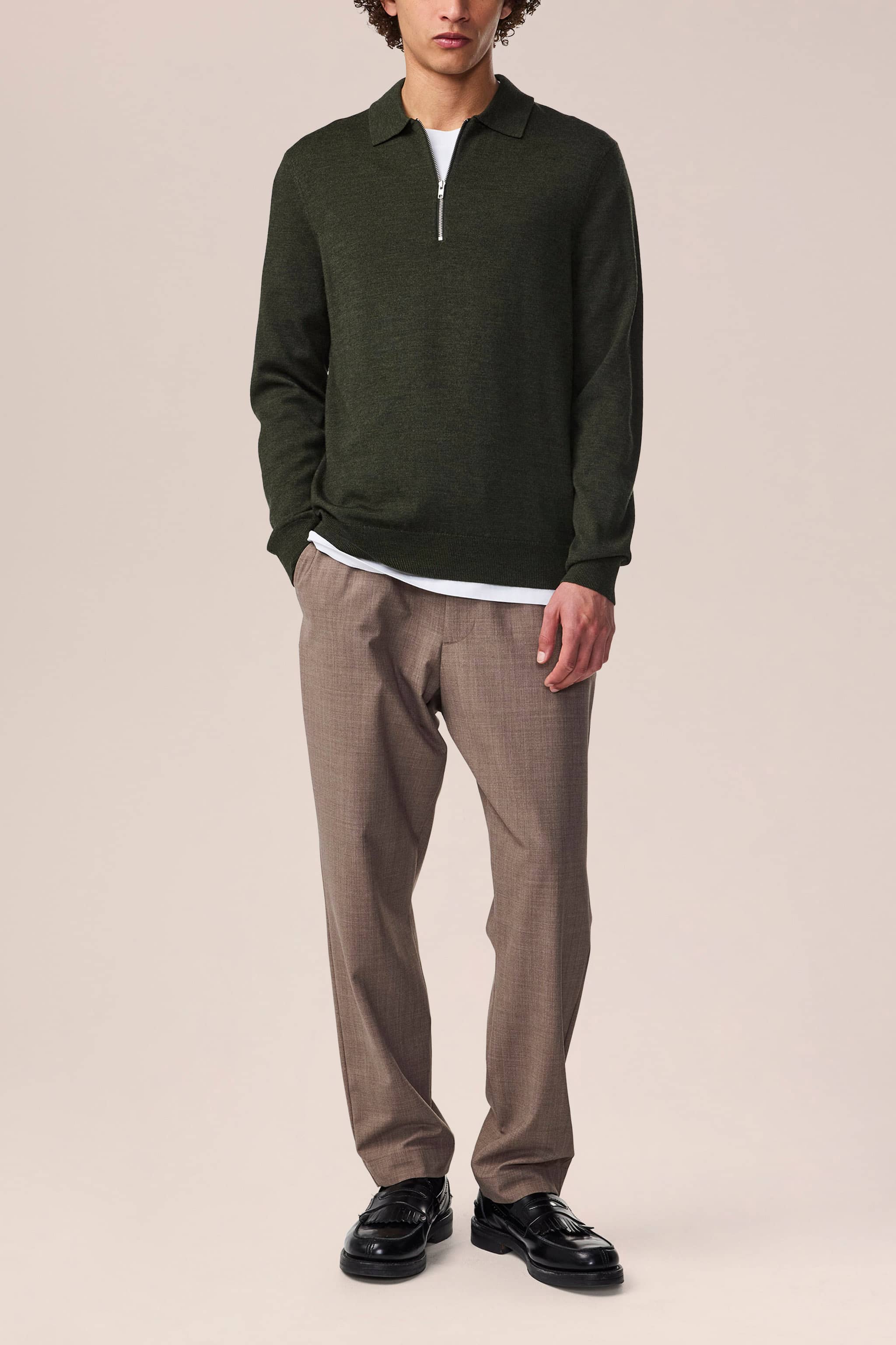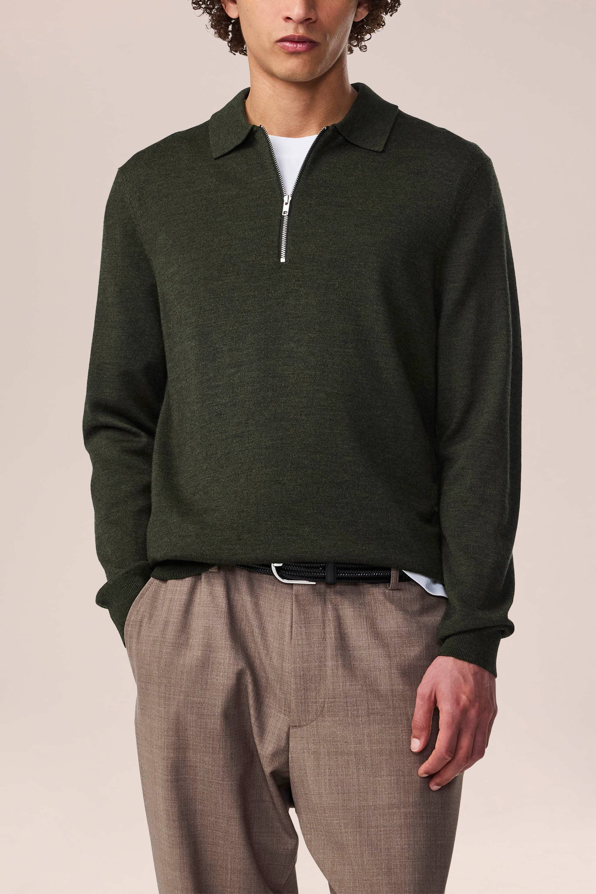 Zip-up polo crafted in soft certified merino wool with a lightweight feel. Knit in a plain stitch with a neat rib along the hem and cuff and topped with a YKK zipper closure.
