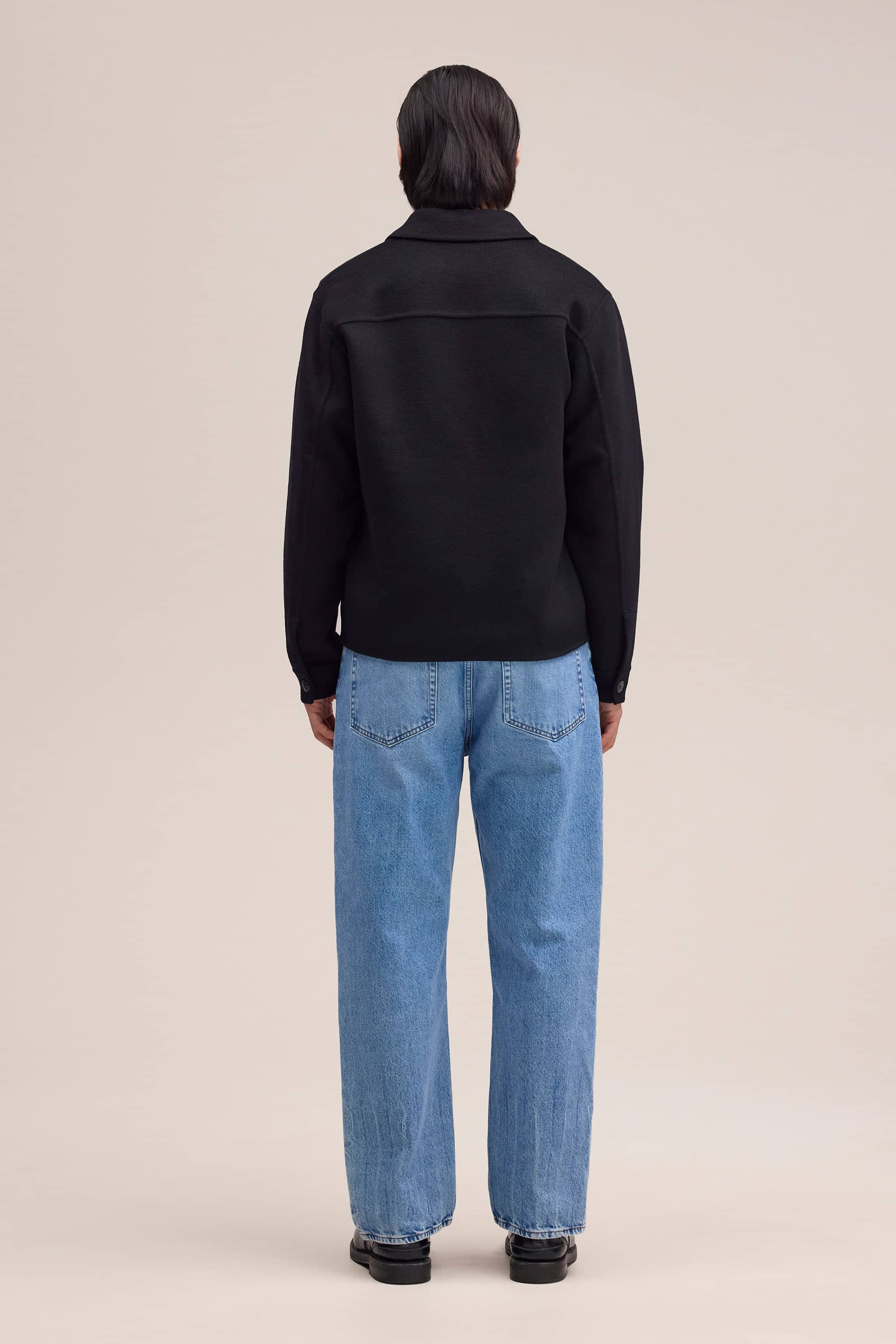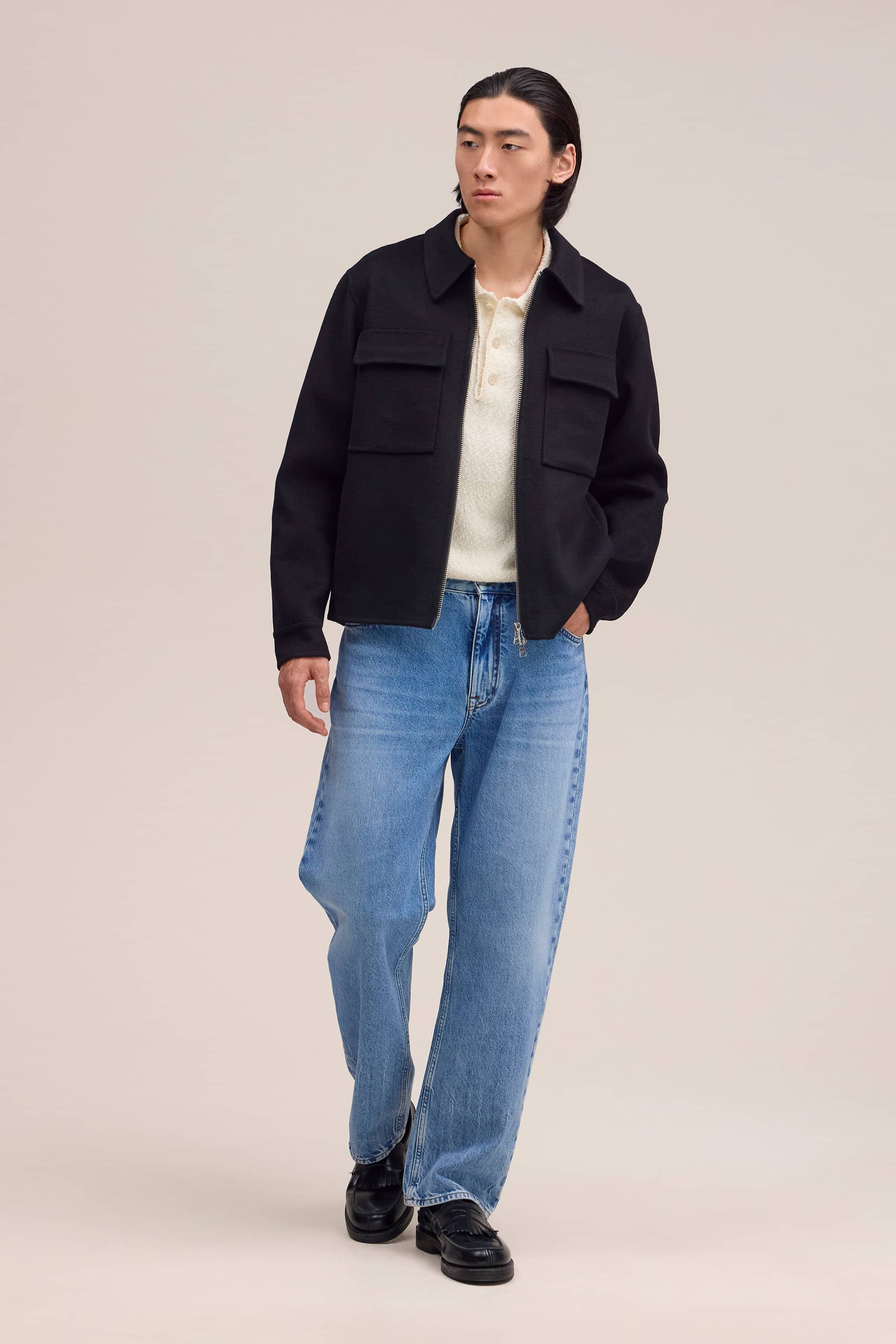 Brushed hip-length jacket crafted from a double faced wool-blend in a plain weave. Features two slanted chest pockets, faux horn buttons and a logo zipper.