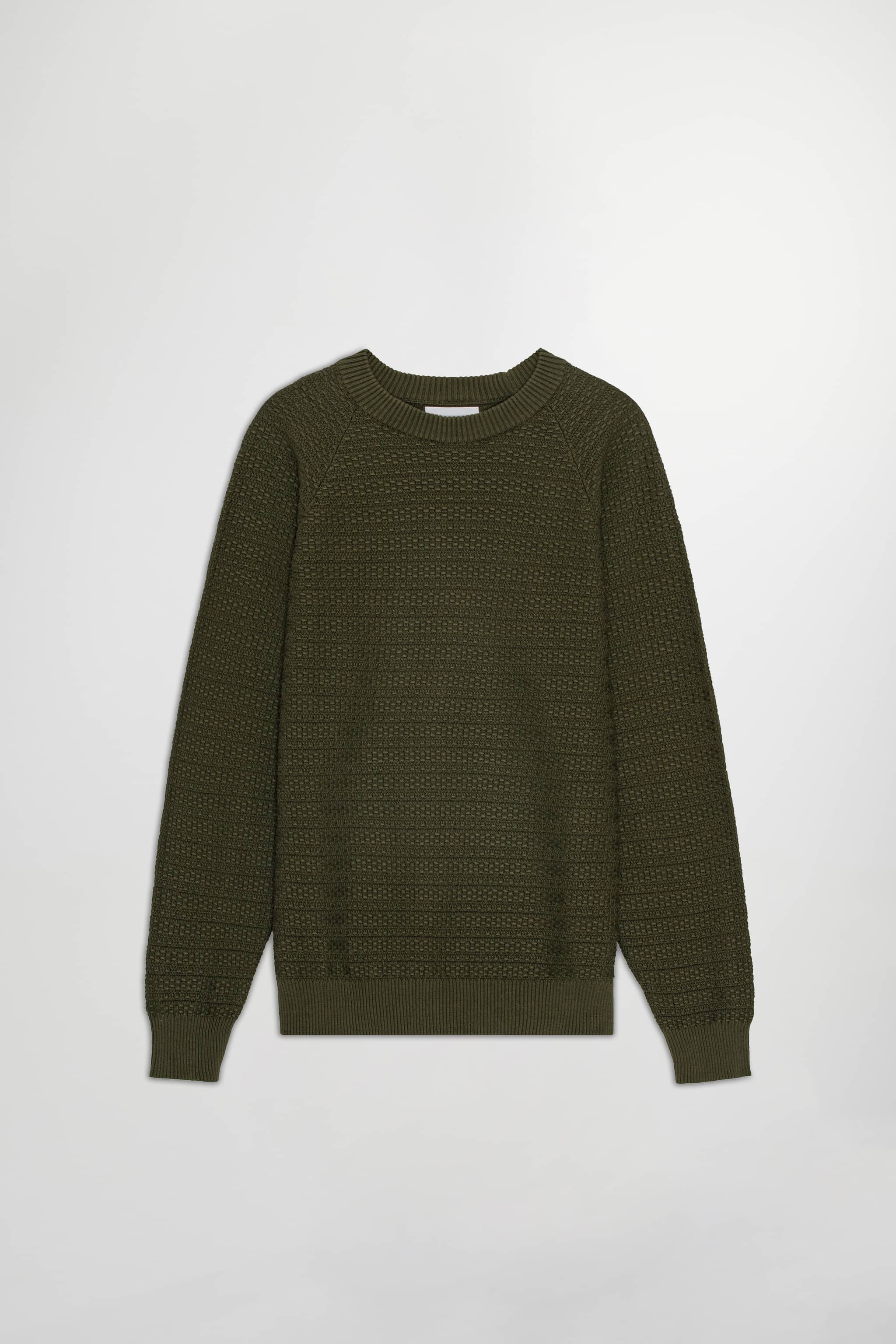 Italian knit crafted in very soft organic cotton yarn with a textured stitch, raglan sleeves, and rib-knitted edges.