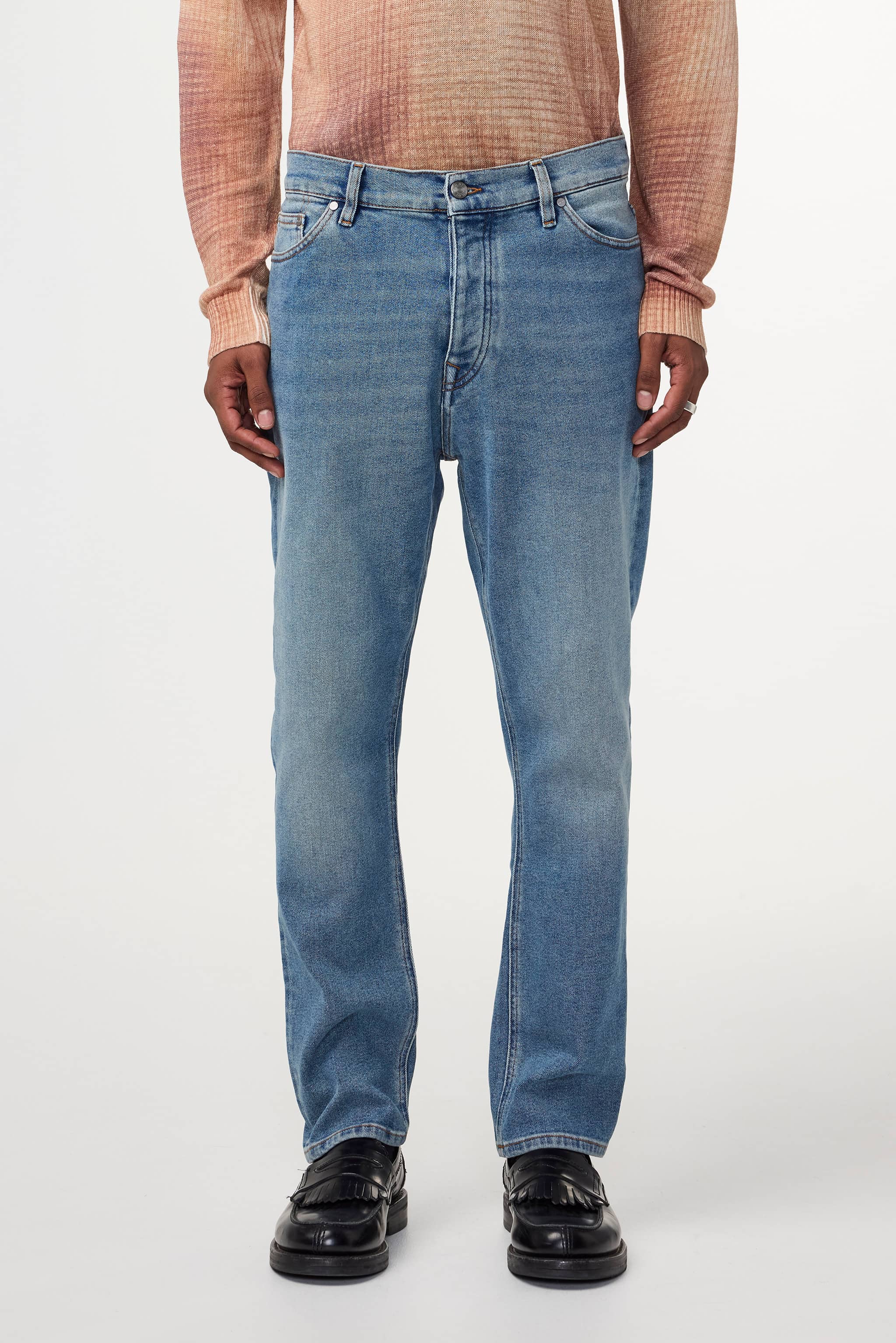Regular fit jeans with tapered leg, crafted from a structured 13.50 oz midweight cotton blend. Features an enzyme and bleach rinse for a subtle whiskering and distressed sanding effect, along with five-pocket styling. Finished with a matte silver metal button closure and matching rivets, plus blue embroidery stitching along the back pocket.