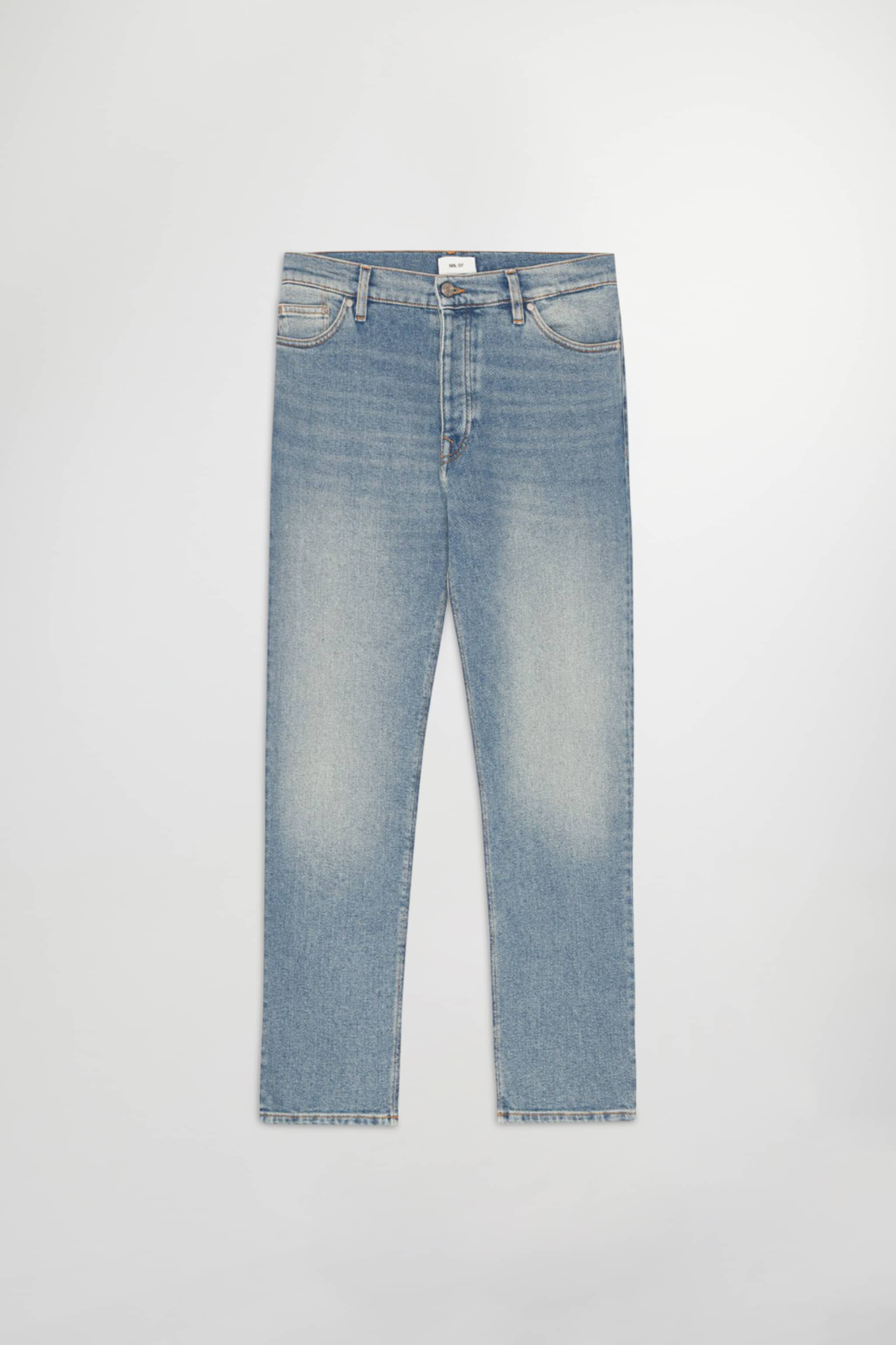 Regular, straight-leg jeans crafted from bleached, midweight 12.50 oz organic cotton denim.