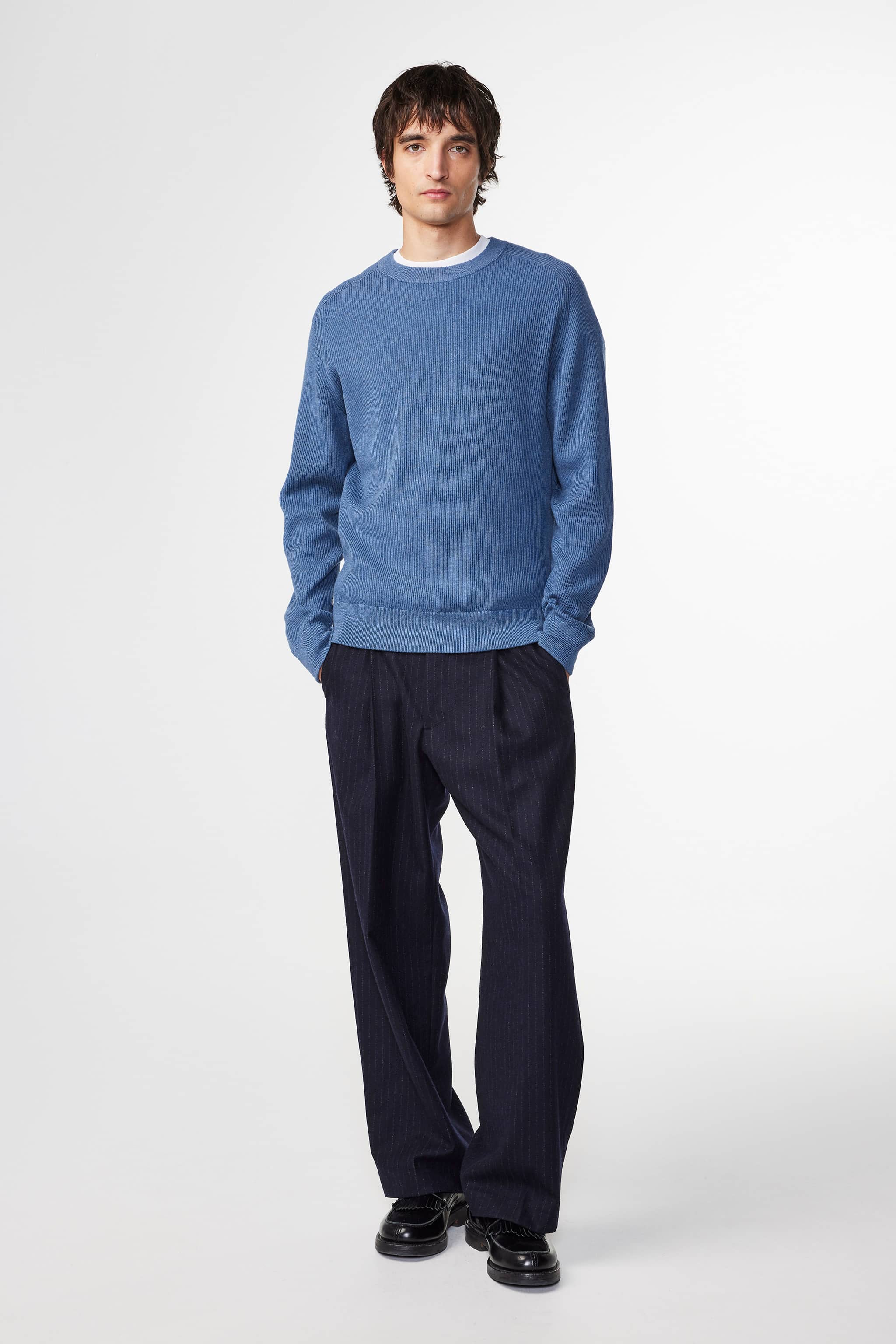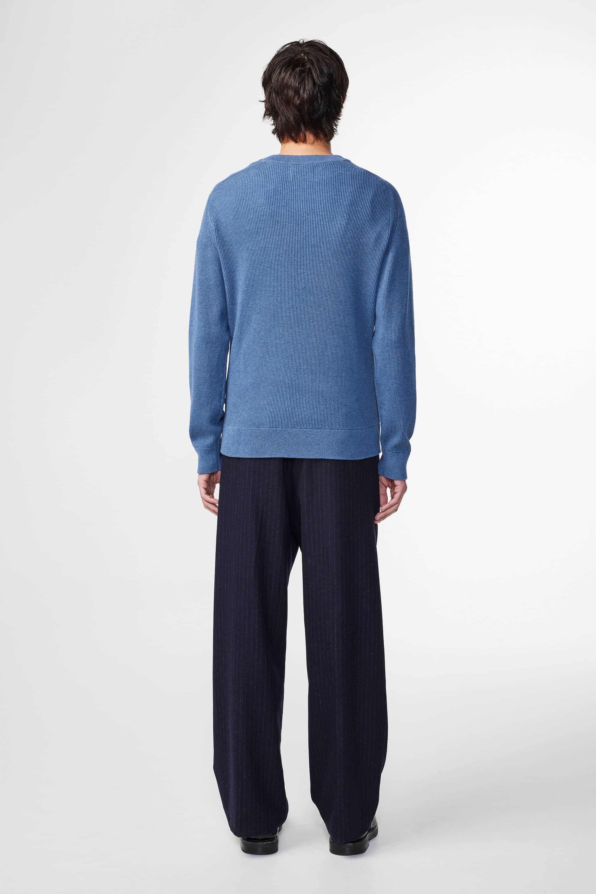 Crew neck sweater crafted in soft organic cotton with a distinctive ribbed texture throughout. Features classic saddle sleeves and offers a lightweight, comfortable feel perfect for layering or wearing on its own.