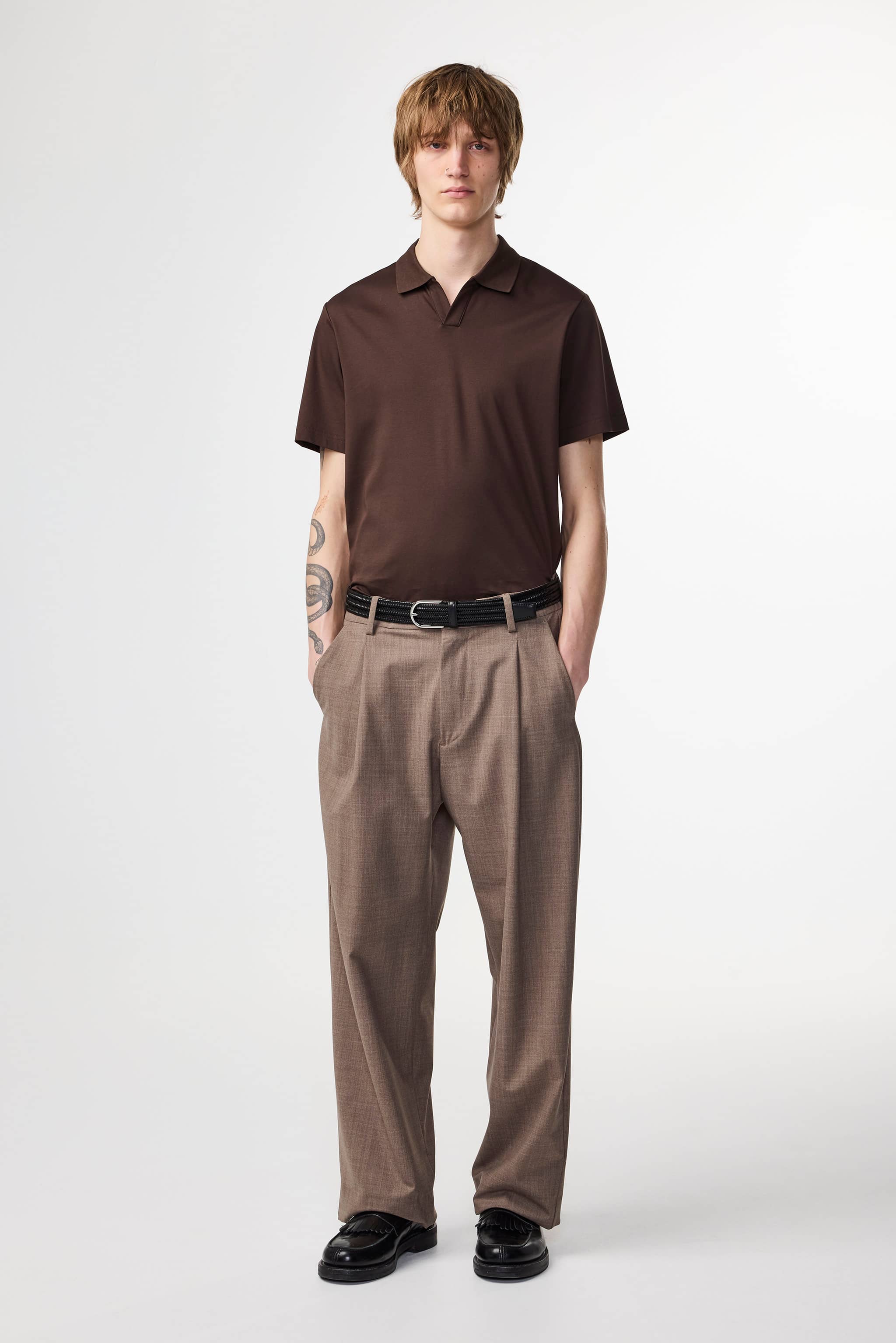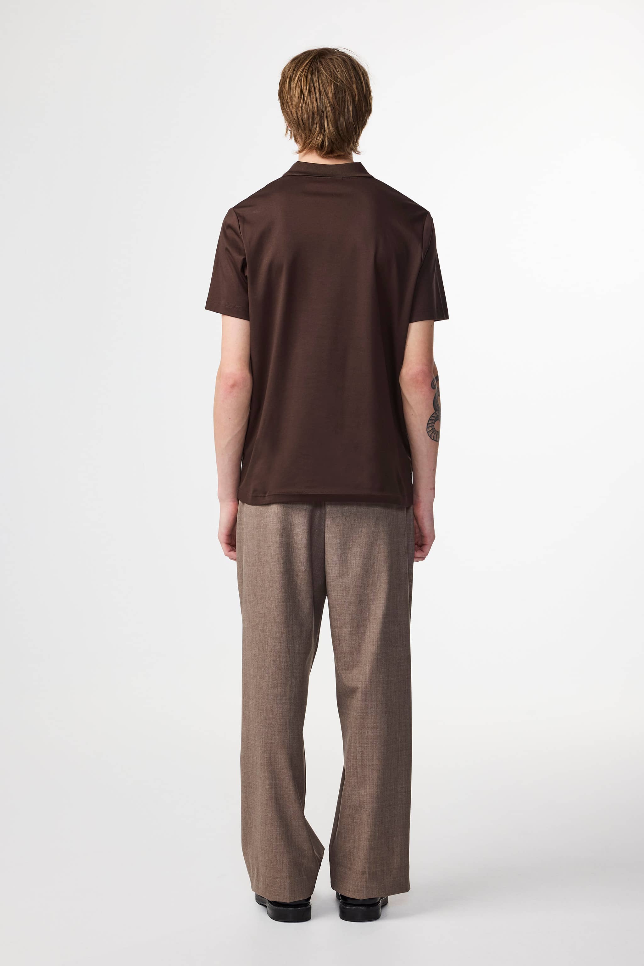 Open-collar polo crafted in smooth organic cotton interlock jersey with a soft, luxurious handfeel. Finished with a flat knitted collar and twin-needle stitching.