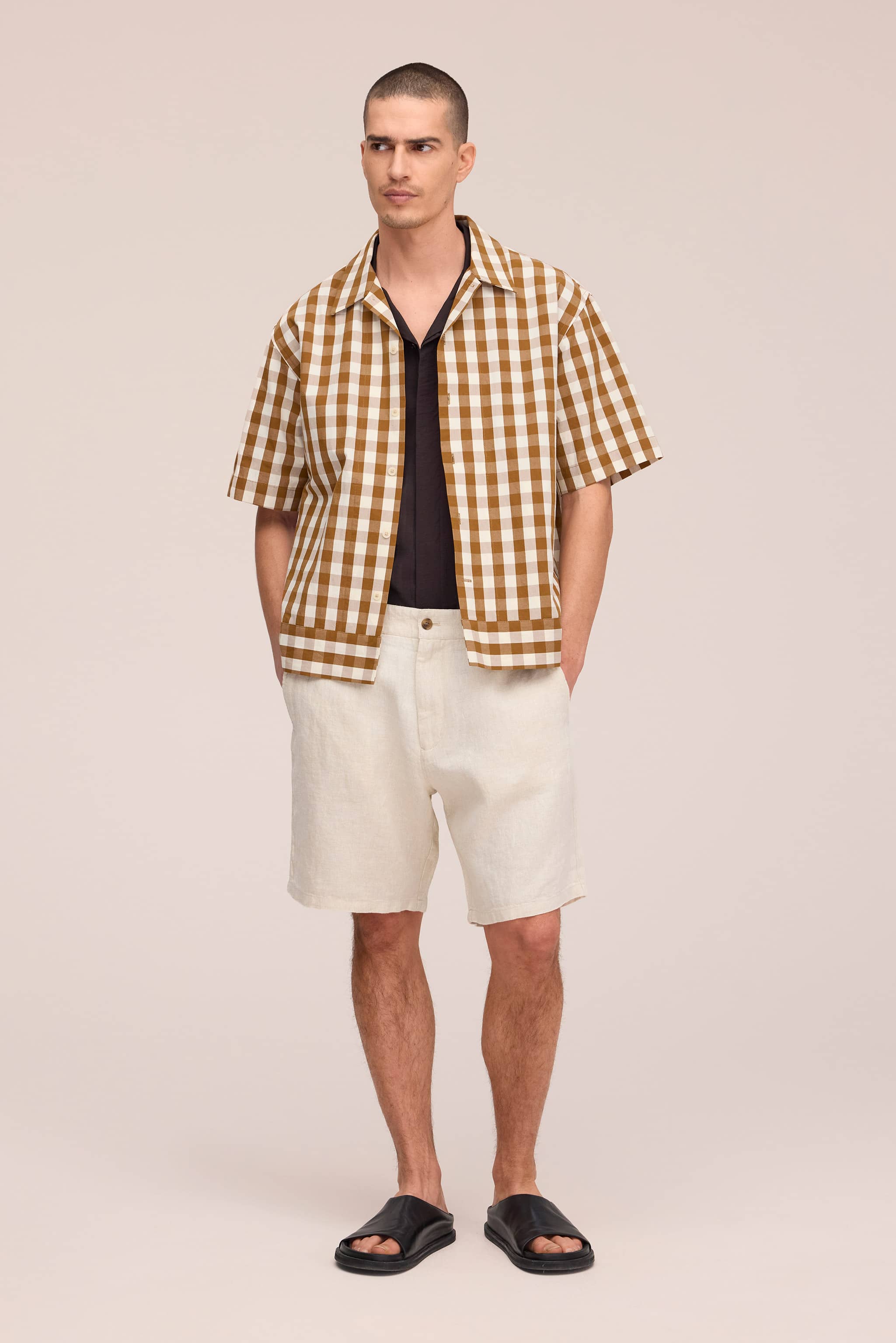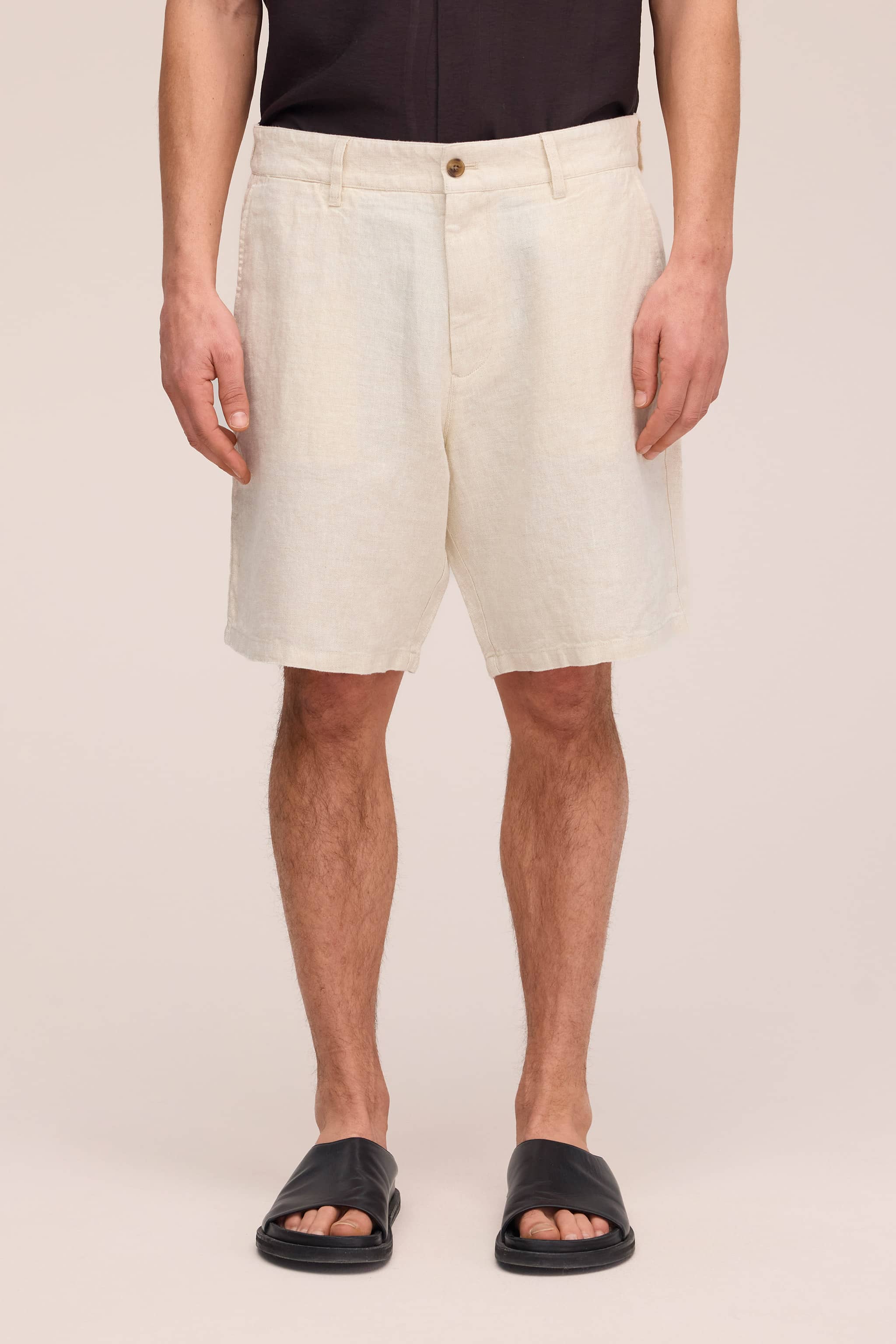 Casual chino shorts crafted from durable European linen in a crisp, dry handfeel. Cut from a plain weave fabric for lasting shape and strength, featuring button closure and welt pockets at the back detailed with NN07 embroidery. A robust yet drapey style designed for a relaxed look.