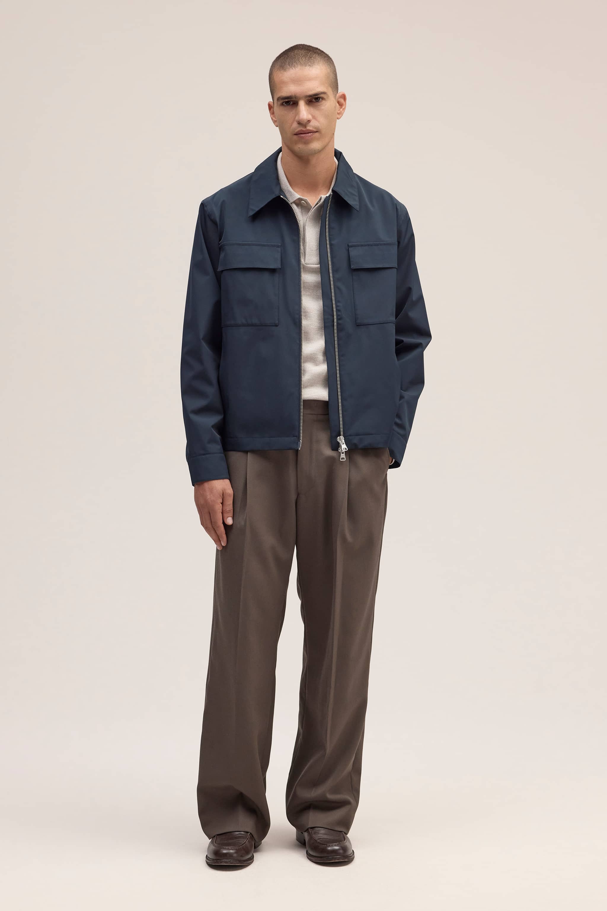 Lightweight technical jacket crafted from recycled polyester-blend fabric with windproof and waterproof properties. Designed with breathable performance features and crisp handfeel, making it ideal for transitional weather in temperatures ranging from 0-5 degrees Celsius.