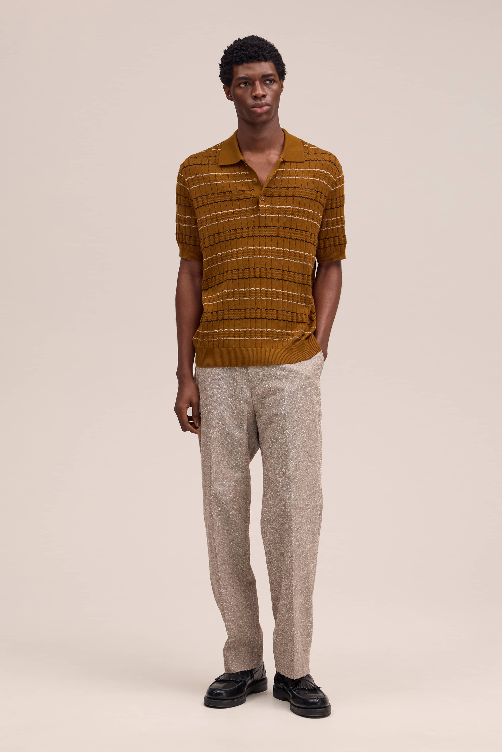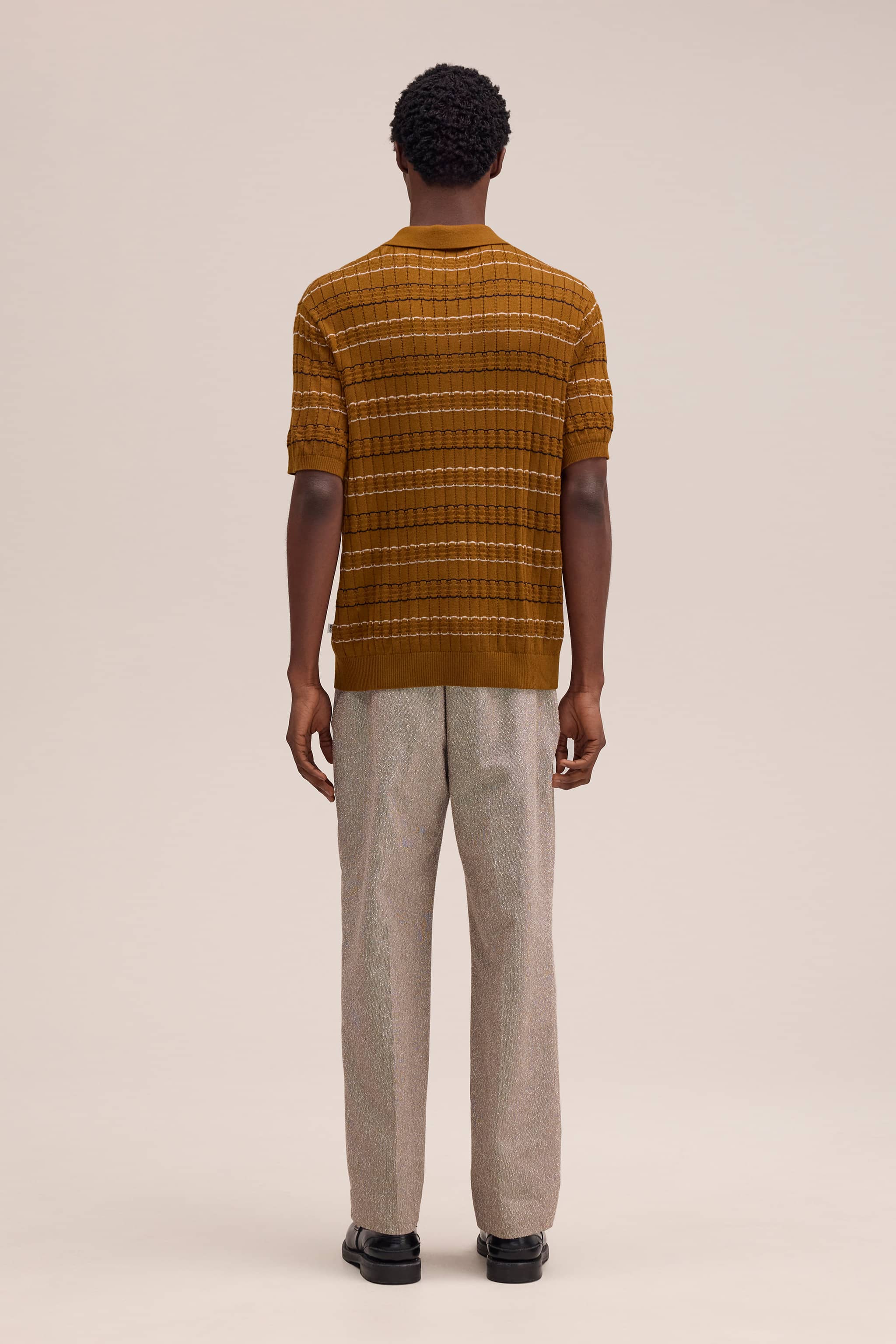 Lightweight striped polo made from wool blend, featuring a pointelle stitch for a soft and breathable finish. Detailed with elegant river shell buttons.