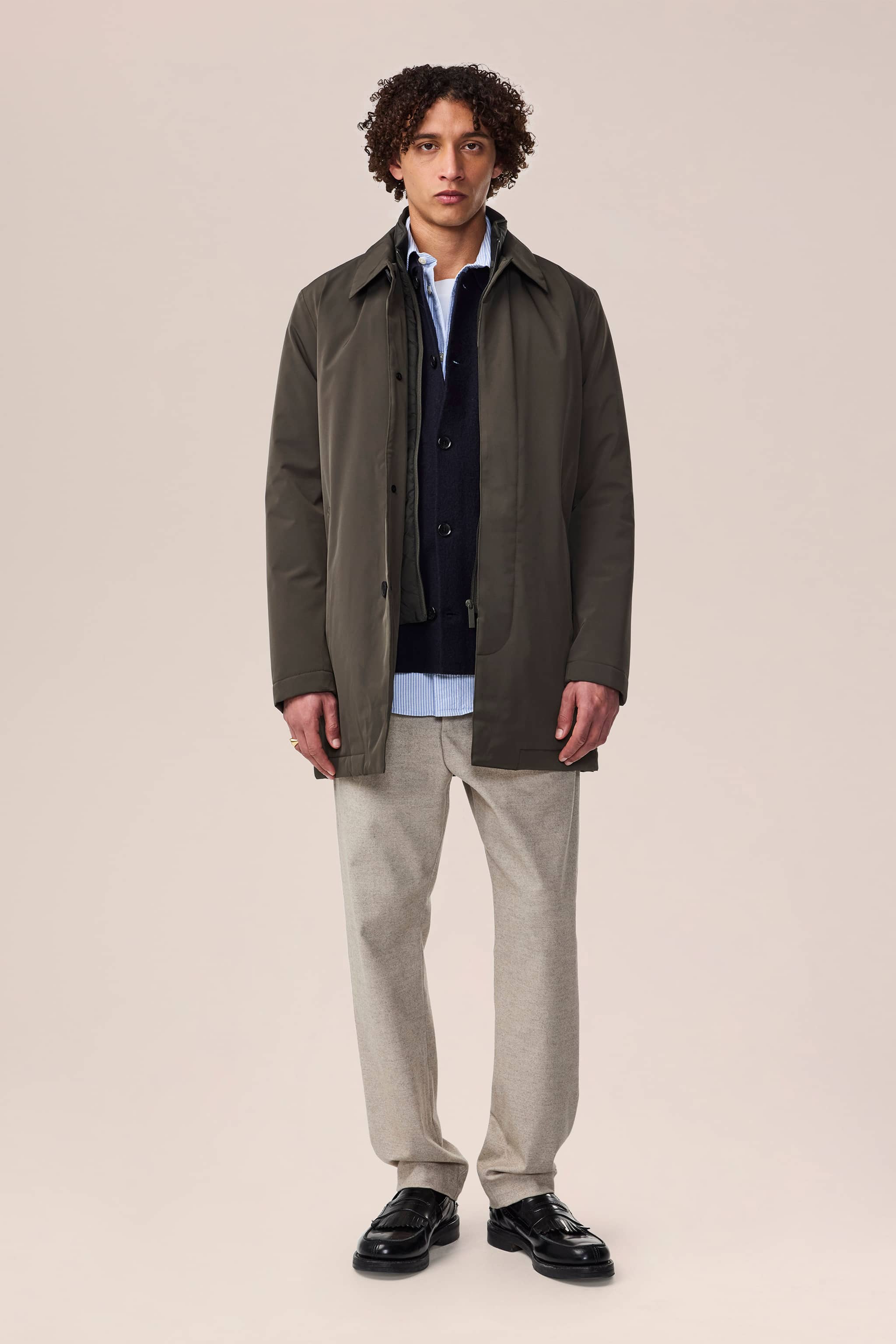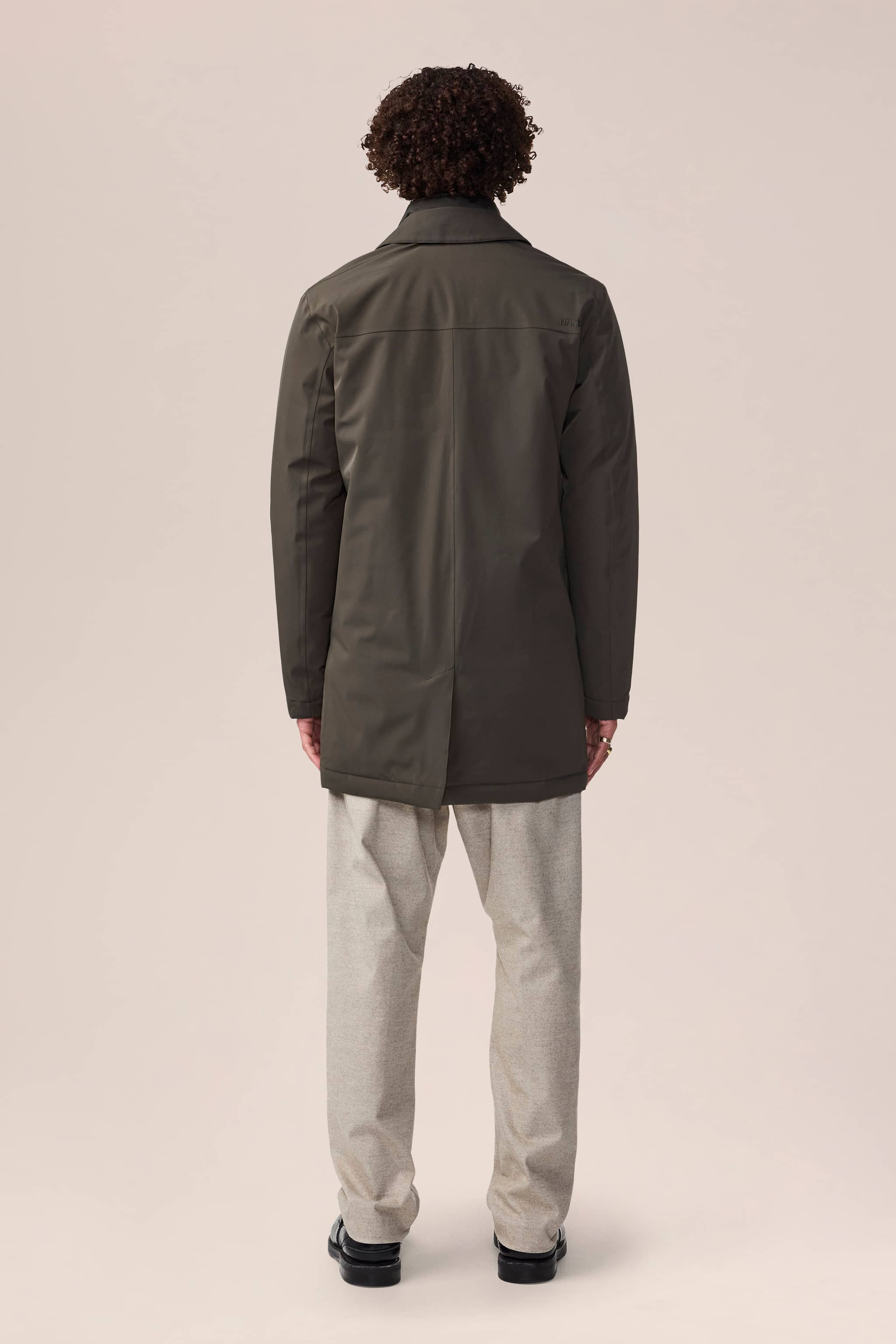 Transseasonal trench coat crafted from a recycled polyester-blend stretch twill with a crisp handfeel. Features 10,000mm waterproof protection and fully seam-sealed windproof construction with ultra-breathable properties. Suitable for temperatures from 0°C and above with its Primaloft® Gold insulation and microfleece-lined pockets. Includes an inside layer that can be zipped up while the front closes with buttons.