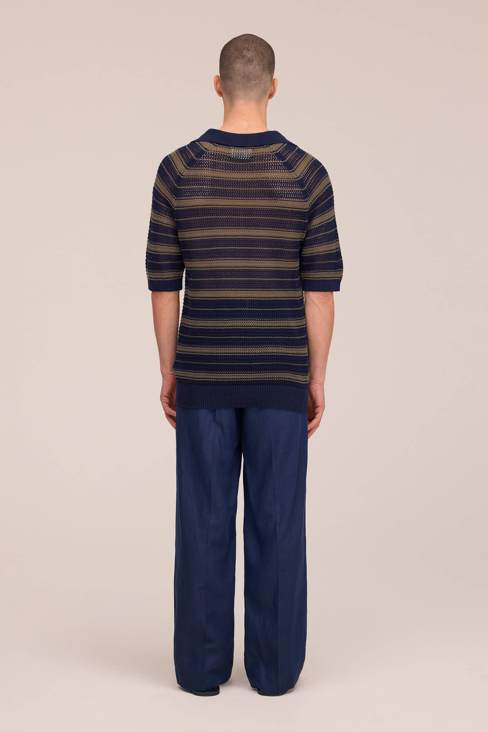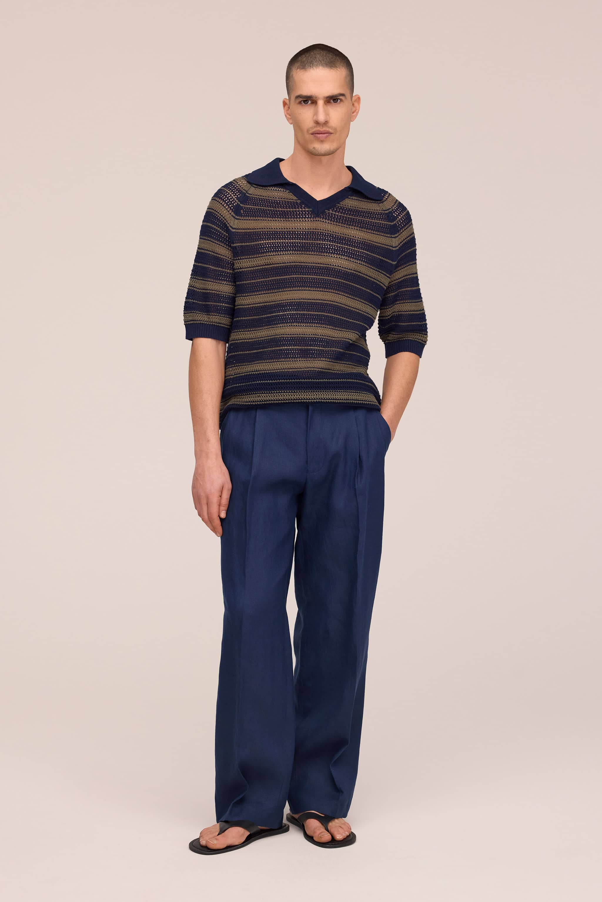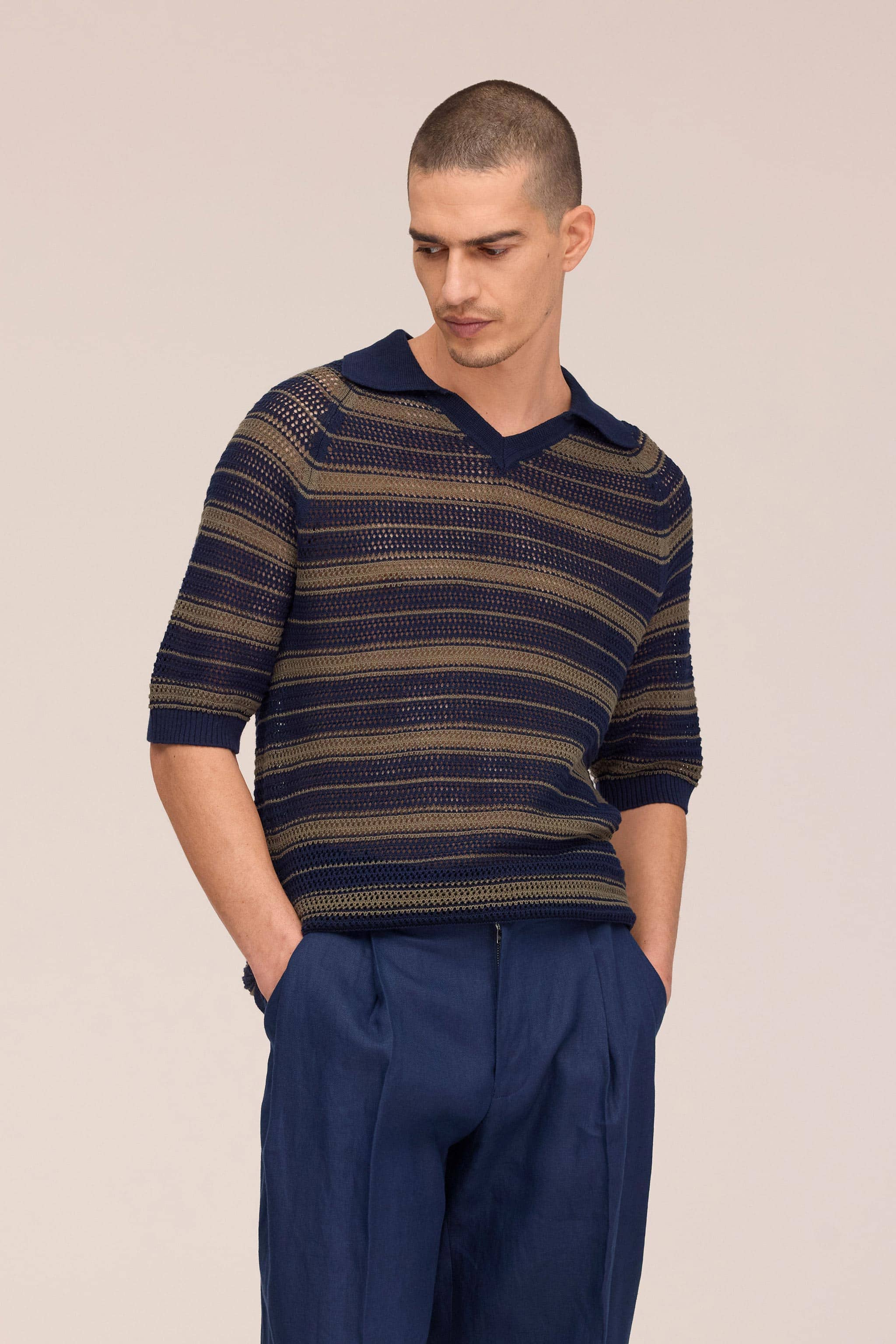 V-neck polo knit in a soft linen-cotton blend featuring an open pointelle texture throughout. Designed with intricate textured stitching and a delicate, drapey handfeel that offers exceptional comfort.