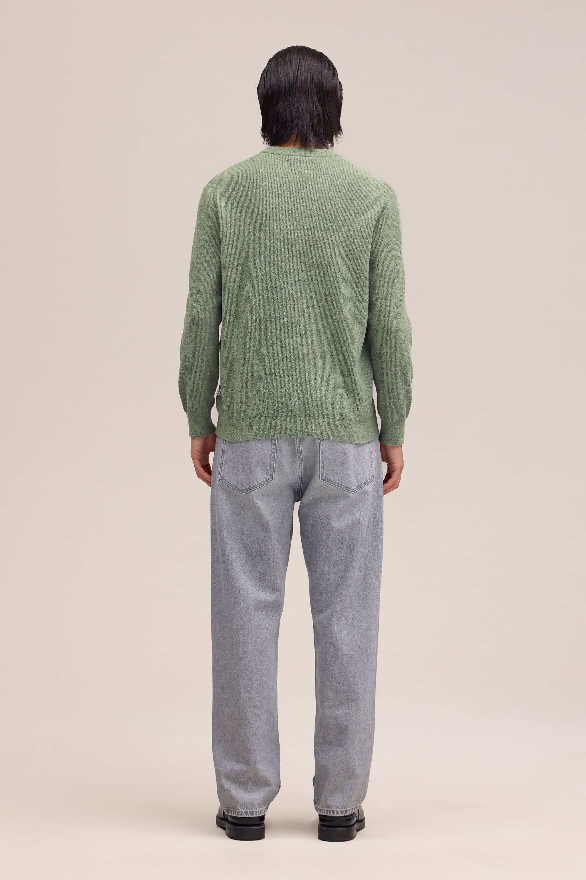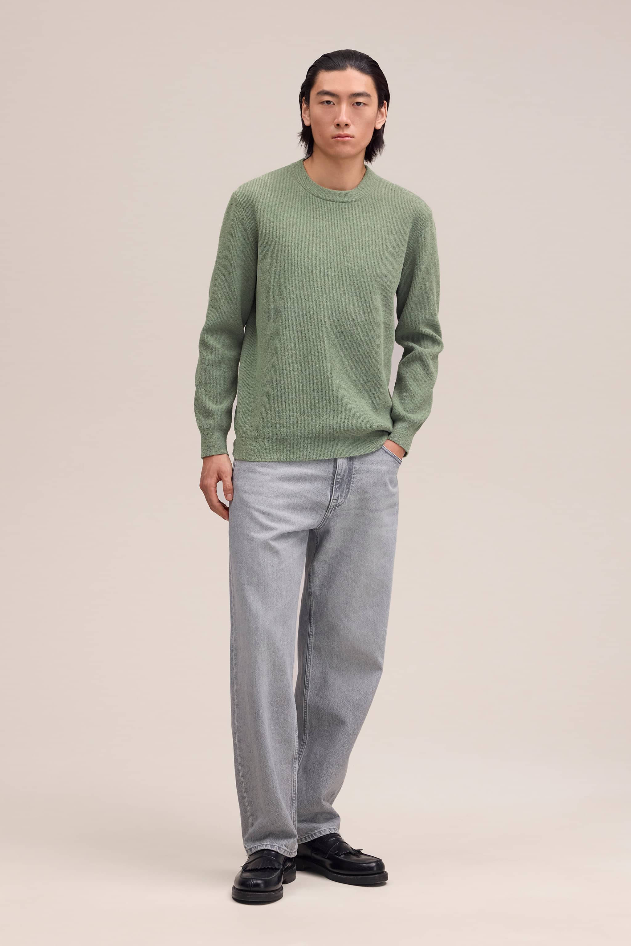A soft crewneck sweater crafted in a lightweight polyester blend, designed with a neat rib and fashion detailing along the arm and neckline.
