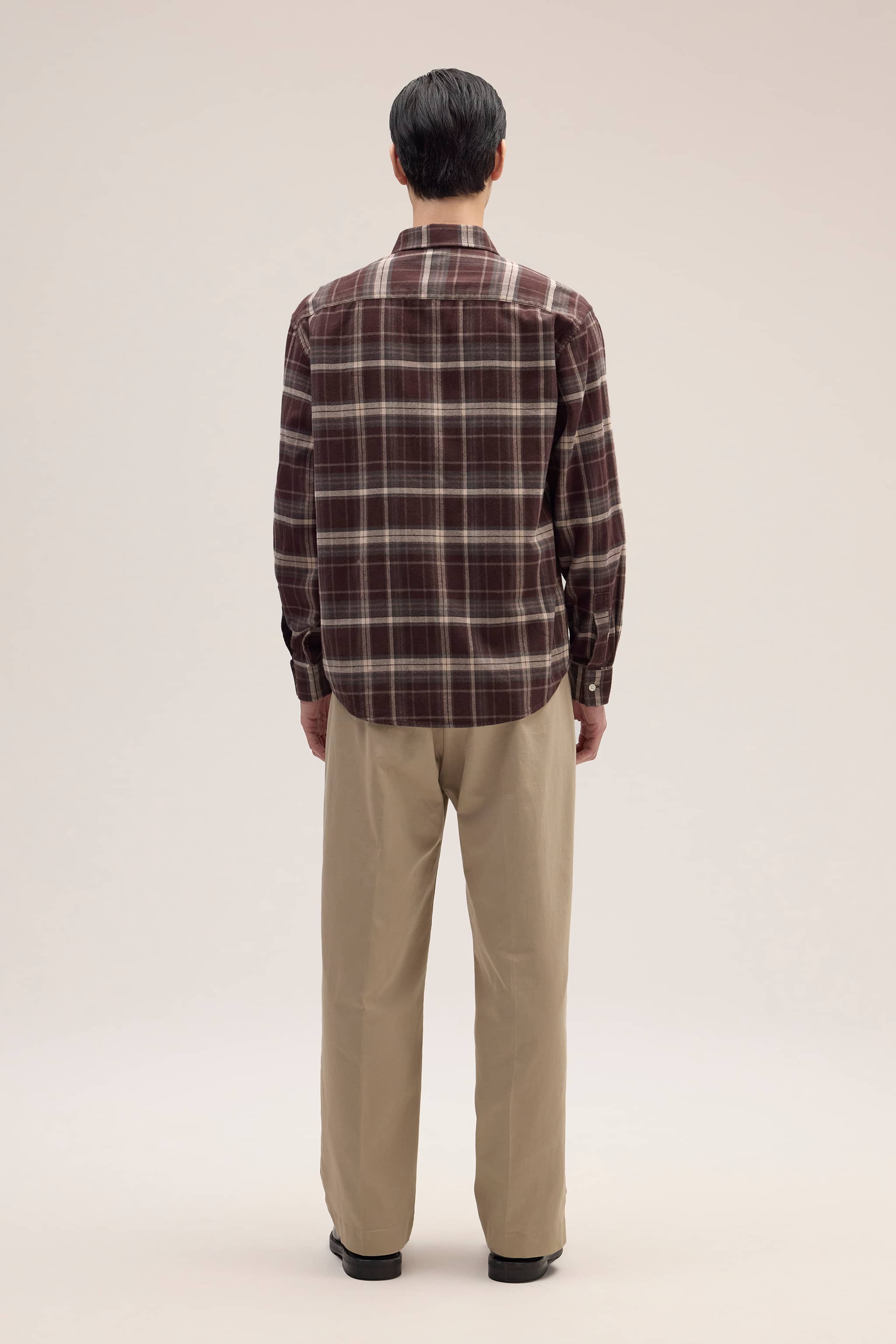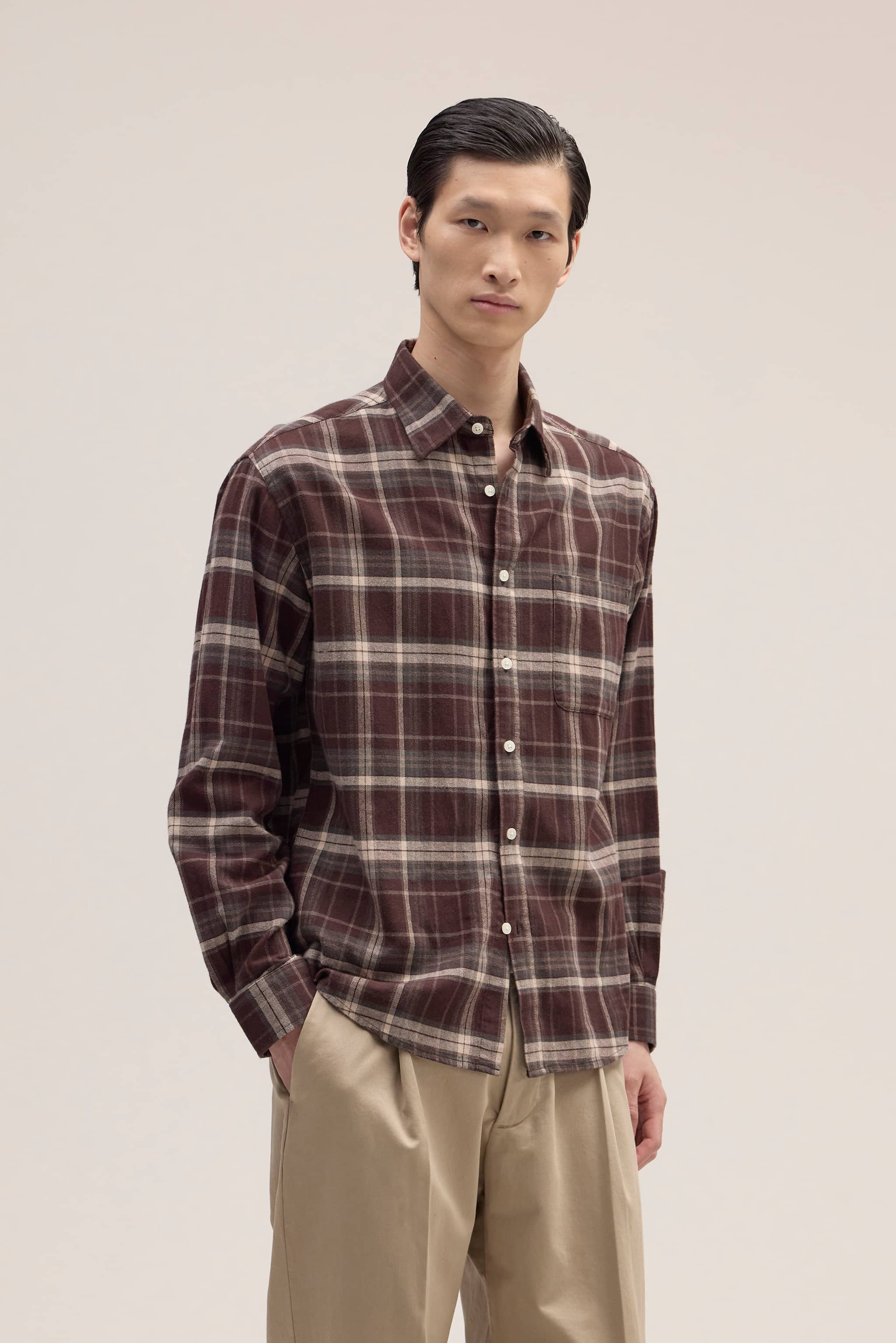 Button-up shirt made in soft cotton and woven in a flannel twill weave. Designed with a single patch pocket and rounded hemline.
