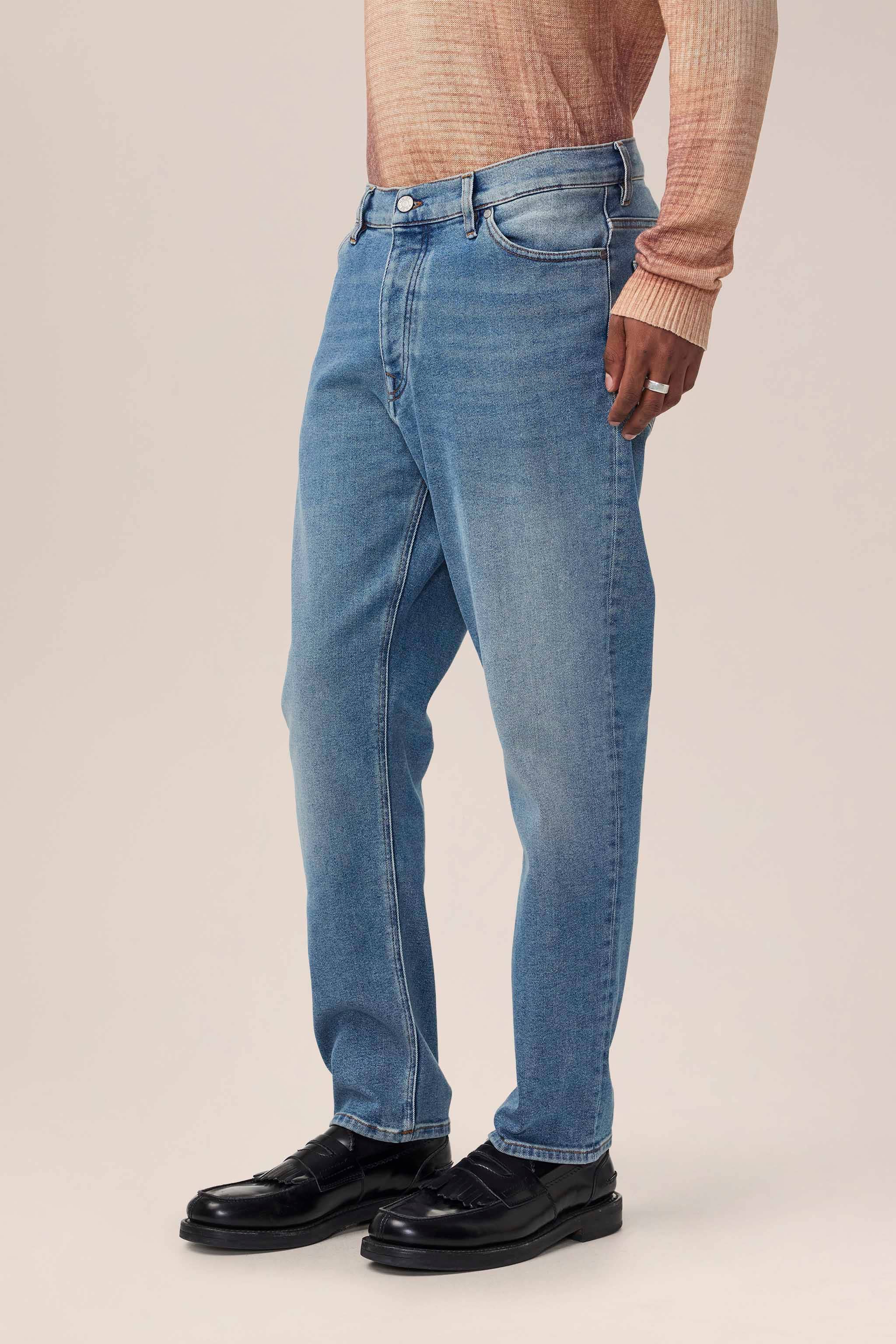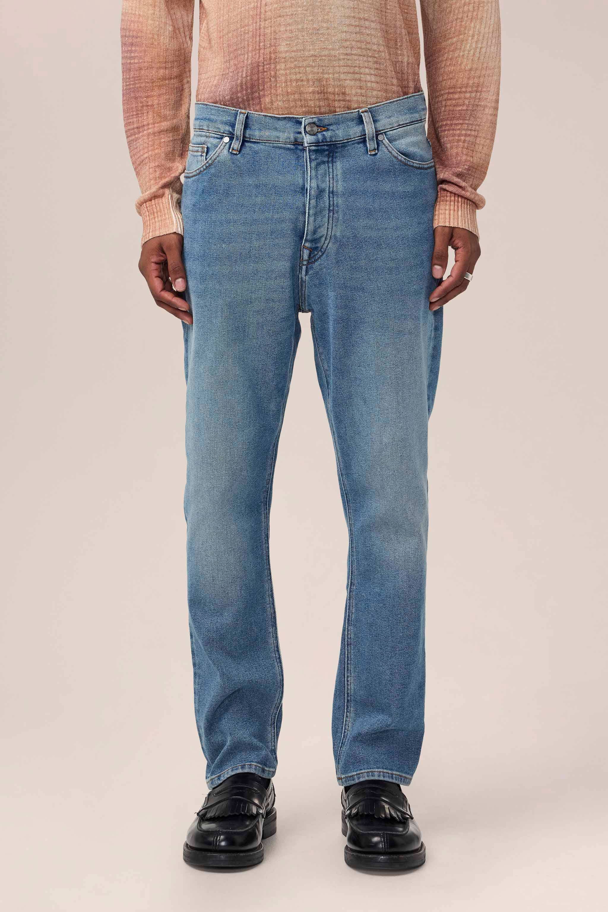 Regular fit jeans with tapered leg, crafted from a structured 13.50 oz midweight cotton blend. Features an enzyme and bleach rinse for a subtle whiskering and distressed sanding effect, along with five-pocket styling. Finished with a matte silver metal button closure and matching rivets, plus blue embroidery stitching along the back pocket.