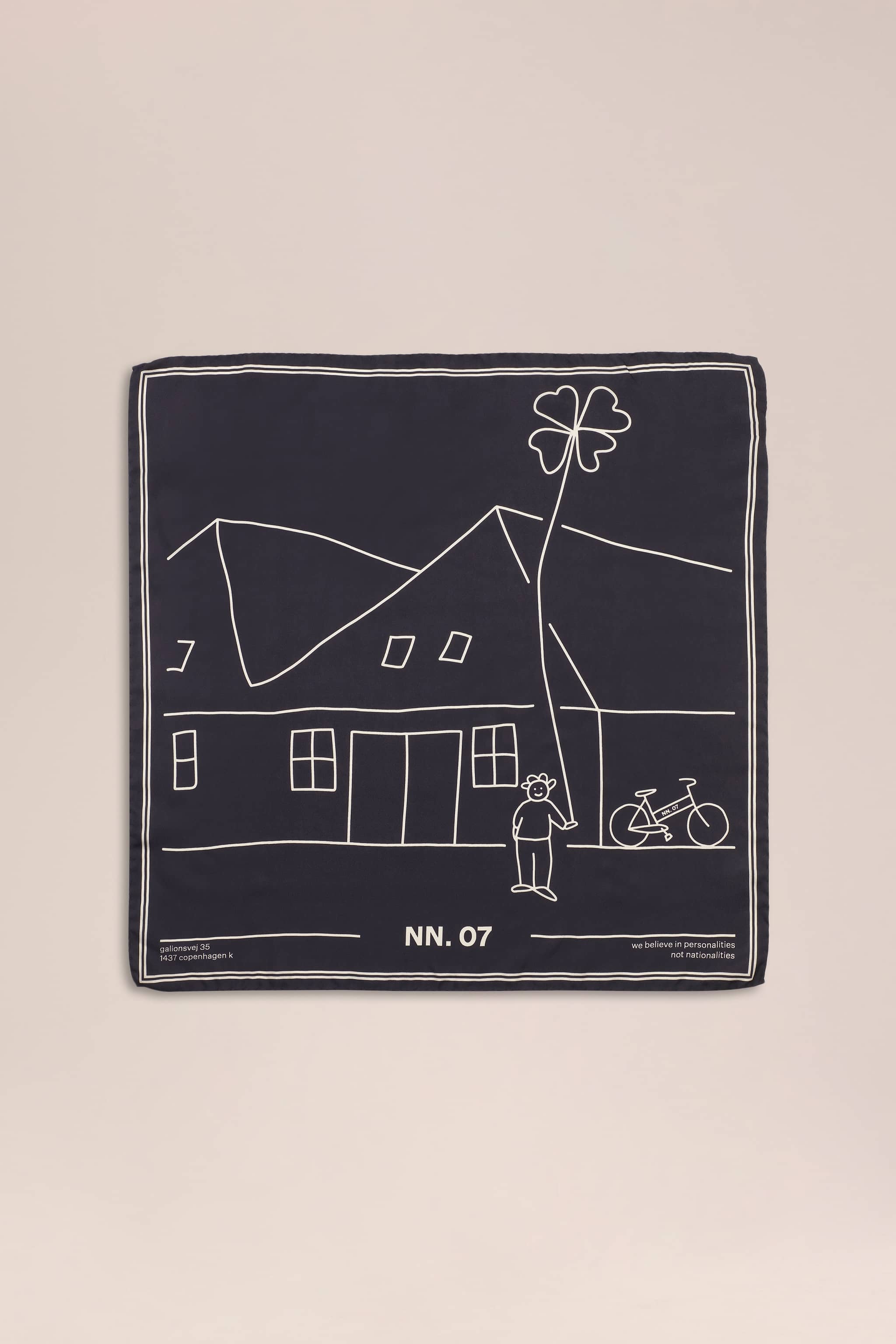 Luxurious silk scarf made in Italy with a super light weight and elegant drape, whether twisted or knotted. Features a custom print of the NN.07 headquarters in Copenhagen for a playful yet refined look.