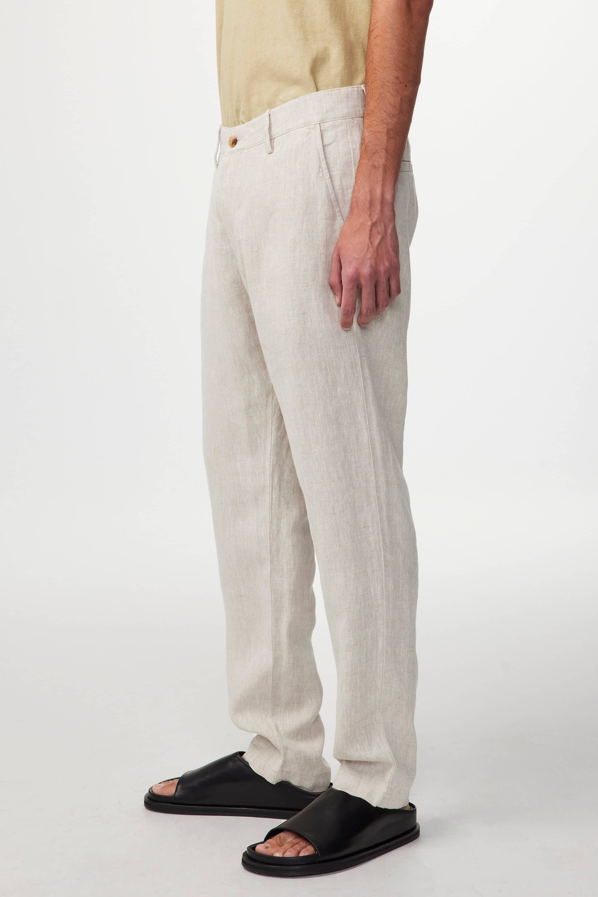 Slightly tapered chinos crafted in a soft, lightweight linen fabric. Designed with corozo buttons and twin side seam pockets.