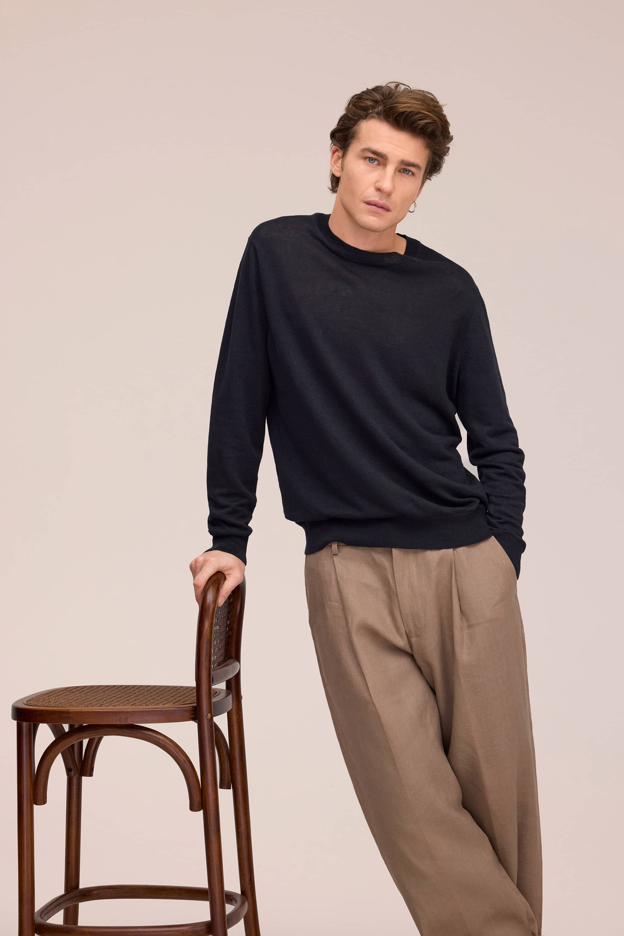 Crew neck knit sweater crafted in super fine European linen with a plain jersey finish. The soft, fine linen fabric offers a light and breathable feel, perfect for classic everyday styling.