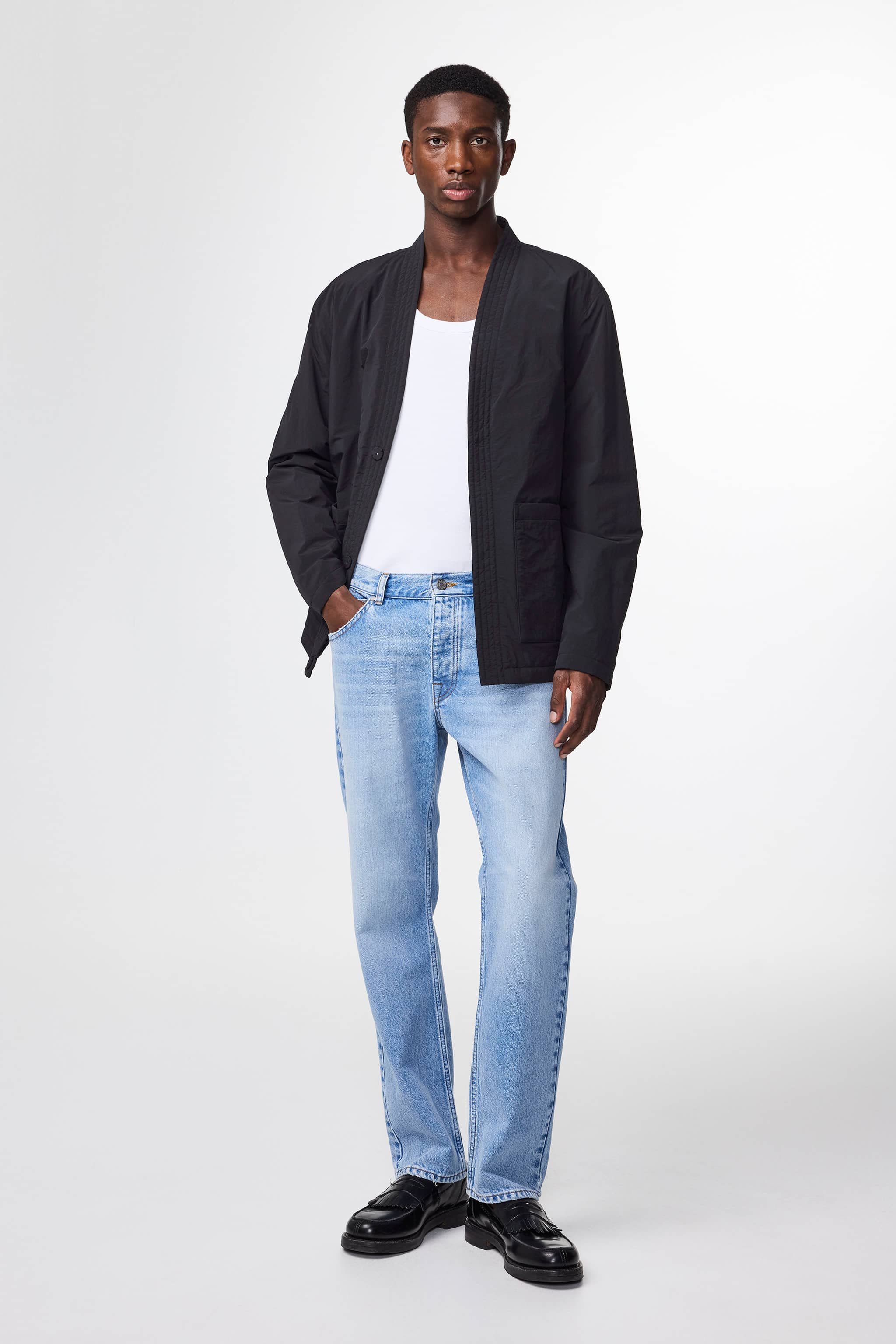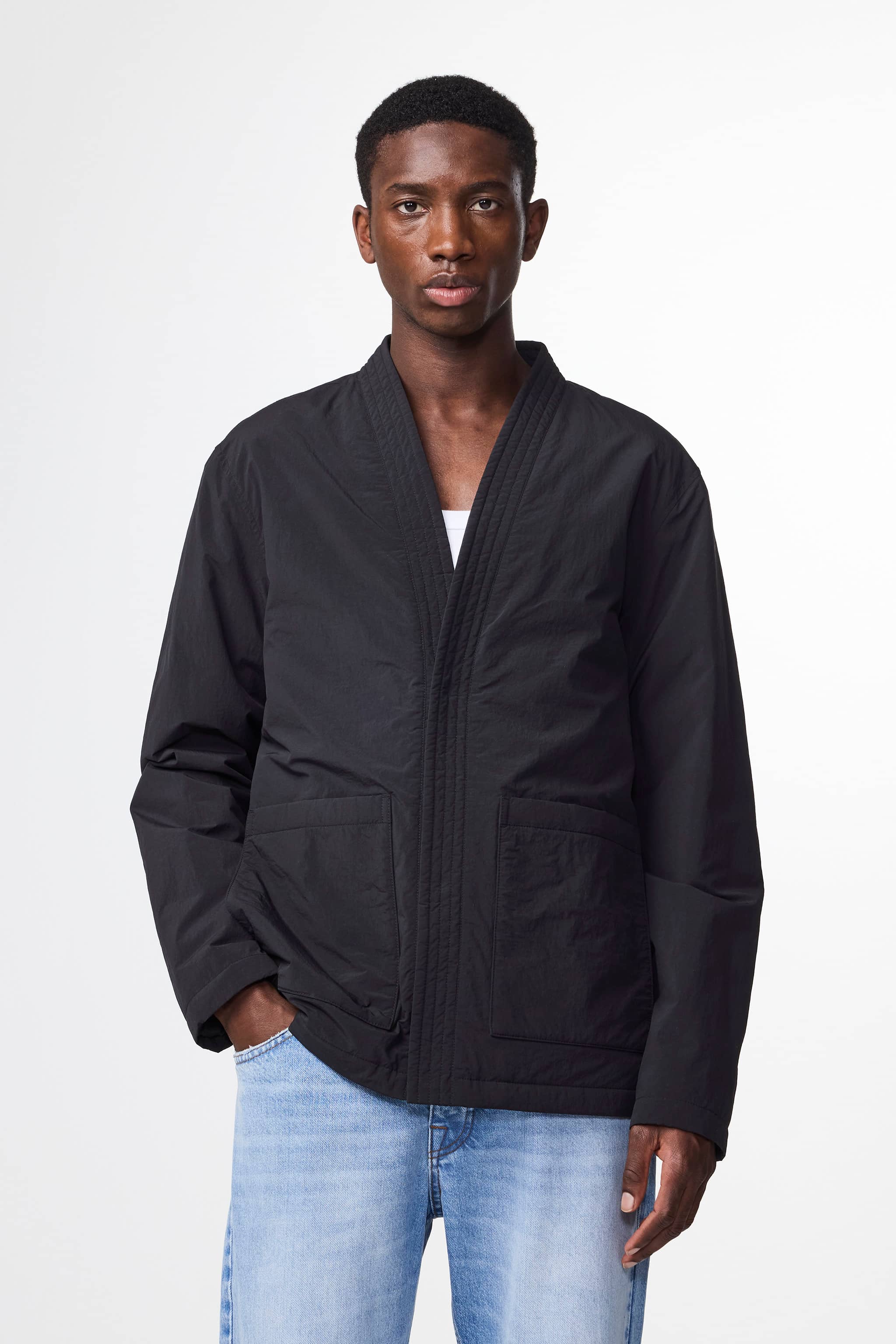 Kimono-inspired hybrid crafted in a recycled polyamide with PrimaLoft padding, side seam pockets, and metal snap buttons.