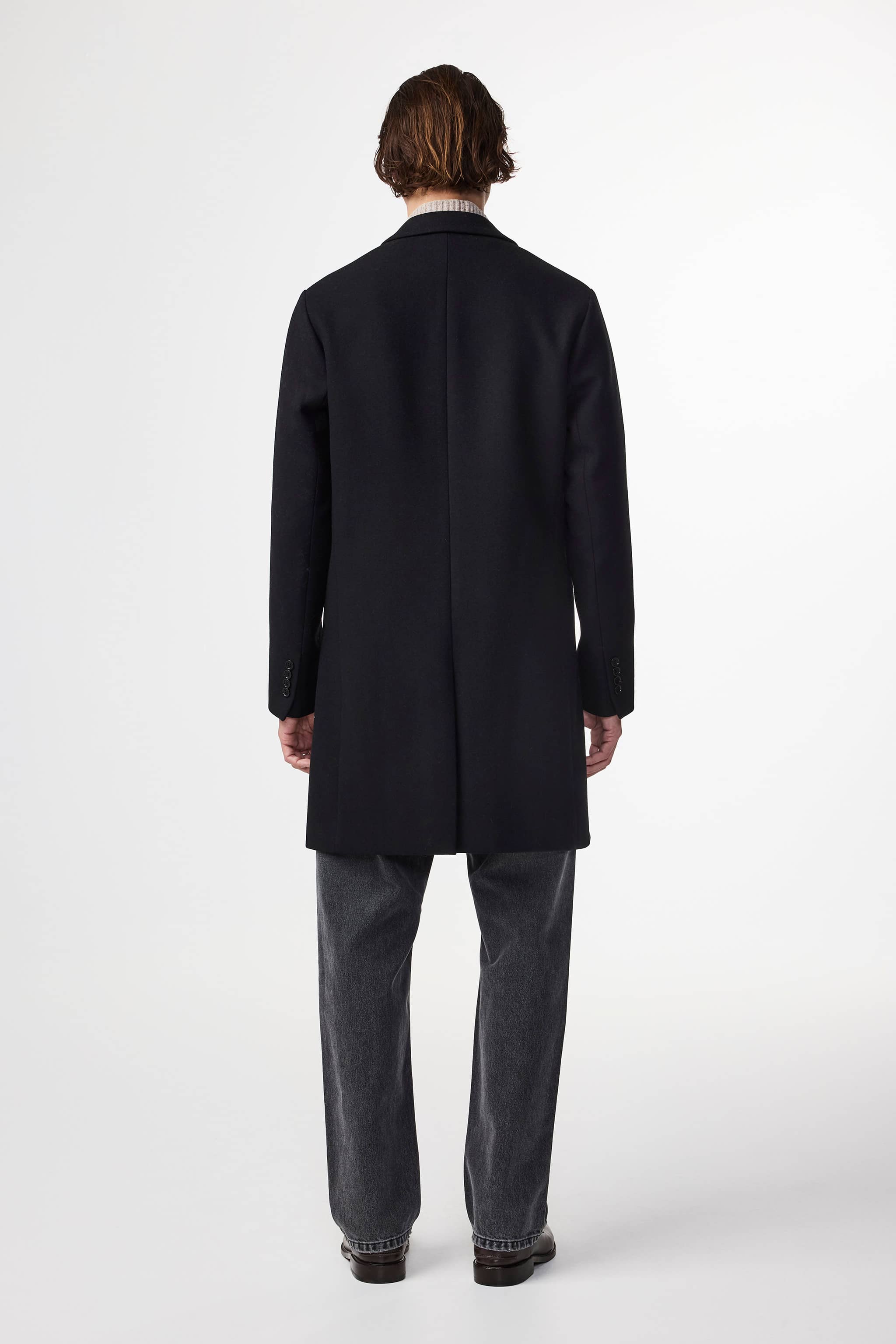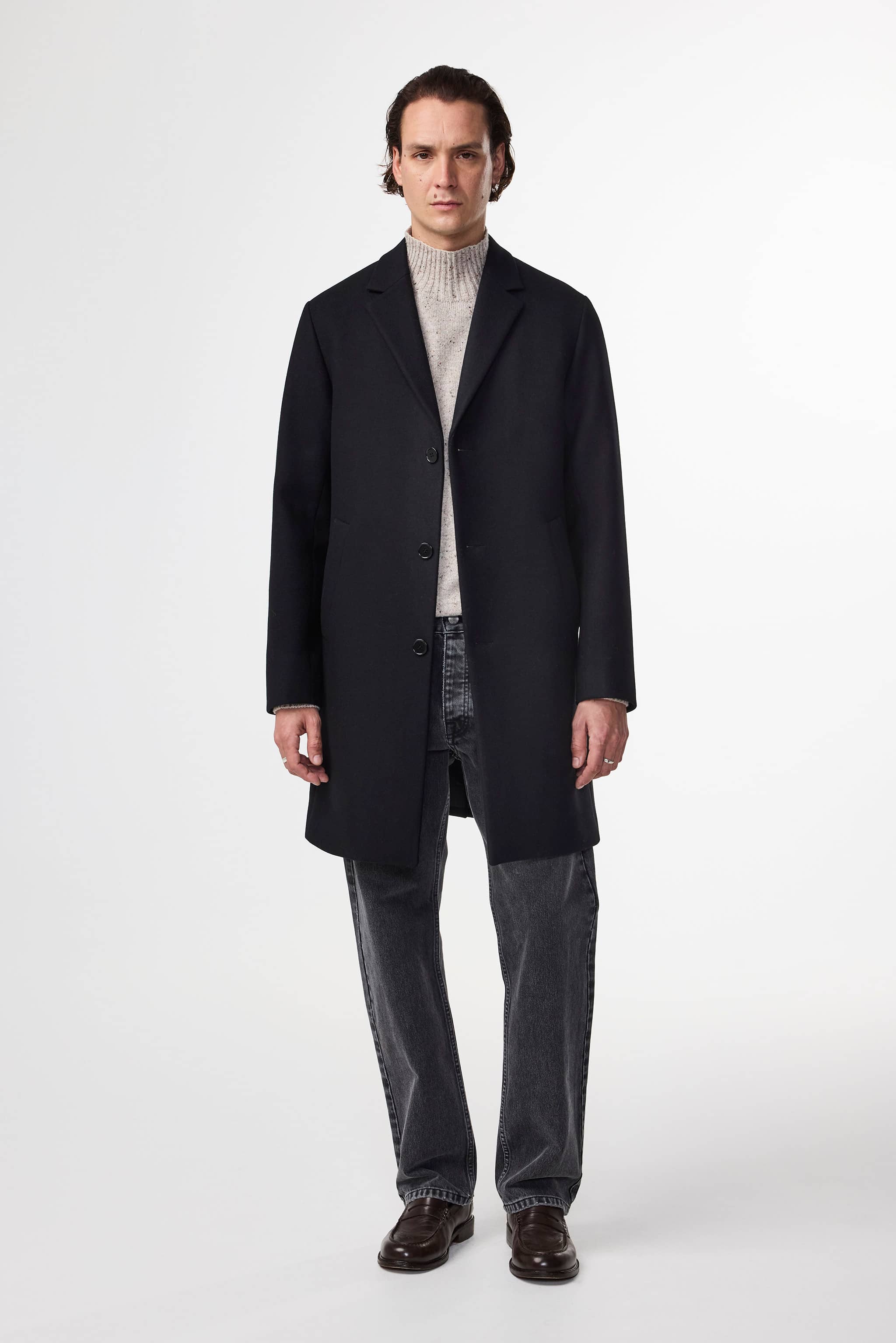 A classic mid-length coat, fully lined and crafted from a soft and heavyweight virgin wool blend. Features slanted side pockets and a sharp v-neck design.