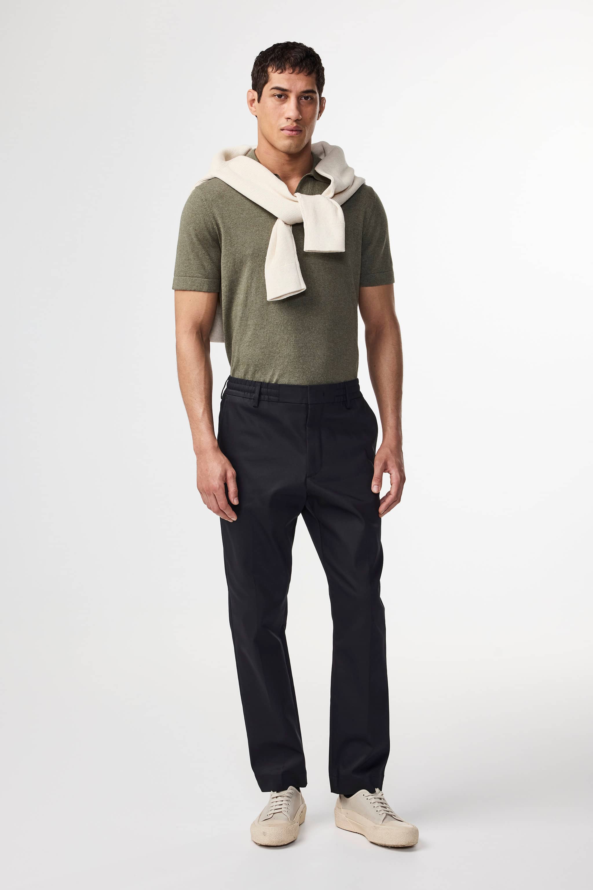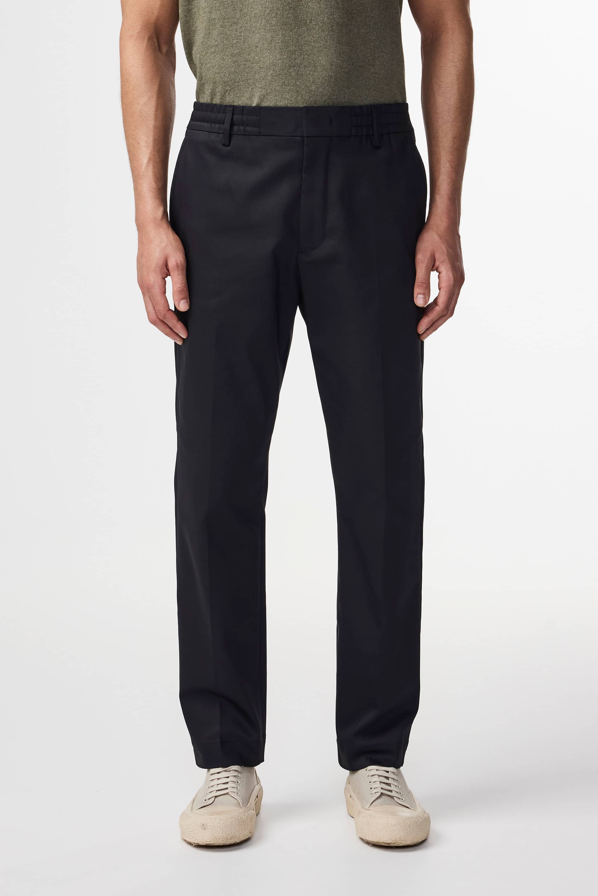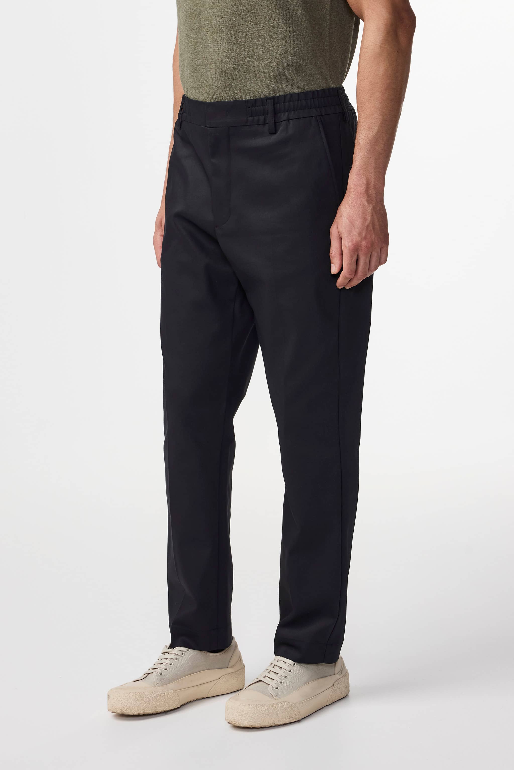 A pair of regular fit dress trousers with a tapered leg, crafted from a lightweight, 230 g/m2 cotton twill blend with a touch of stretch for added comfort. The trousers have a drawstring closure, an elasticated waistband, and are finished with a press fold and zip fly.