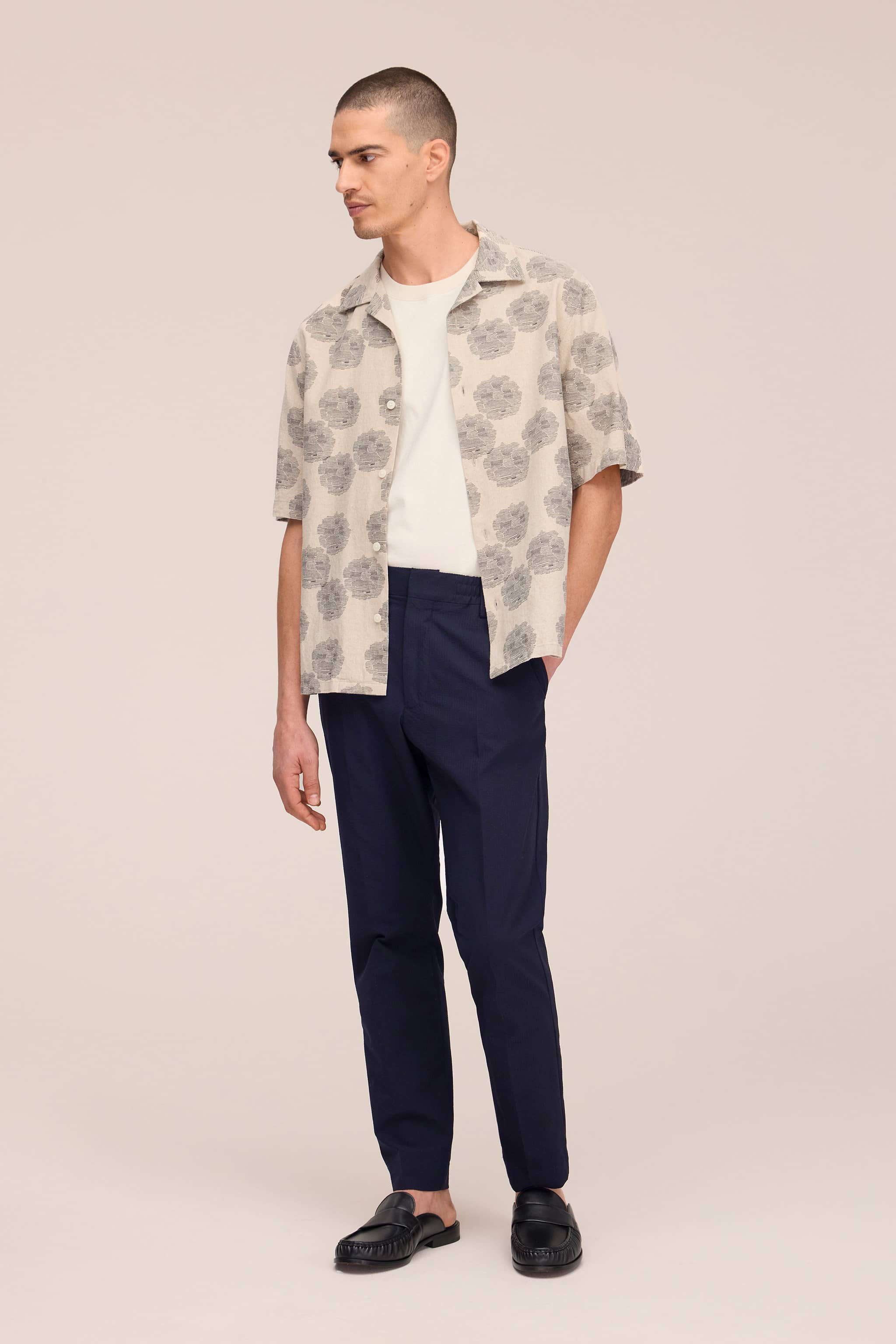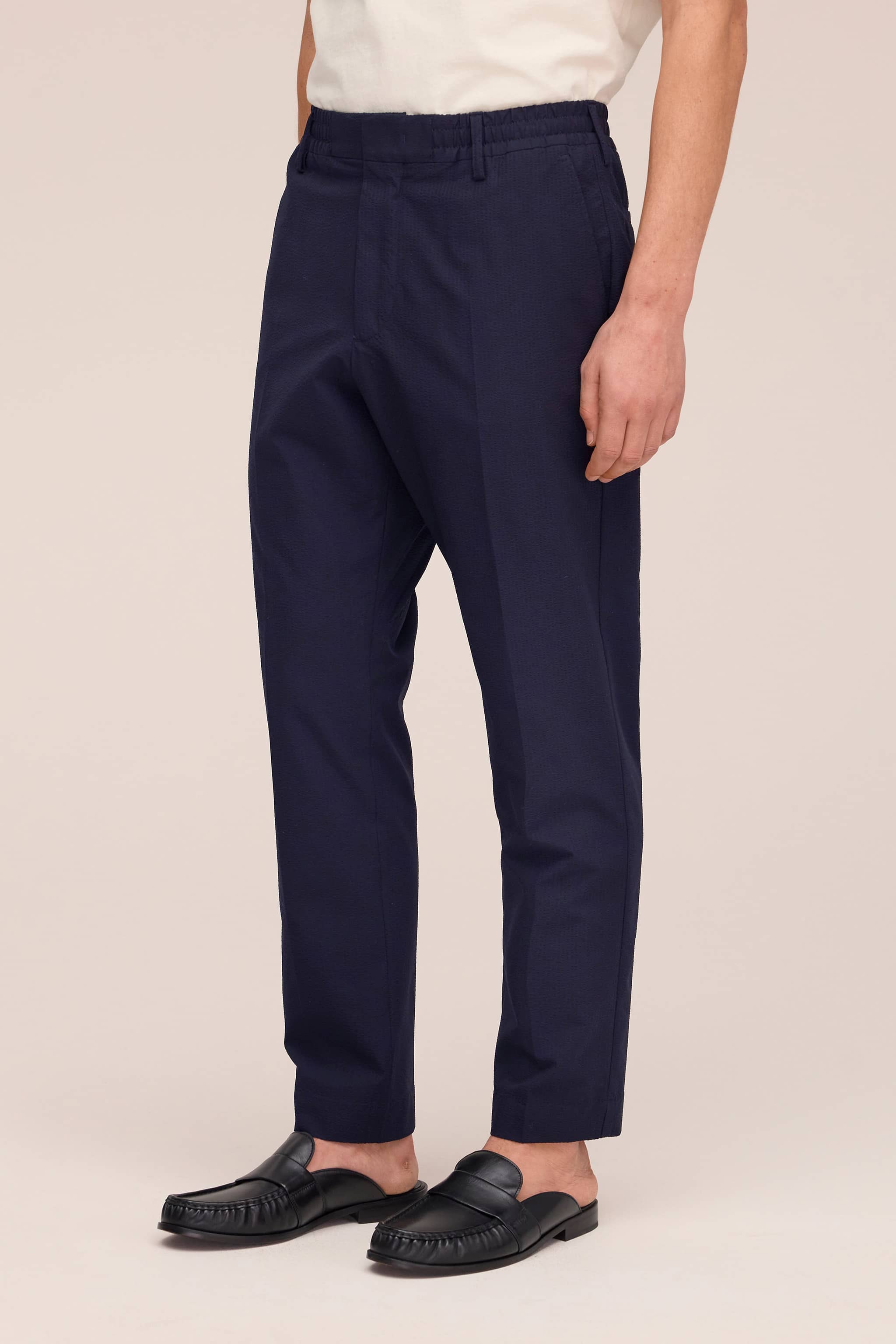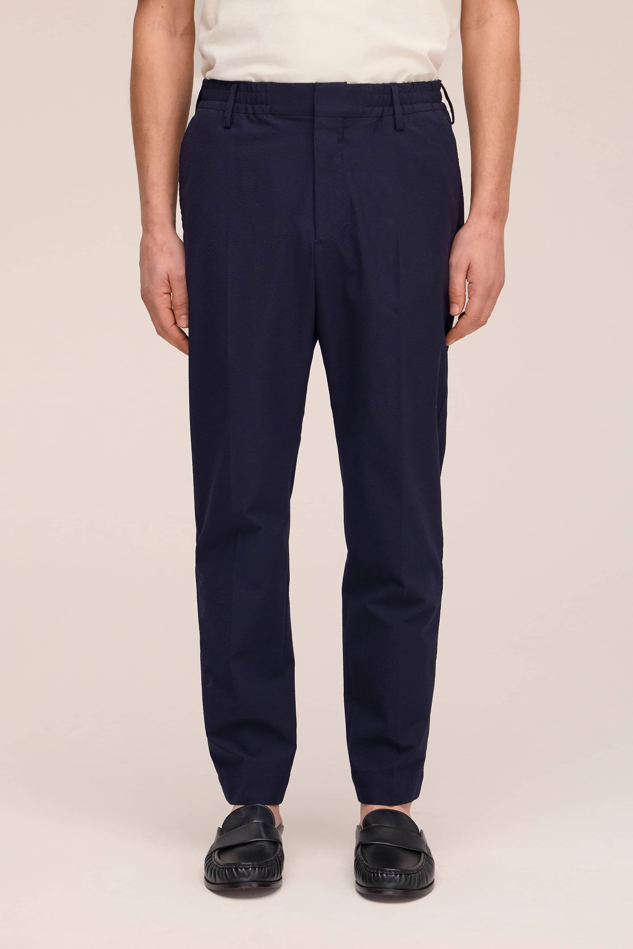 Regular fit trousers with a tapered leg in lightweight seersucker with a crisp, textured handfeel. Designed with an elasticated waistband, topstitching, and hook and bar closure for structured comfort.