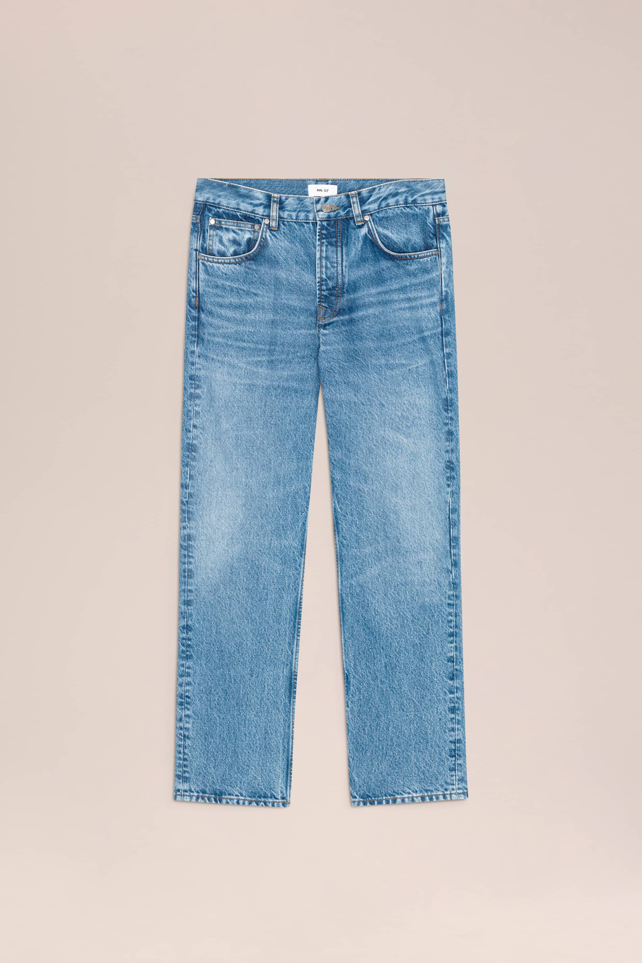 Regular, straight-leg jeans crafted from bleached, midweight 12.50 oz organic cotton denim.
