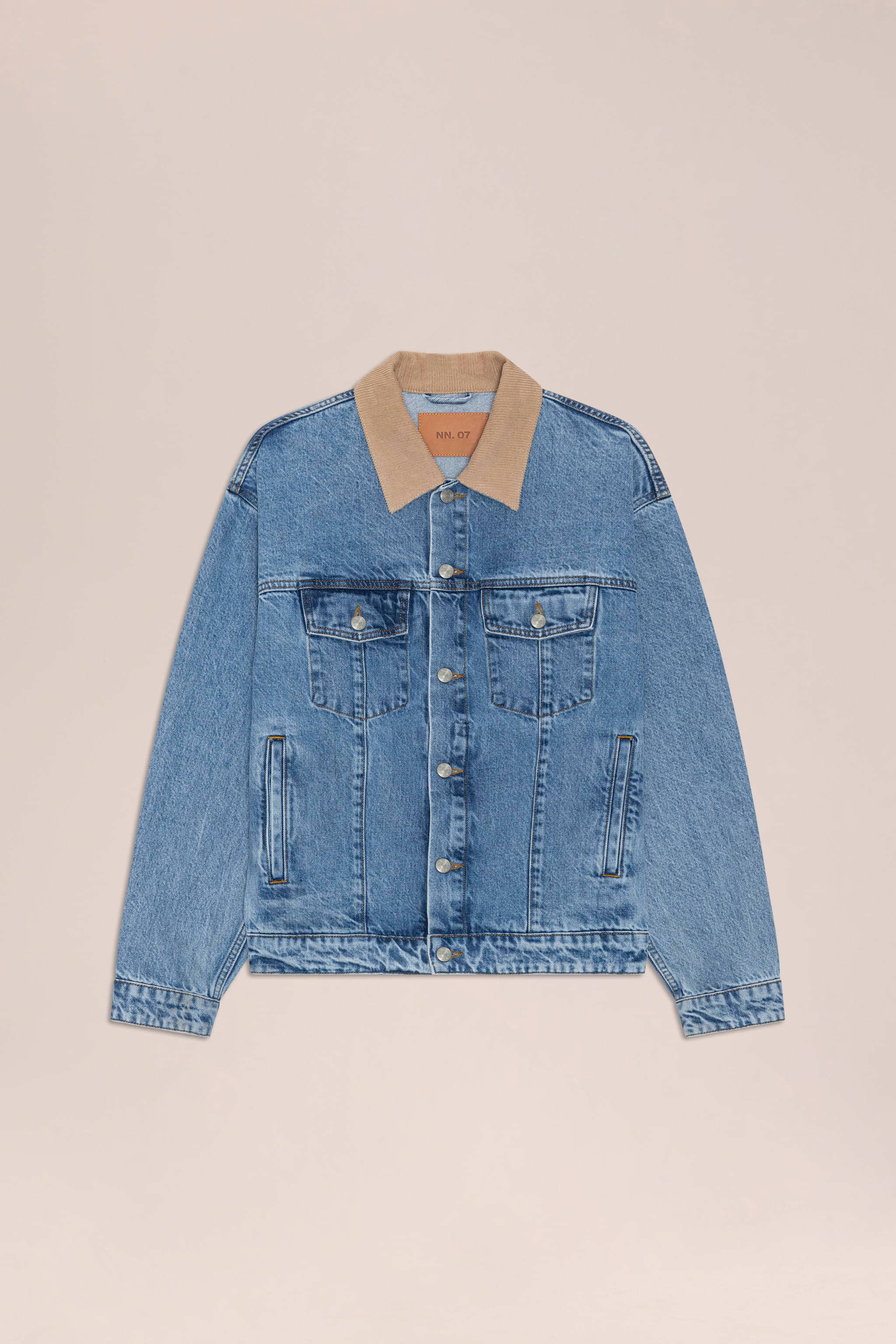 Hybrid denim trucker jacket in heavy organic cotton with corduroy collar.