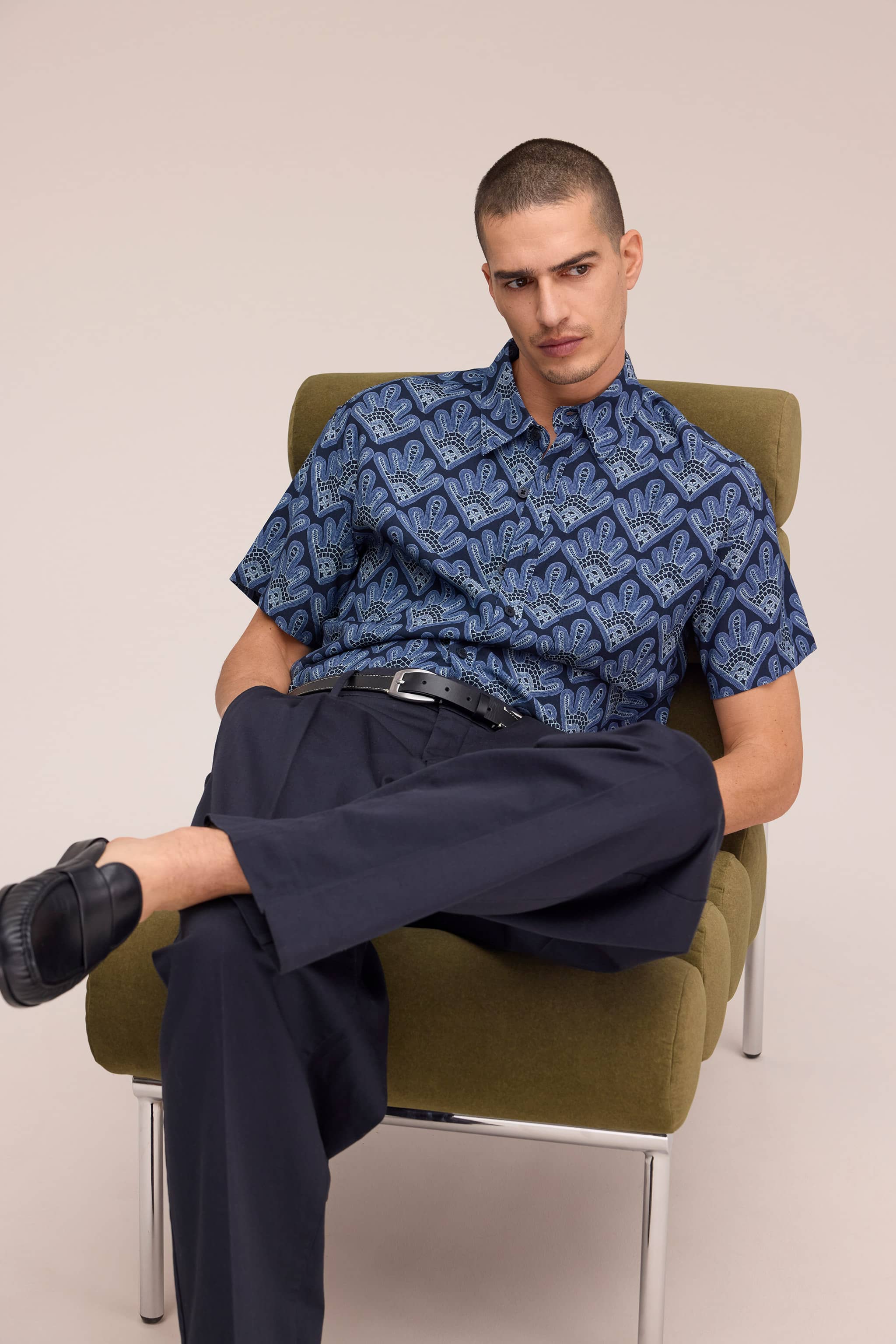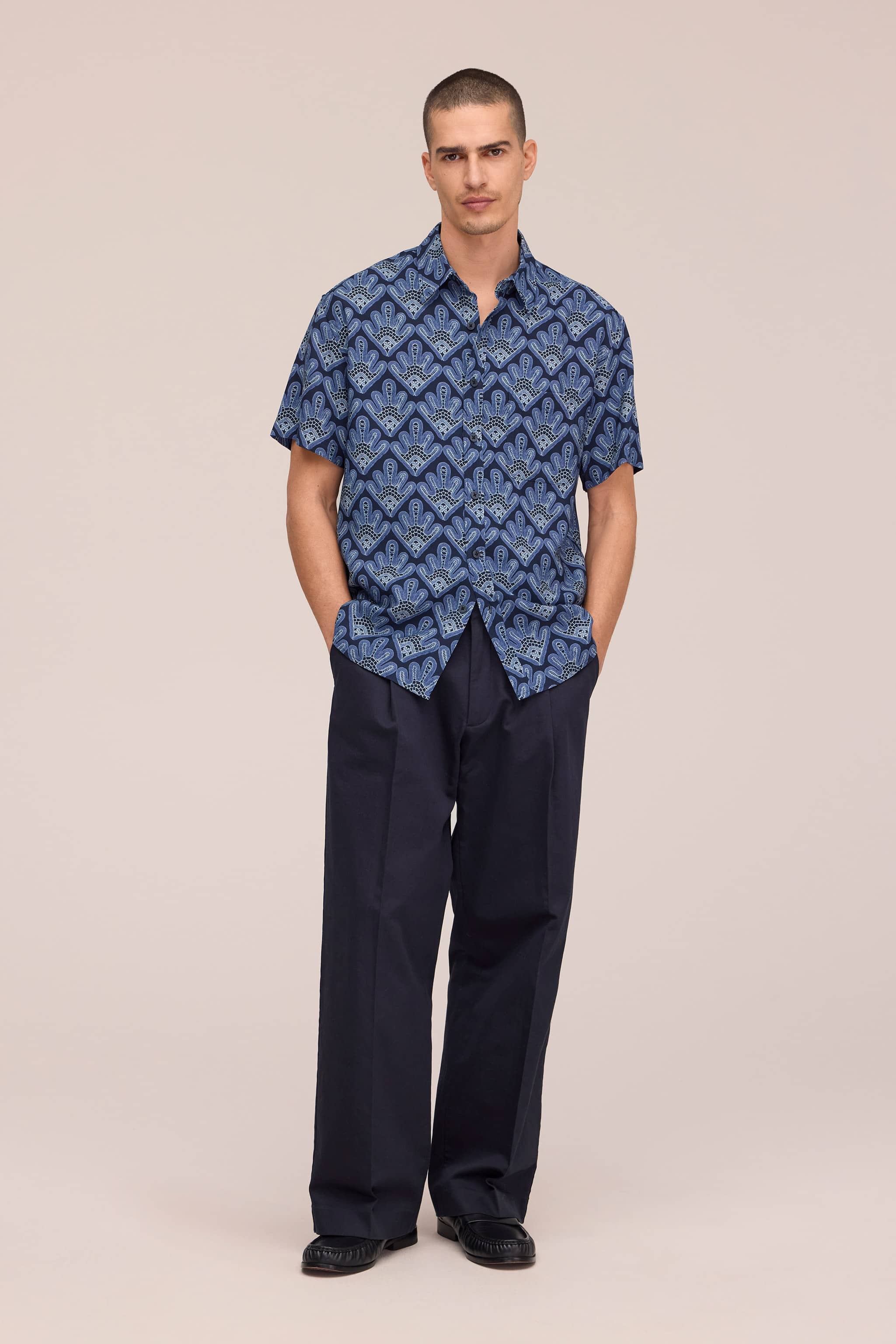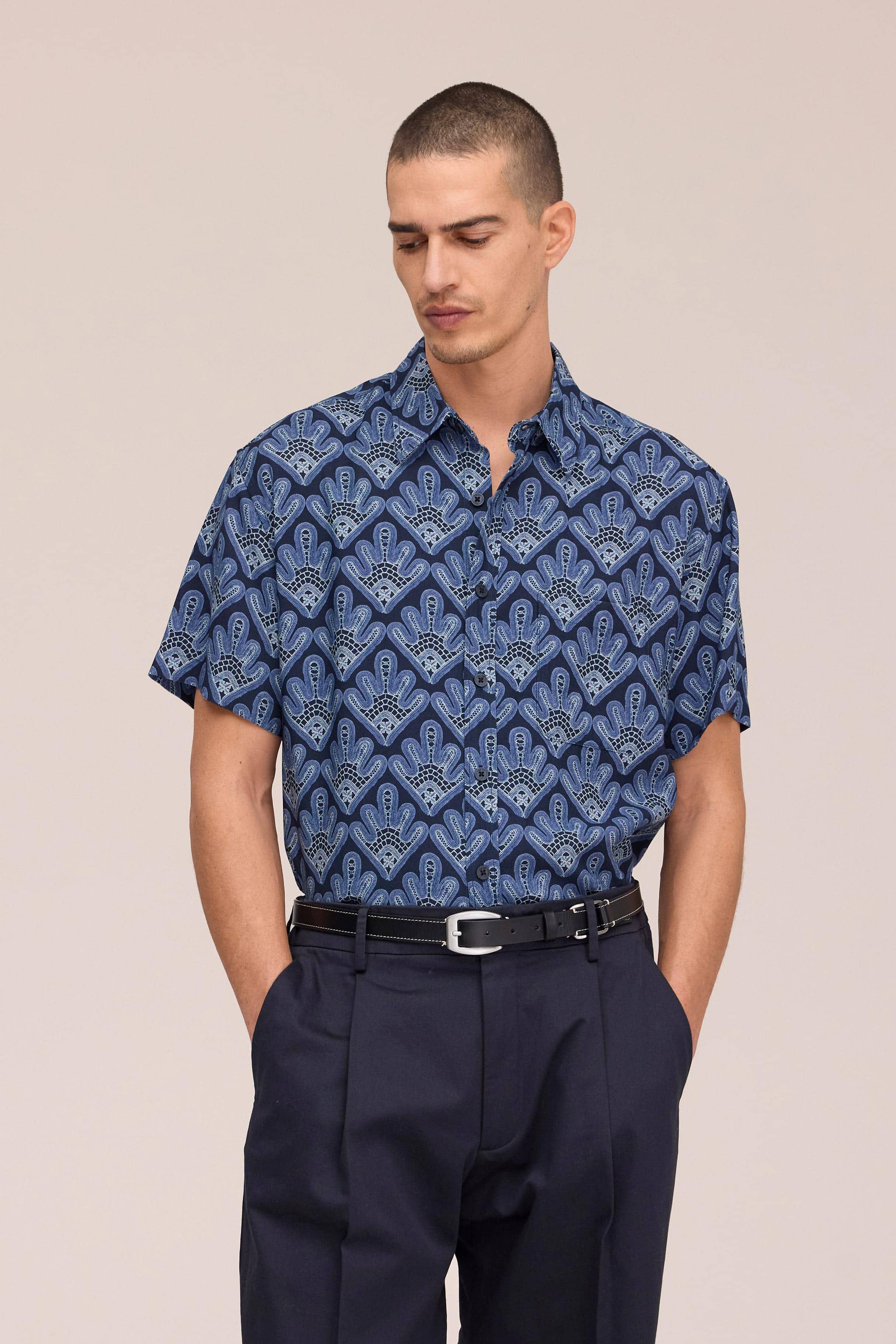 Short sleeve shirt crafted from viscose with an exclusive all-over digital print. Features a relaxed silhouette with sleeves positioned slightly off the shoulder and a curved hemline for a contemporary look. Soft and drapey handfeel with centre front button closure.