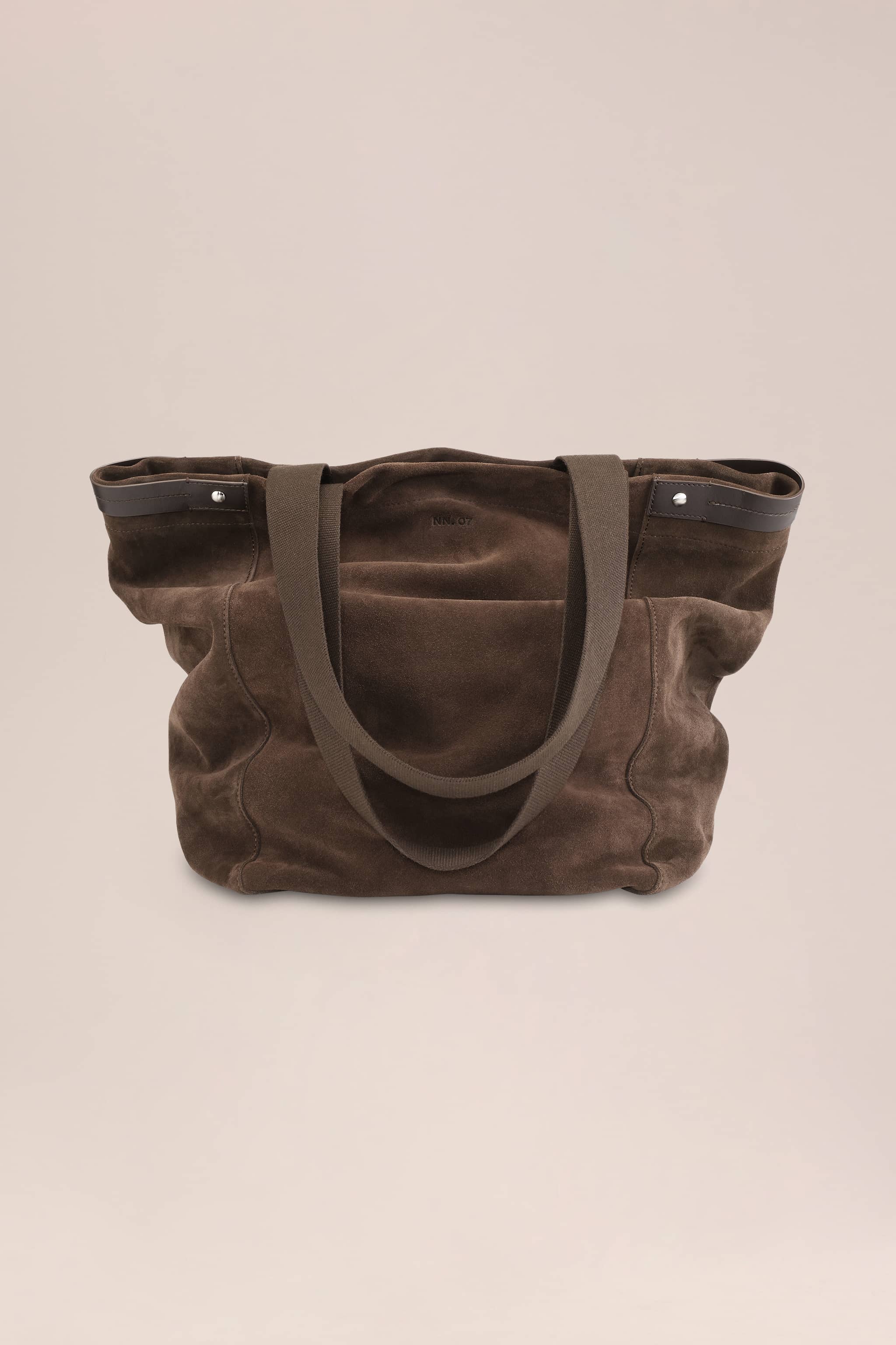 Versatile tote bag crafted from soft yet durable suede with smooth leather grip handles. Features dual carrying options with woven webbing strap for shoulder wear or sleek short handles for hand-carrying. Fully lined with cotton canvas, includes interior zip pocket for essentials and hook closure.