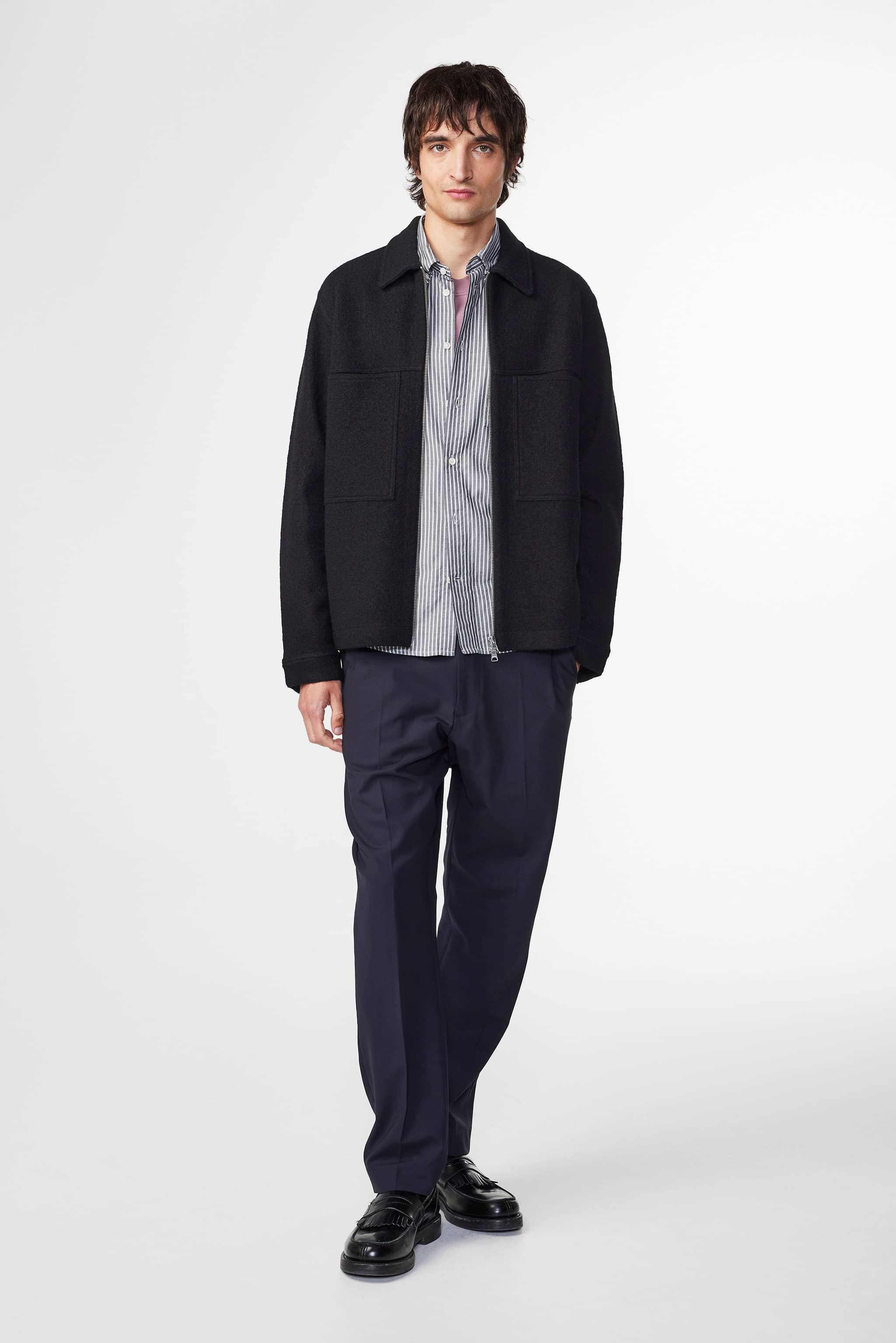 An undyed zip-up overshirt crafted in boiled merino wool, complete with two extra-large front chest pockets.