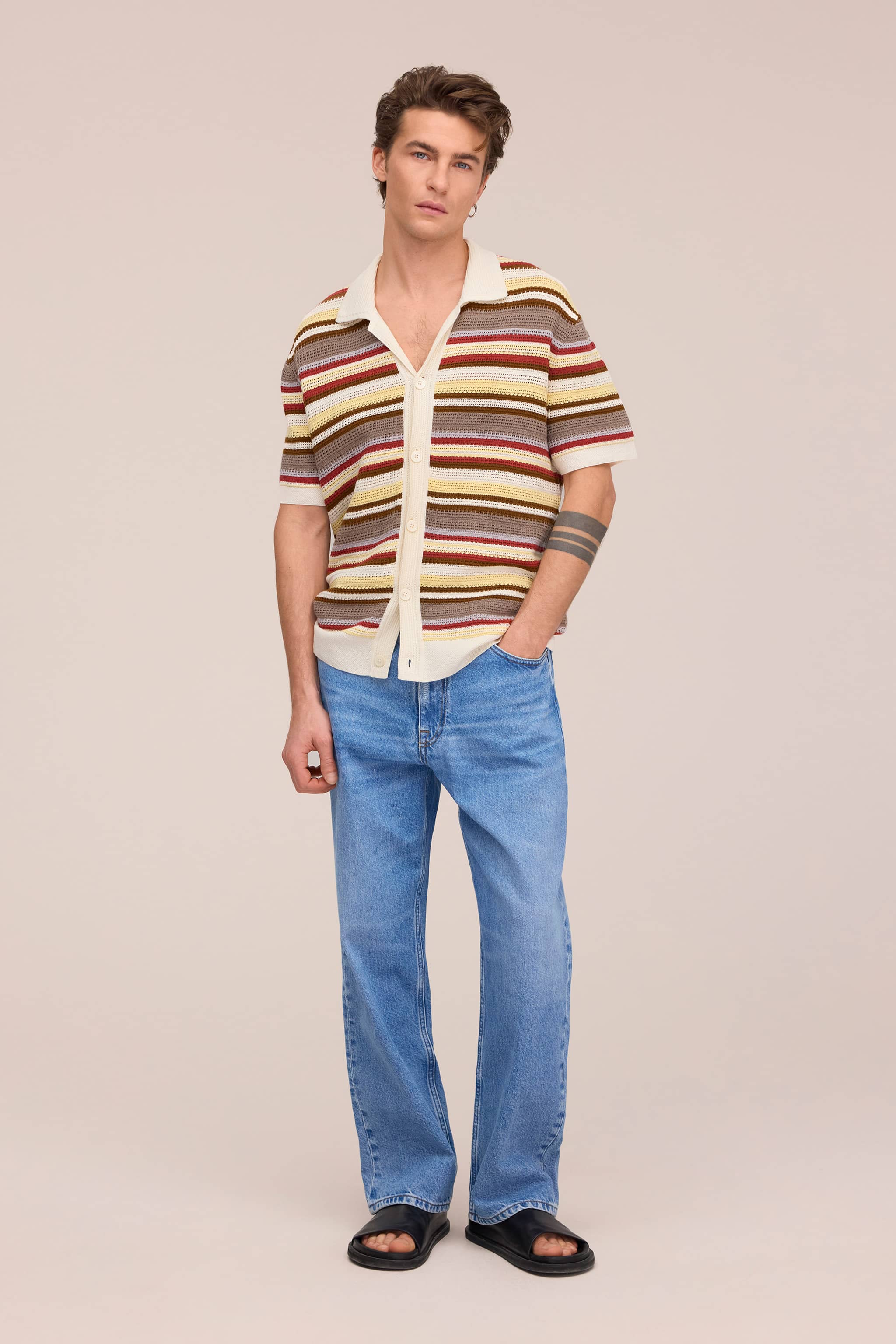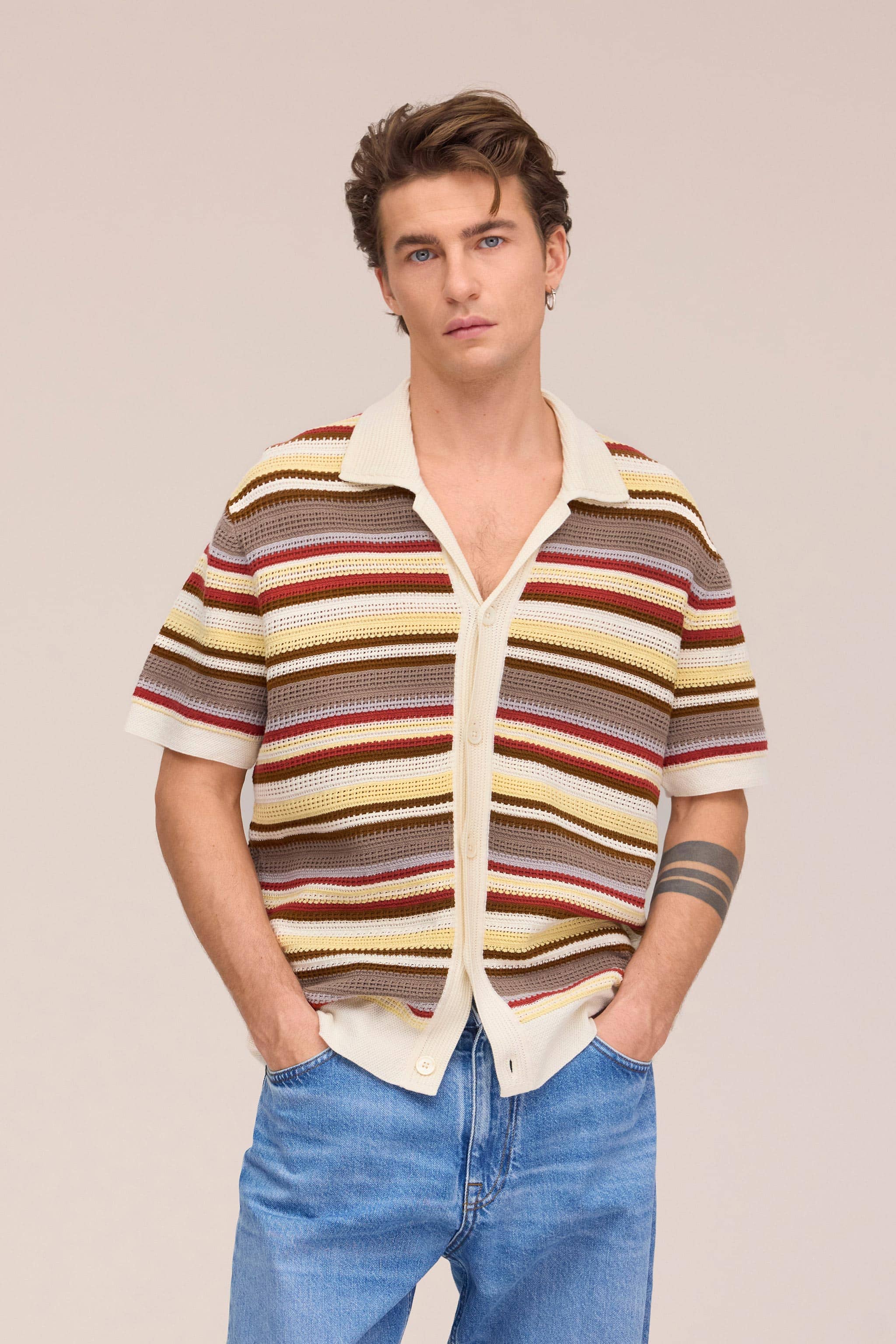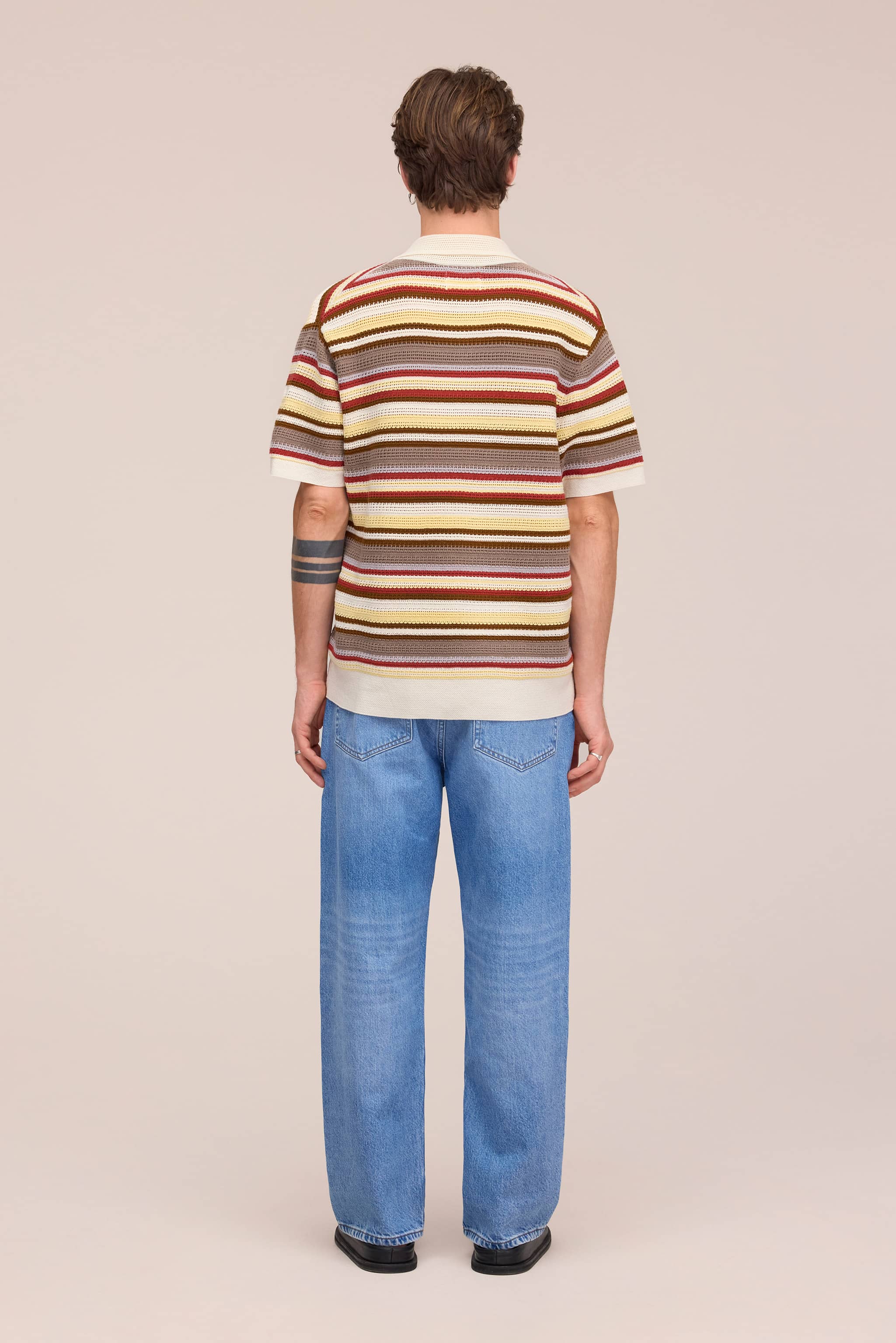 Lightweight striped polo made from wool blend, featuring a pointelle stitch for a soft and breathable finish.