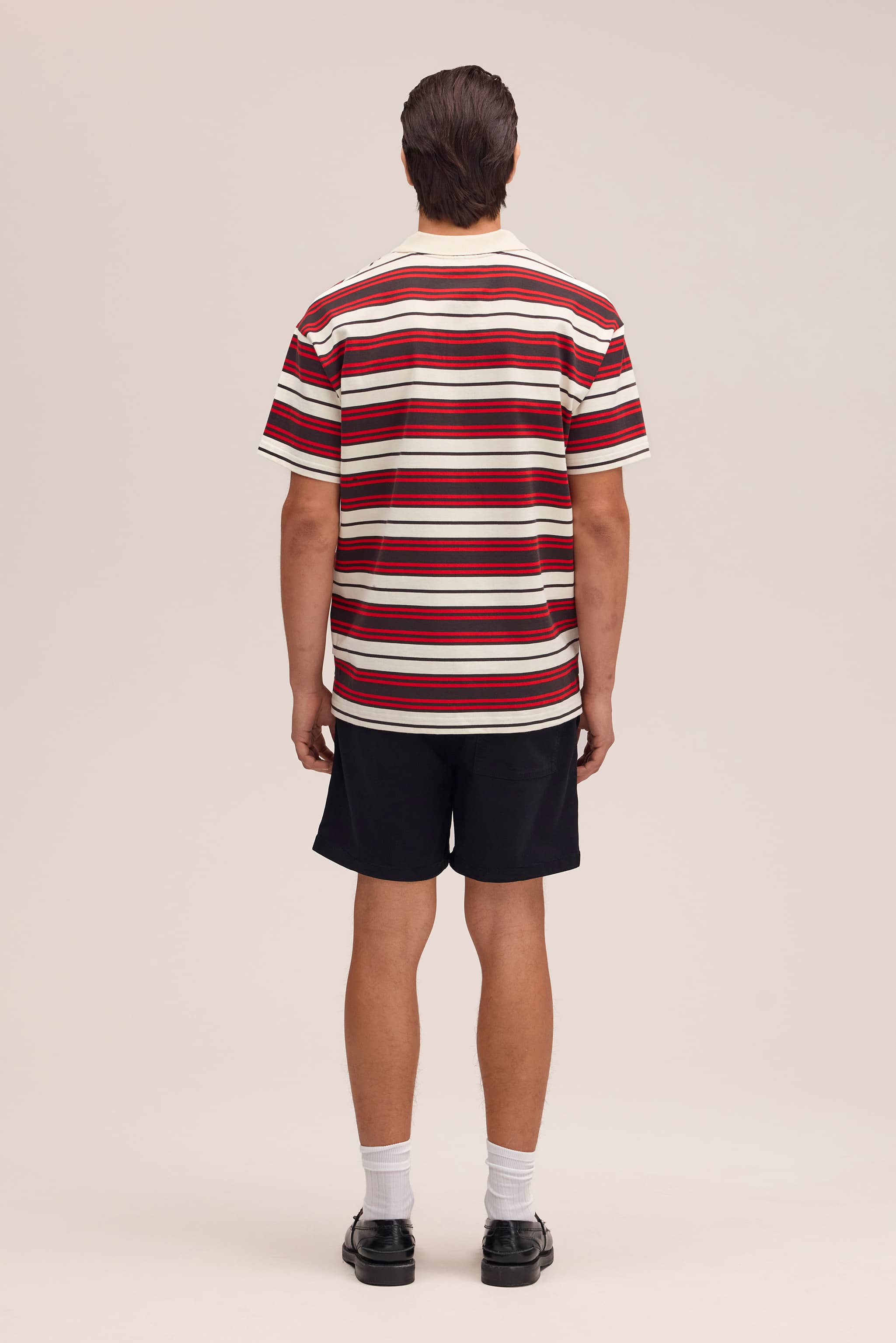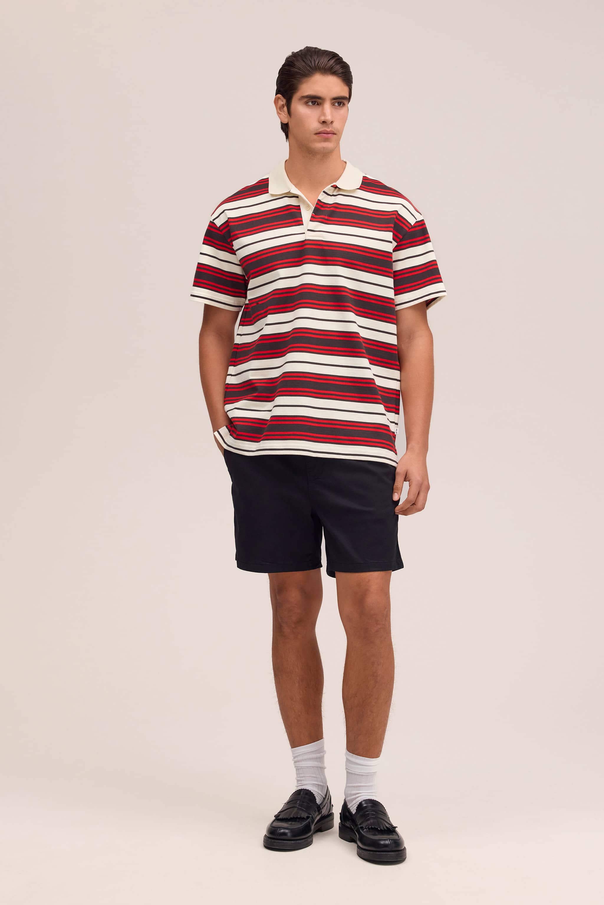 Medium-weight polo shirt made from organic cotton in a yarn-dyed stripe. Designed with sporty elements including a flat knitted rib collar, concealed button placket, and 3 rubber buttons.