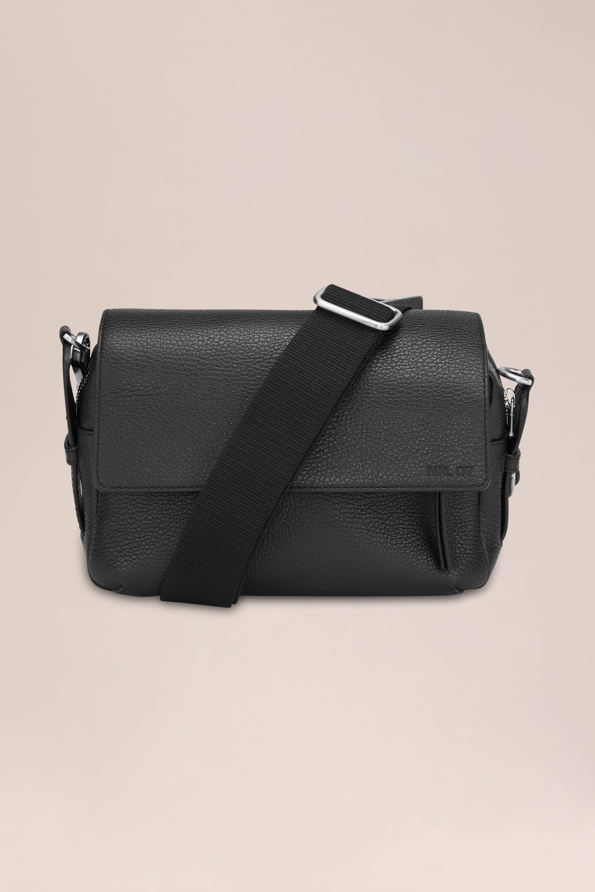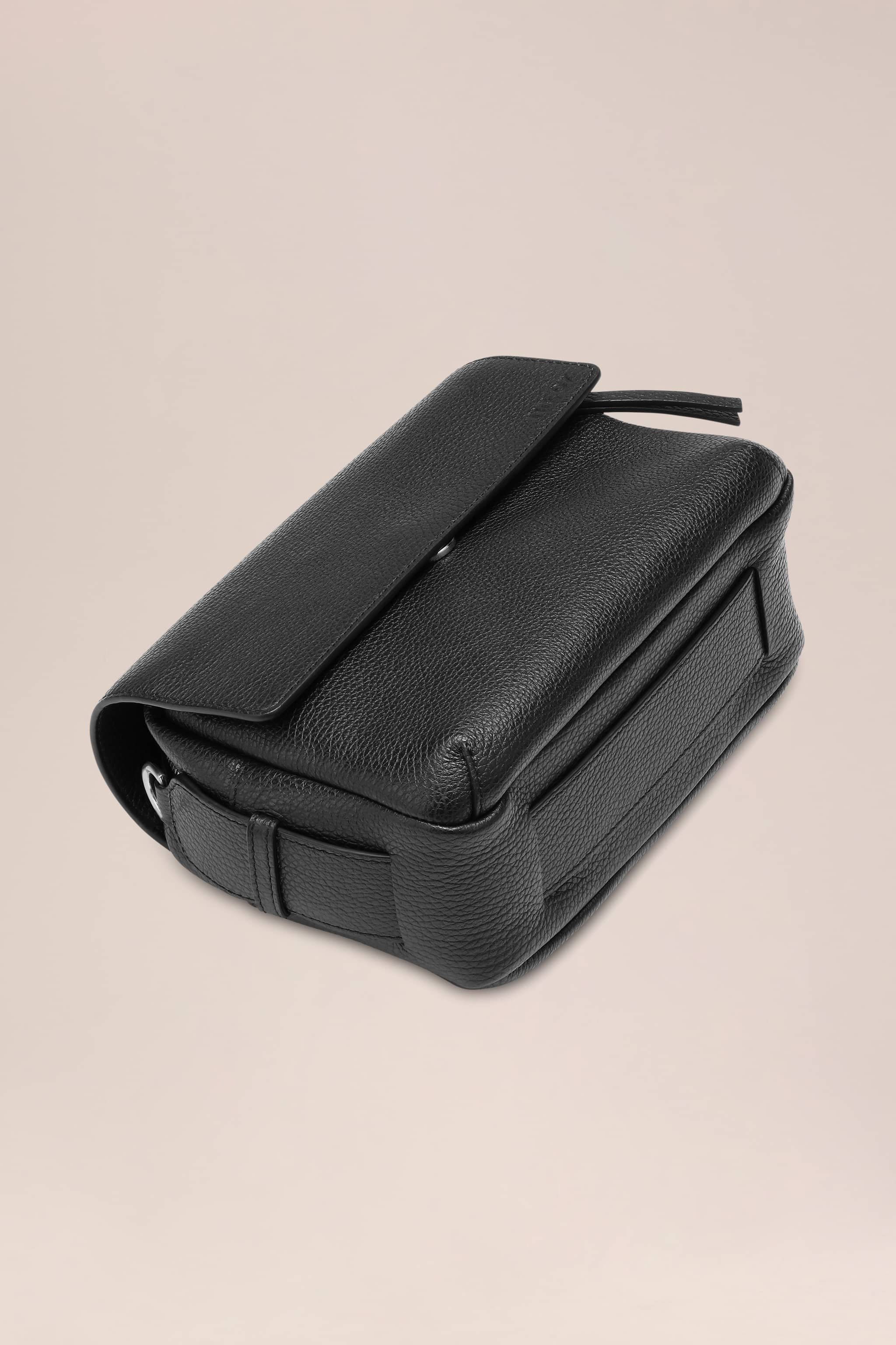 Utility satchel crafted from soft grain leather with a pebble texture. Features one main compartment with cotton canvas lining, front zip pocket with 3D darting, and completed with an interior metal ring for keys and adjustable detachable strap.