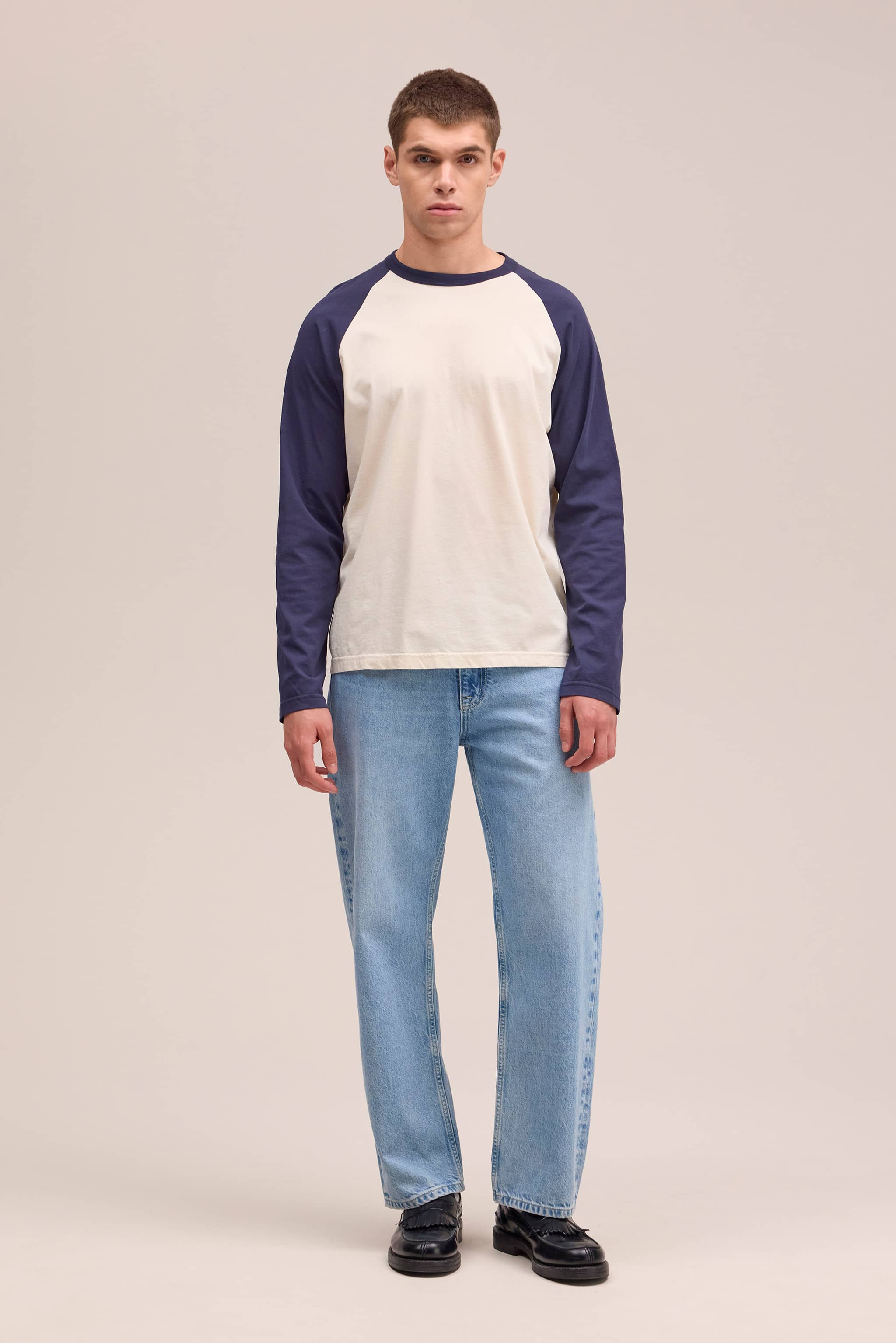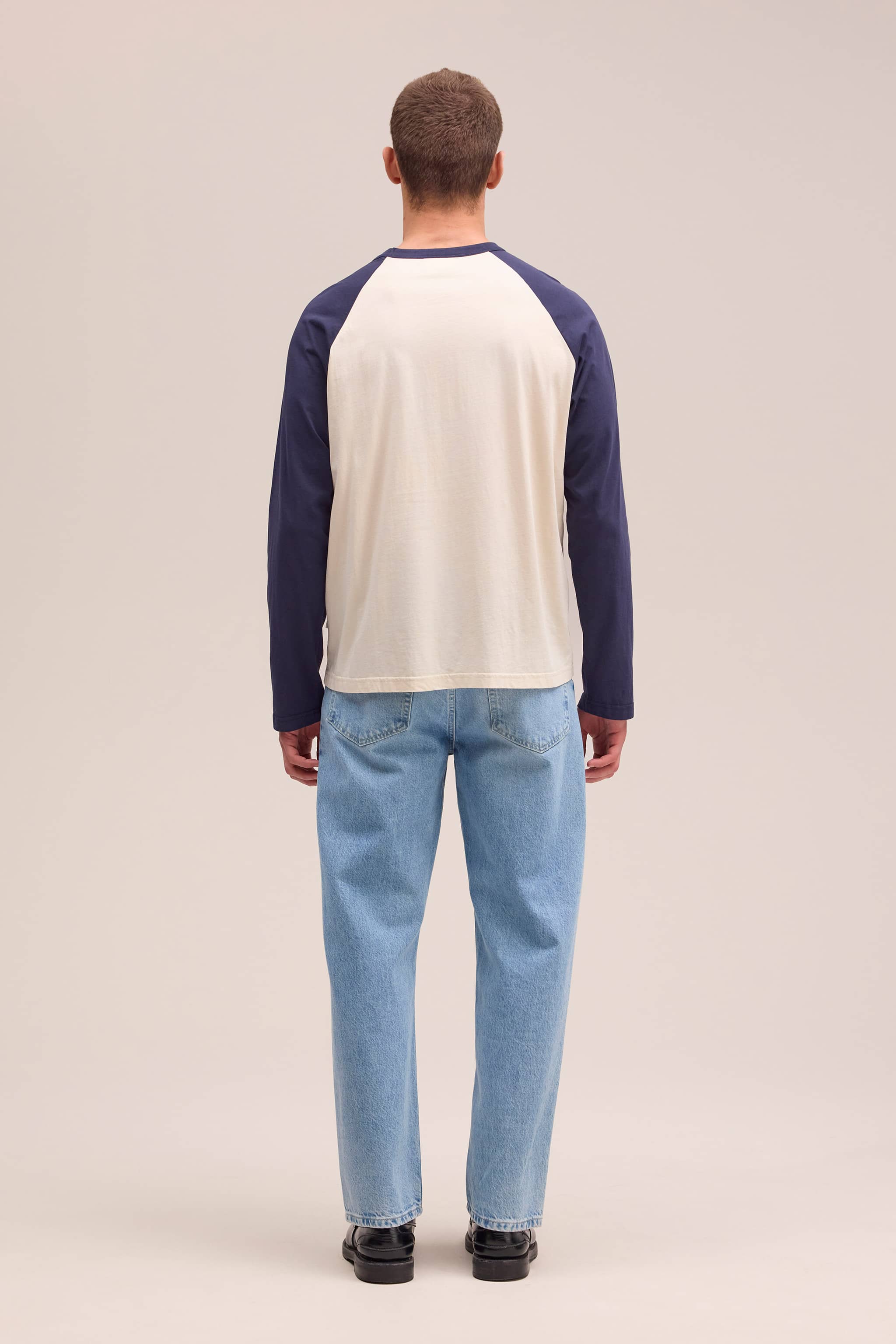 Lightweight long sleeve tee crafted from organic cotton. Features a soft, smooth handfeel and relaxed raglan sleeves with a subtle flag label at the side. Finished with a 1x1 neck rib, top stitching around the neckline, and twin needle stitching on the cuffs and hems.