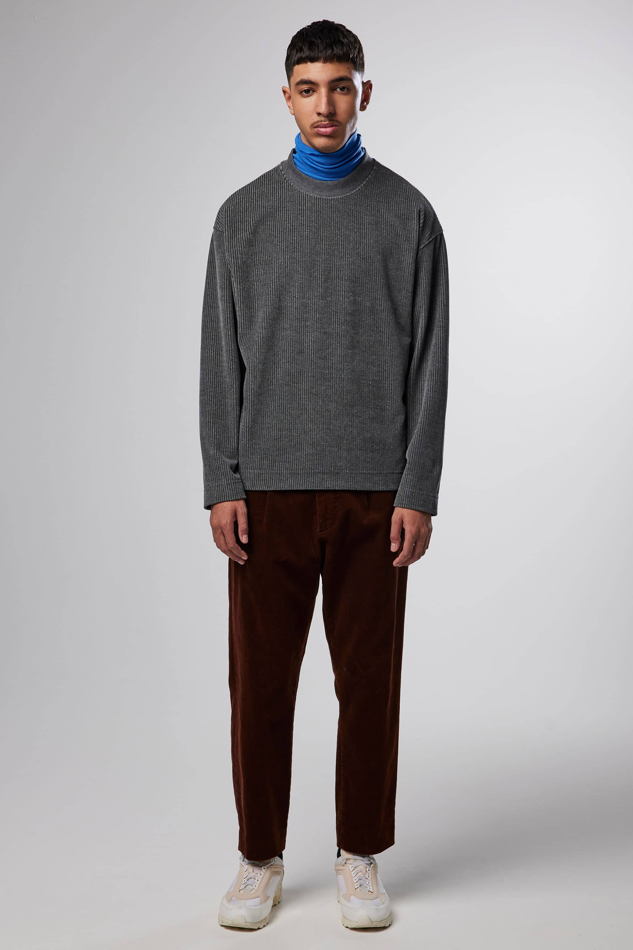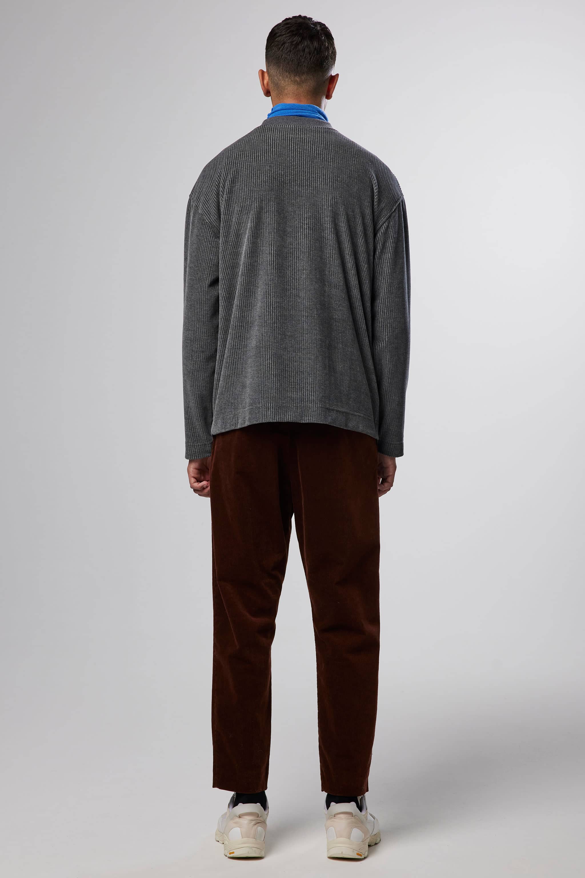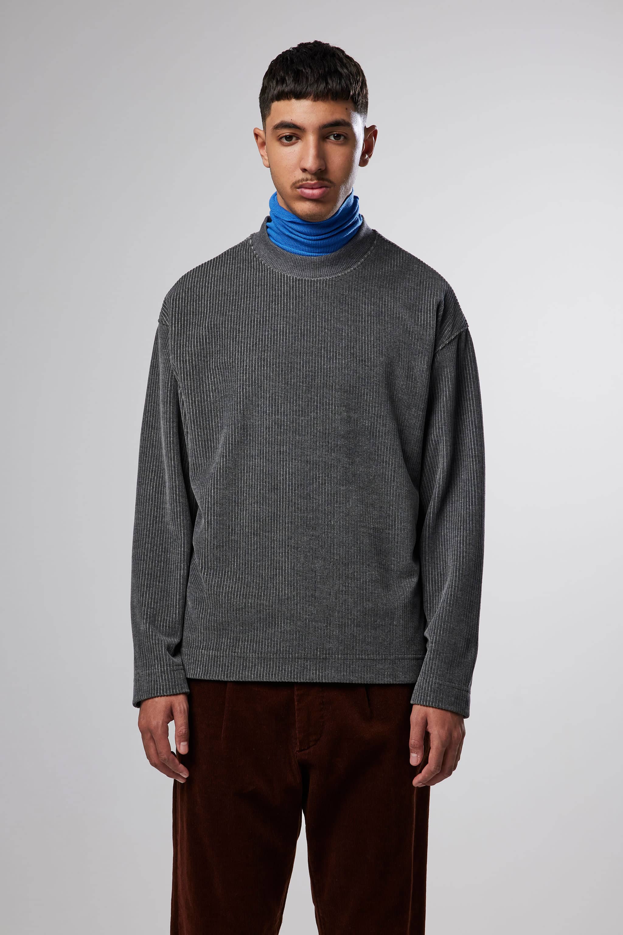 Long sleeve shirt made in a smooth cotton blend jersey. Features a large rib detail along the neckline and twin needle stitching details throughout.