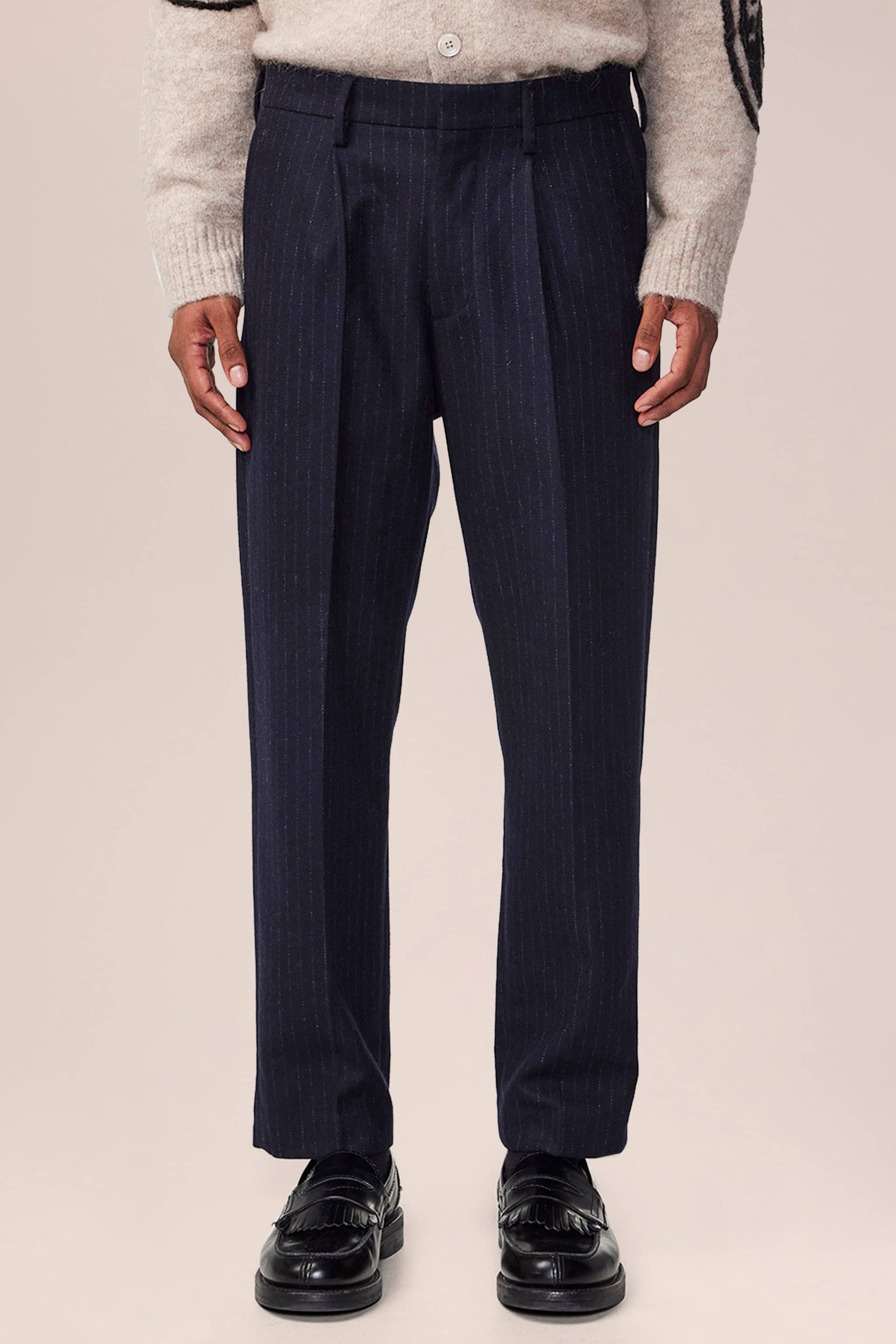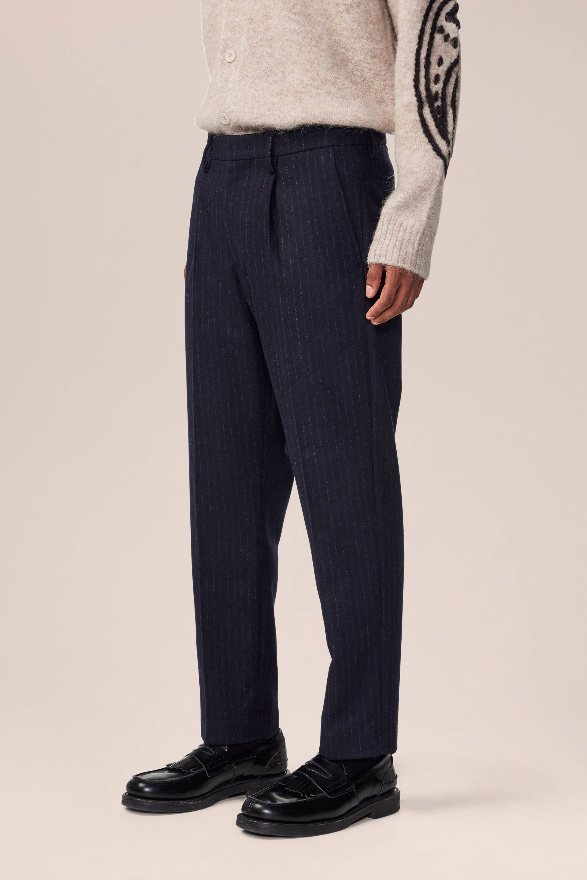 Dress trousers in a regular fit with tapered legs, crafted in a 380 g/m2 recycled wool blend melange twill. Features a minimalist design with press folds, blind hem, and hidden closure.