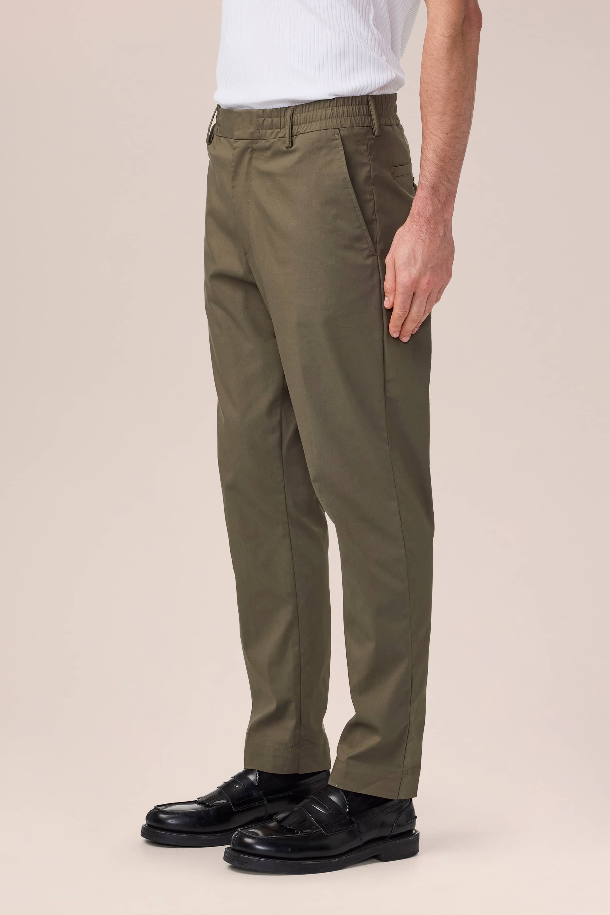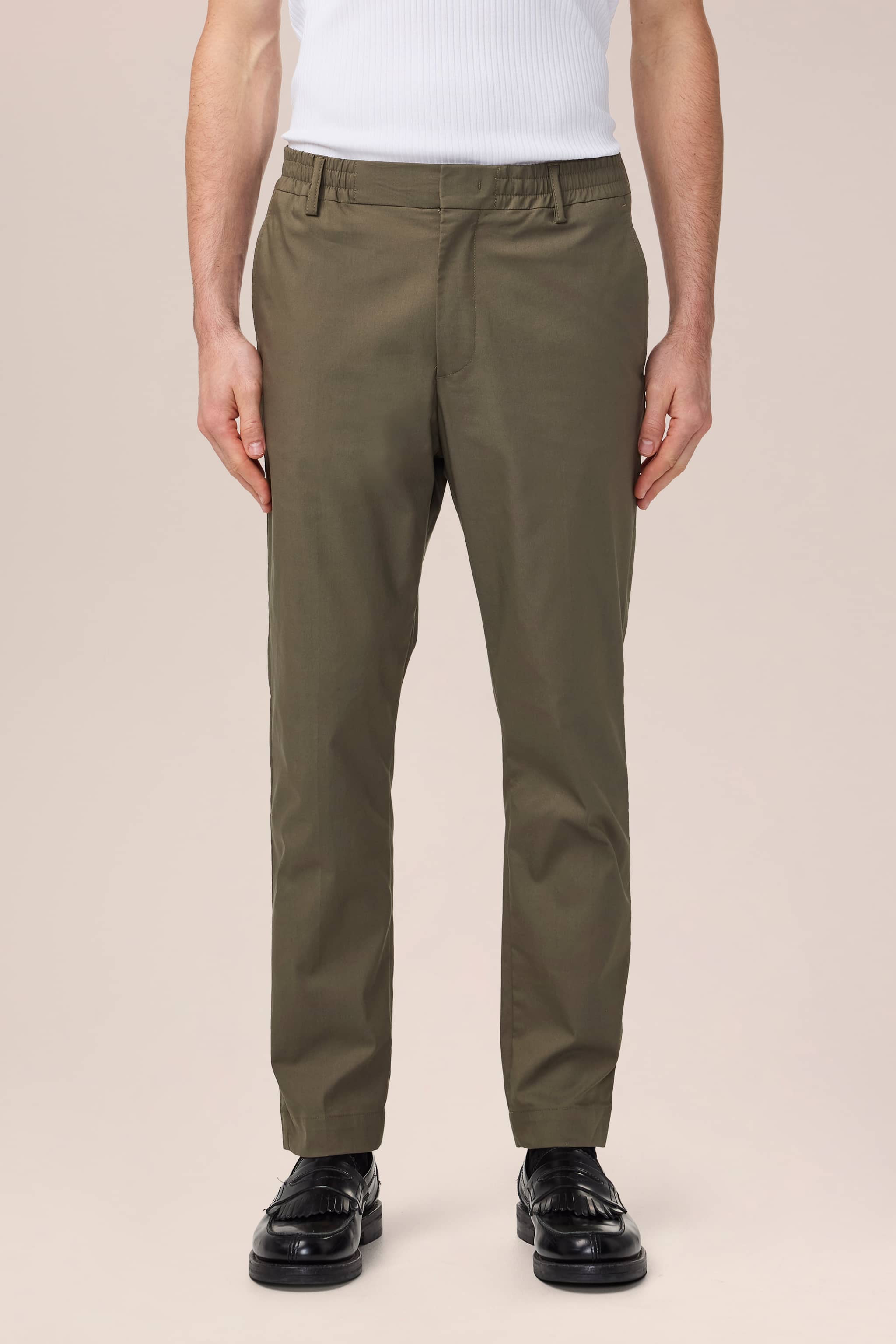 Lightweight trousers in a regular fit trousers with tapered leg, crafted in a 170 g/m2 cotton blend. Designed with an elasticised waistband with drawstring closure. Features a minimalist design with press folds, blind hem, and hidden closure.