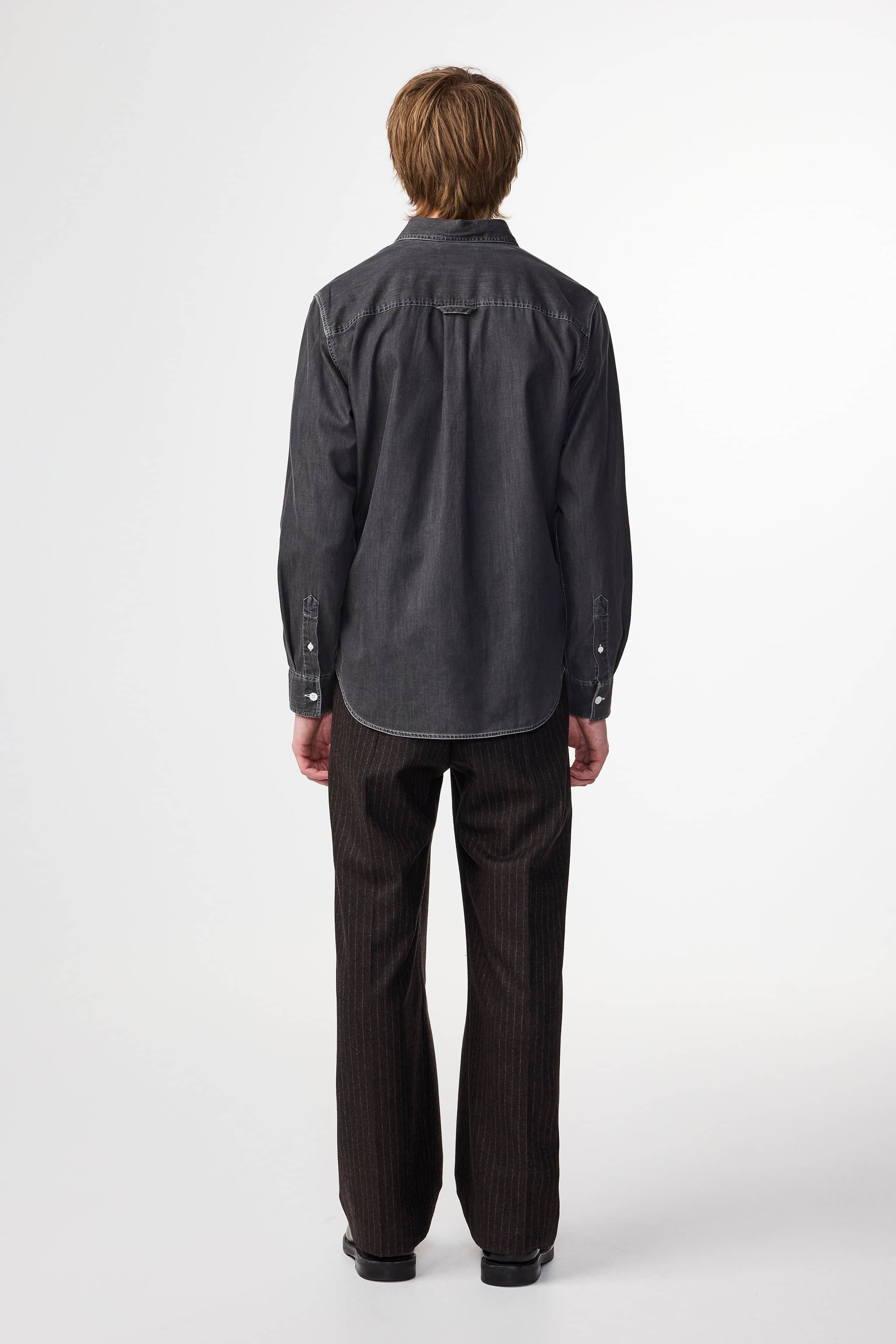 Casual denim shirt crafted from soft Egyptian organic cotton twill, featuring Mother-of-Pearl buttons, a wide placket, and a large collar.