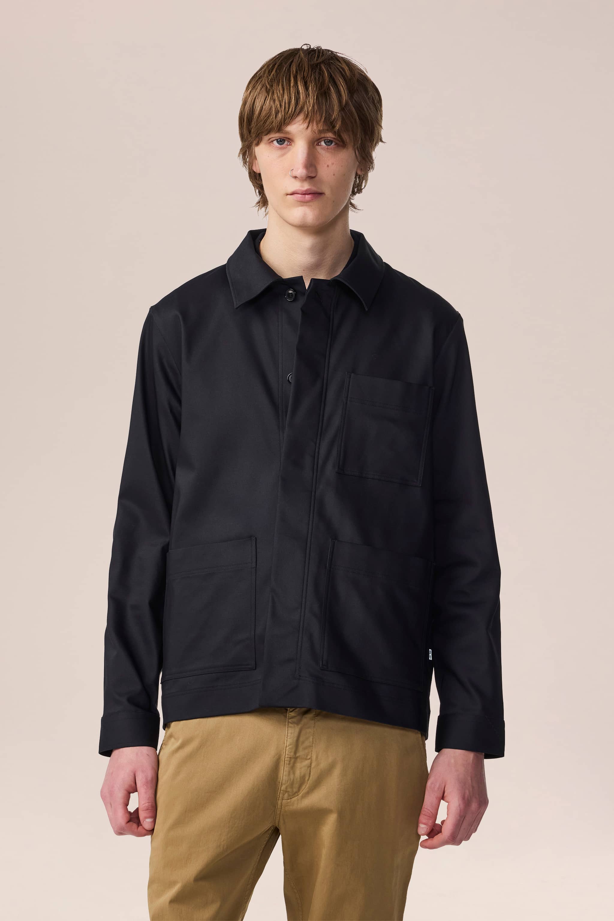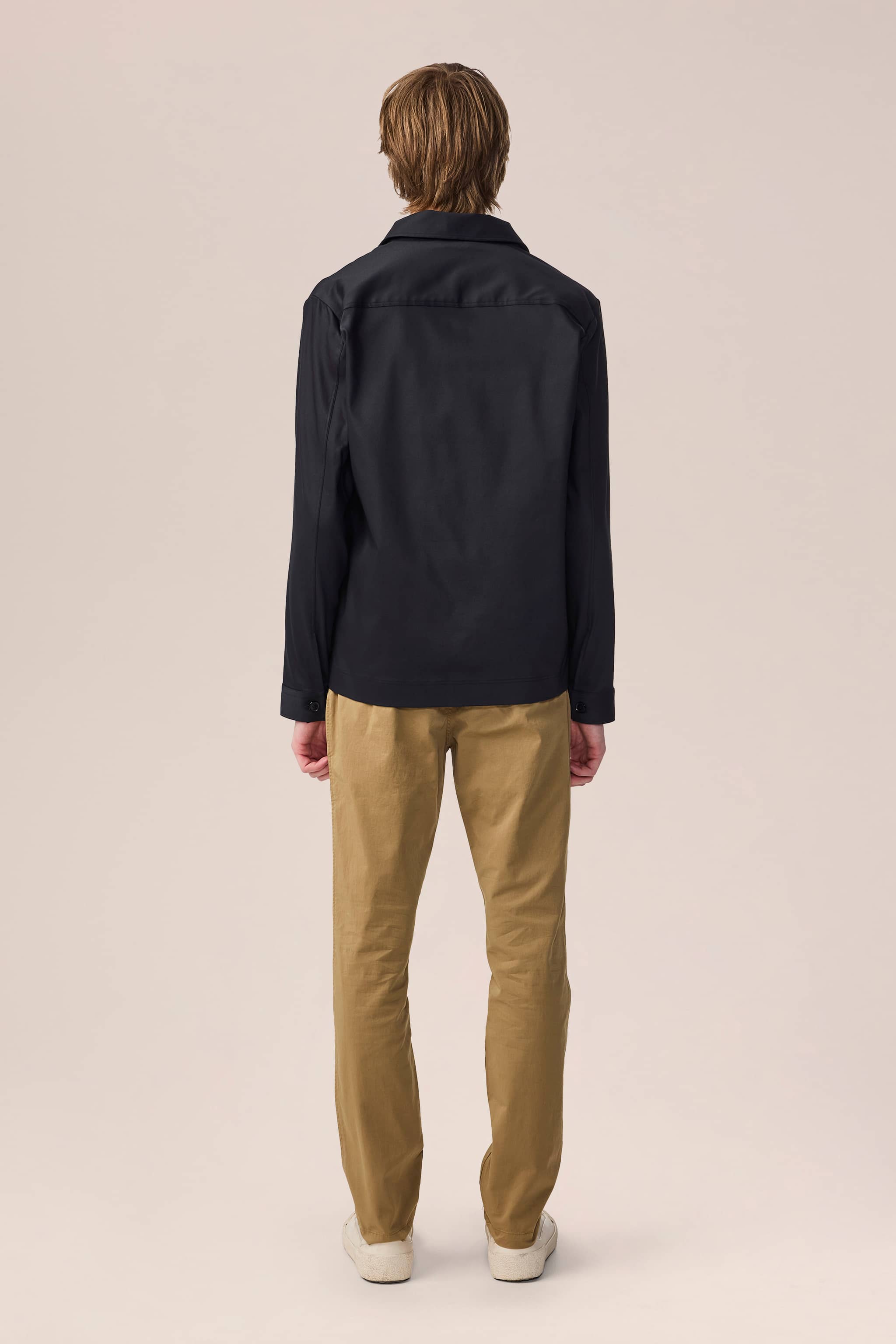 Workwear-inspired overshirt crafted in a cotton blend with a touch of stretch. Designed with a soft collar, a single chest pocket, and twin patch pockets at the waist.