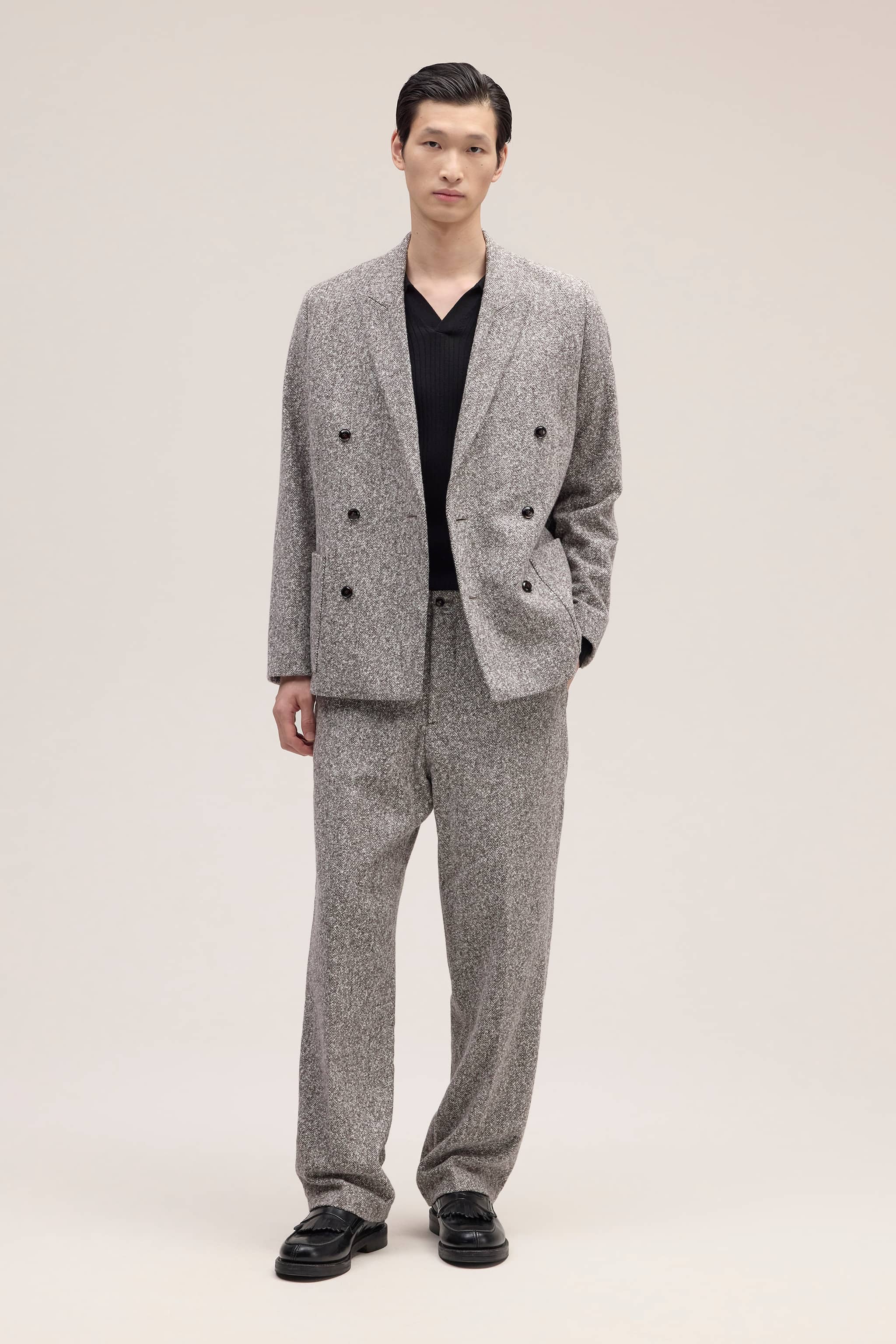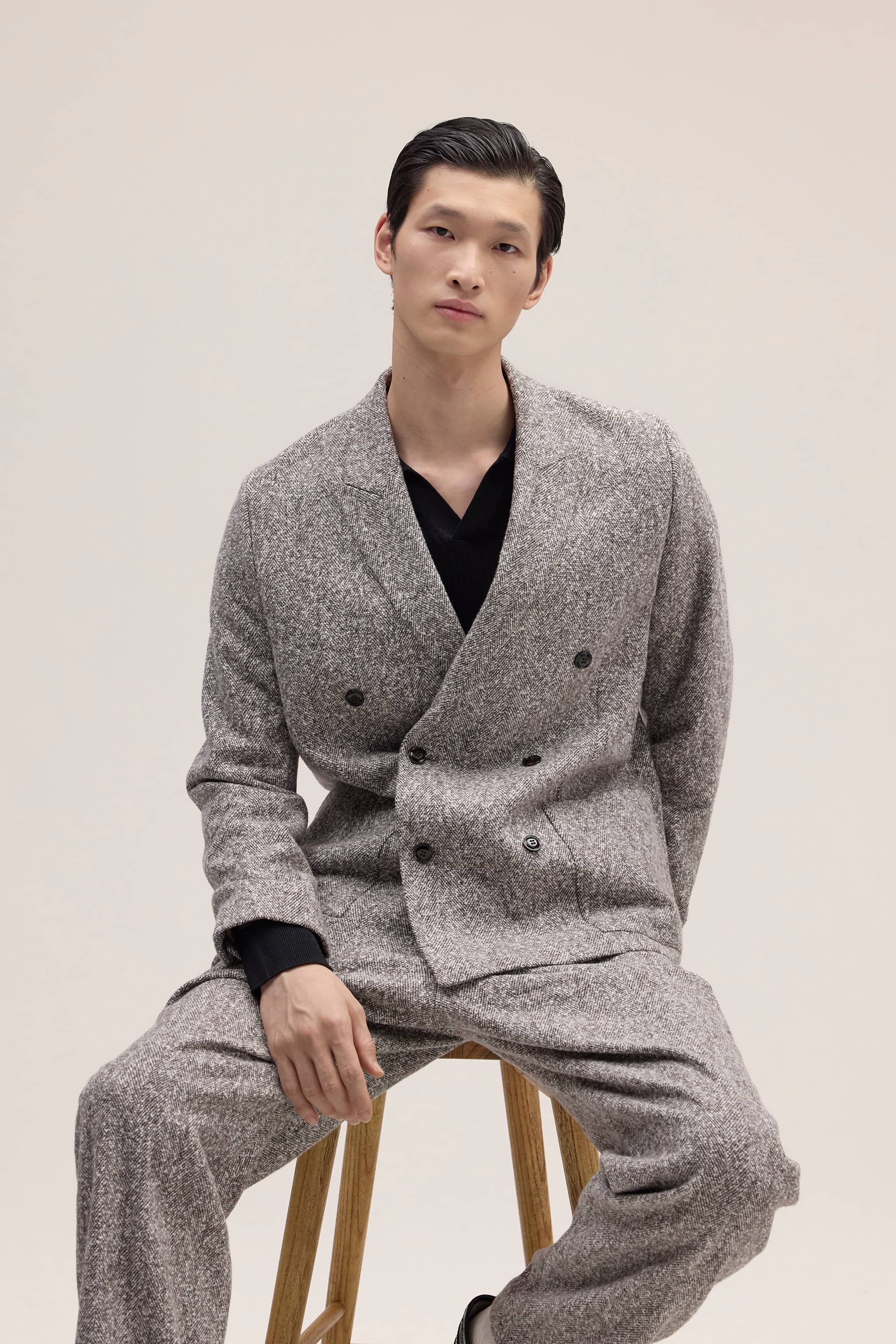 A sophisticated statement blazer crafted from Italian bouclé in a classic herringbone weave. Featuring a structured yet comfortable fit, double-breasted buttons, and patch pockets for a refined touch.