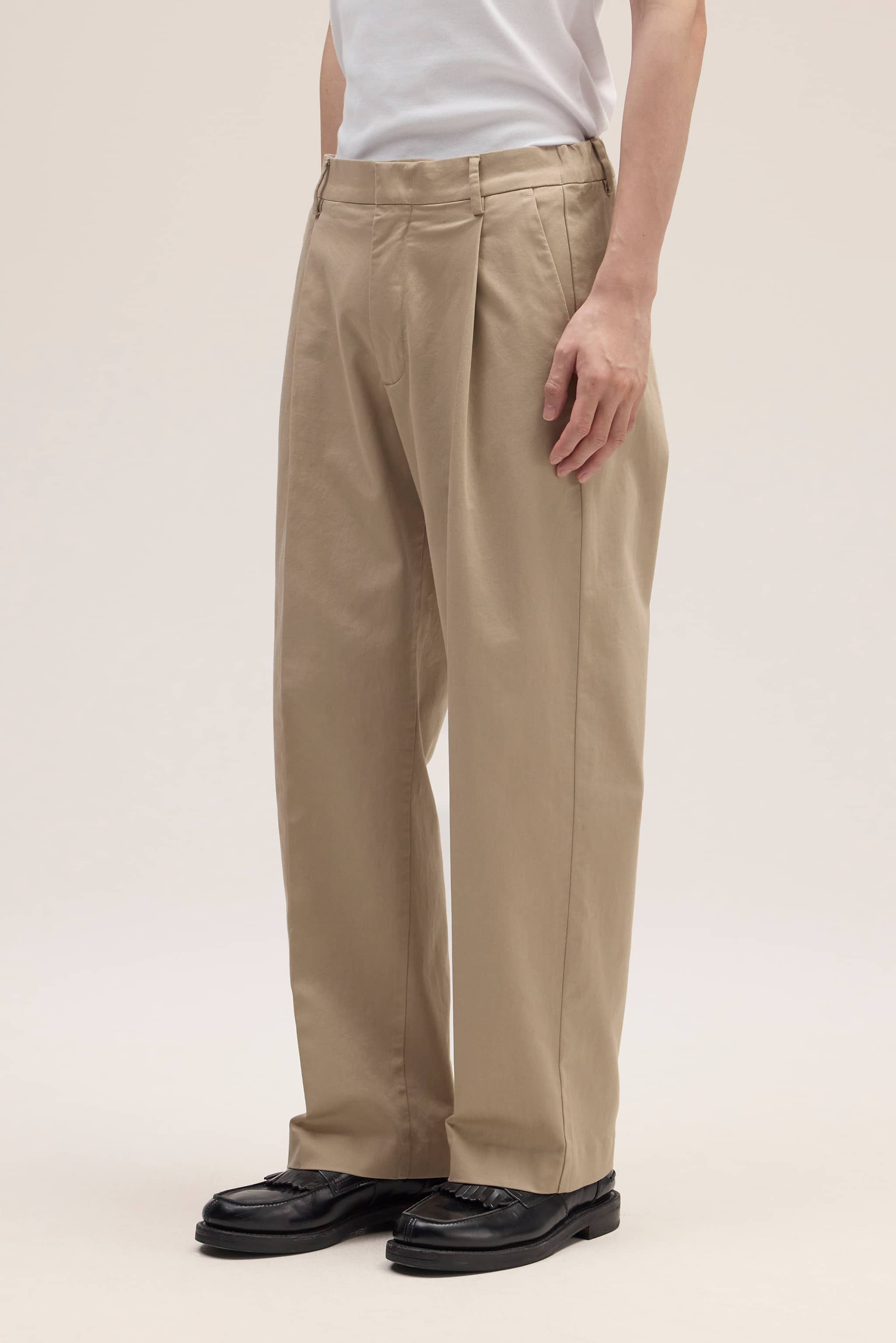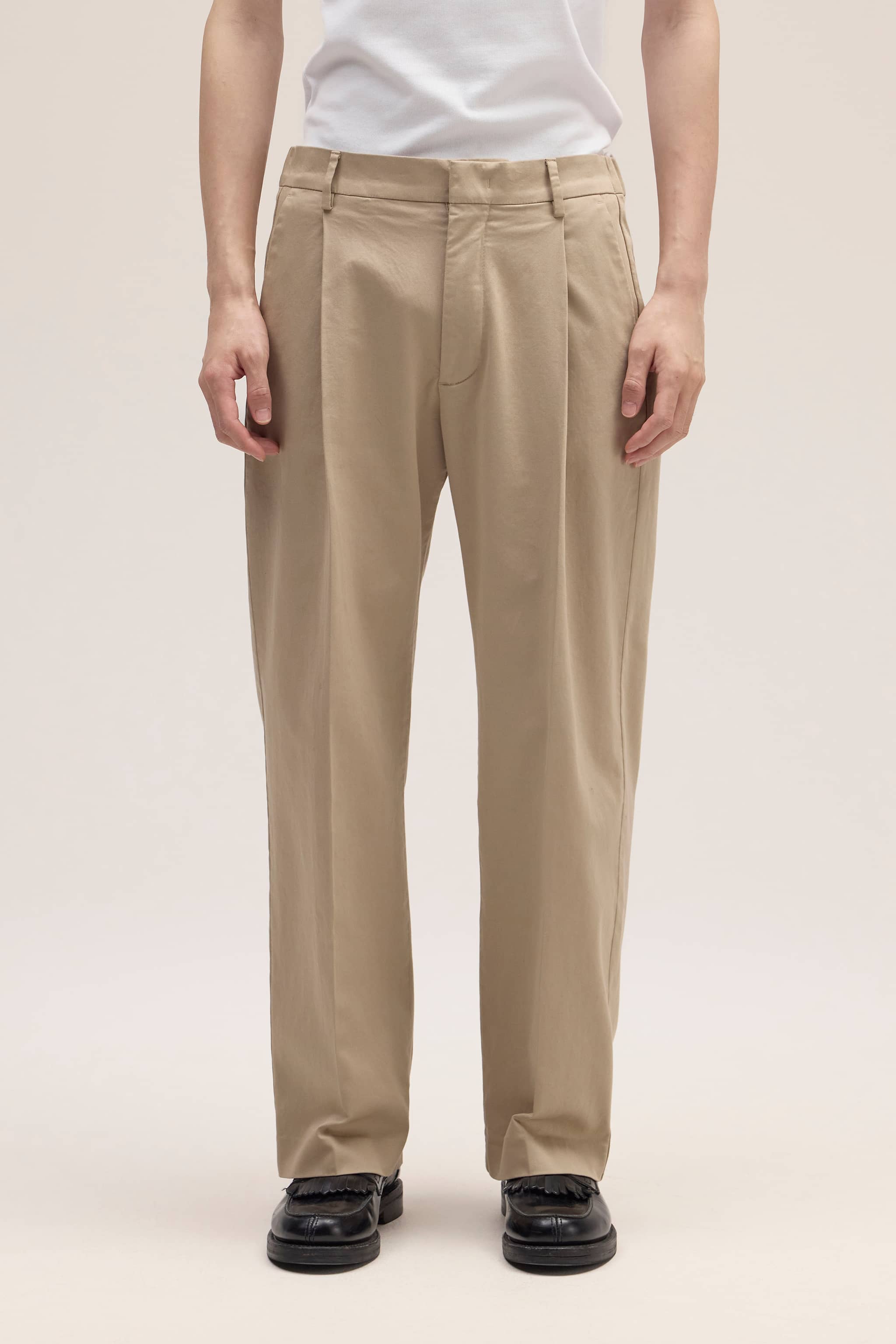 Relaxed-fit pleated trousers crafted from soft organic cotton with a lustrous satin finish. Designed with double pleats at the front and a hook and bar closure, offering a drapey yet crisp handfeel.