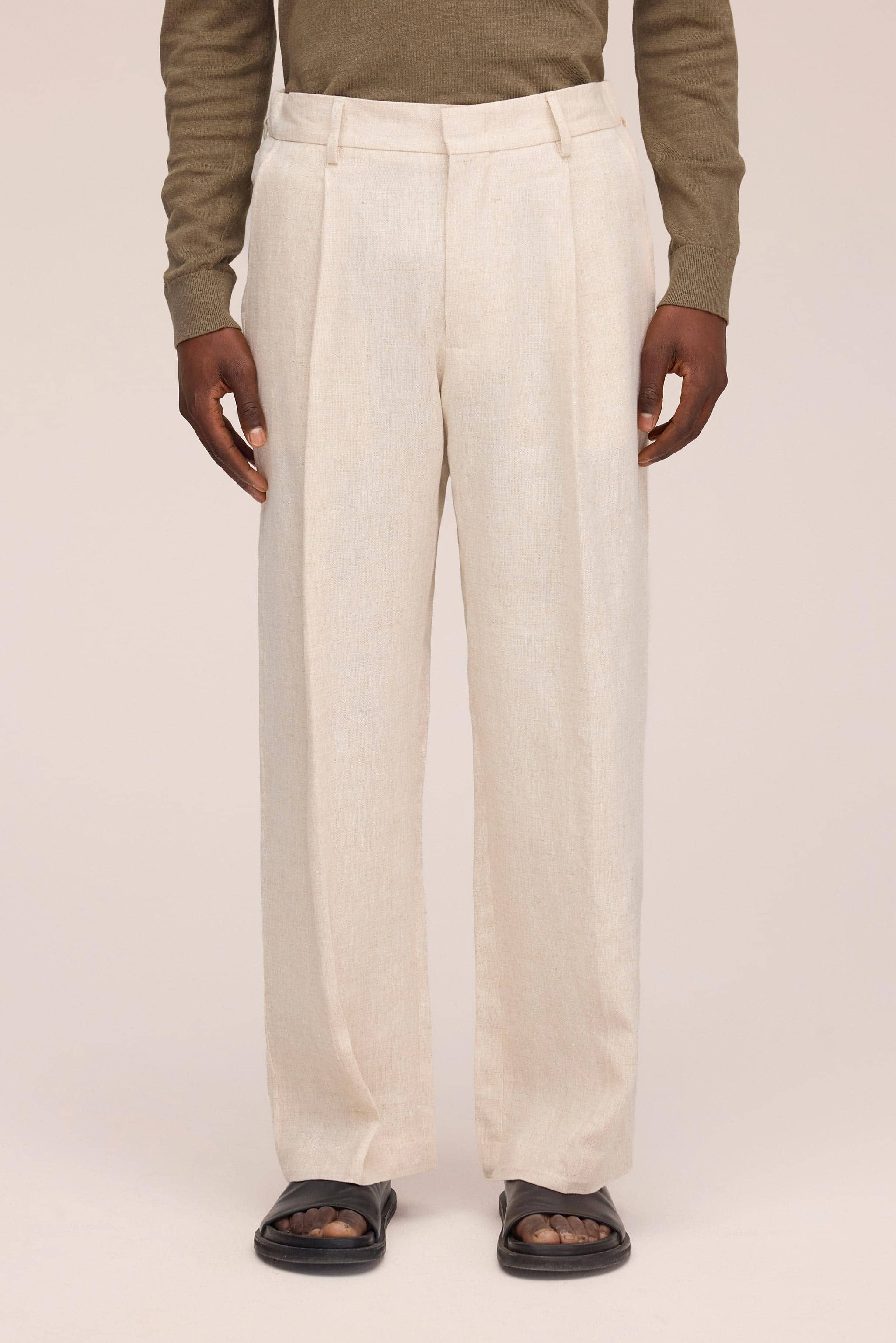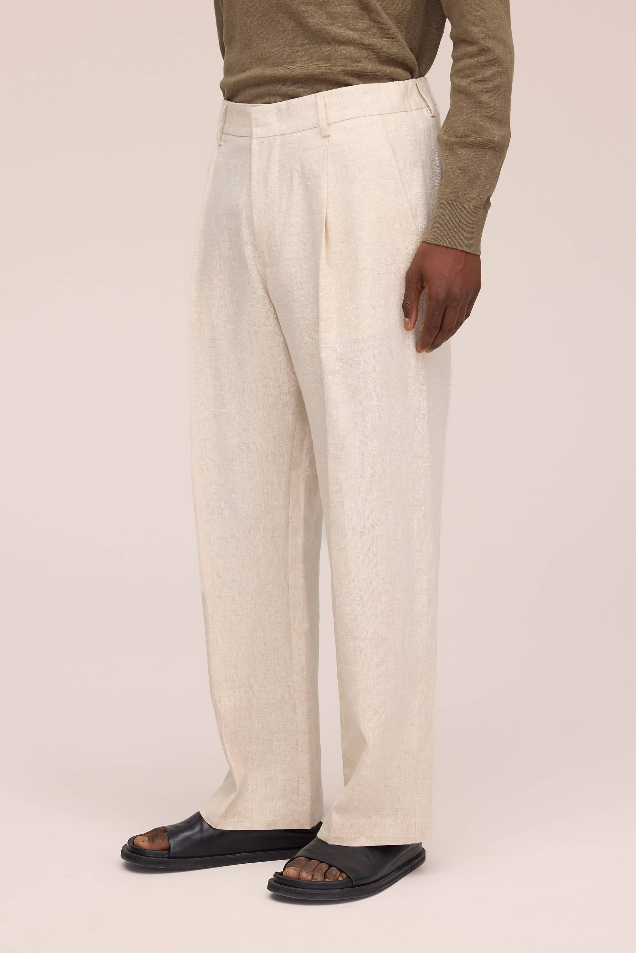 Relaxed-fit pants crafted from European linen fabric with a drapey handfeel. Designed with straight legs, double pleats at the front and a hook & bar closure for a refined, comfortable fit.