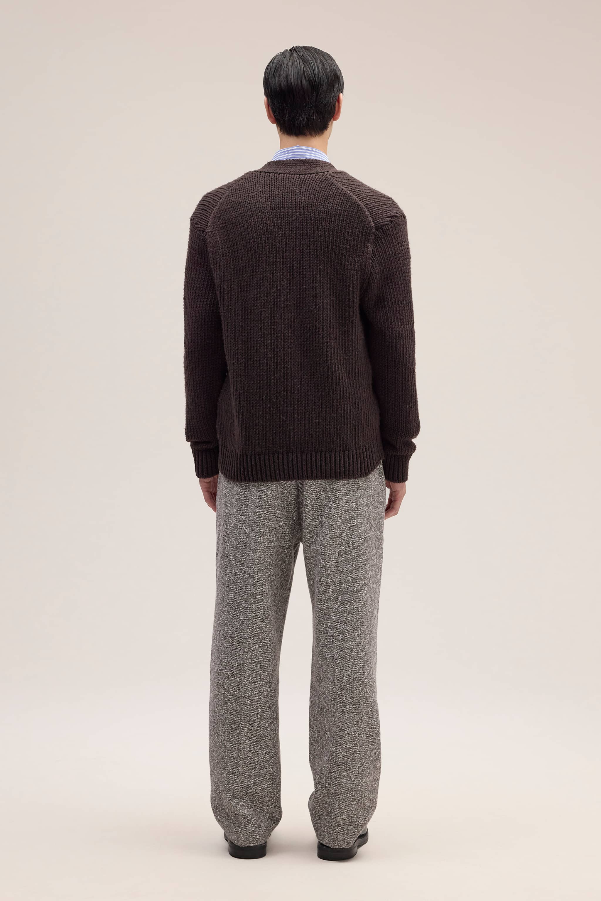 Regular fit cardigan crafted from a recycled polyester blend with a soft peachy texture. Designed with dyed to match buttons and a intarsia artwork.