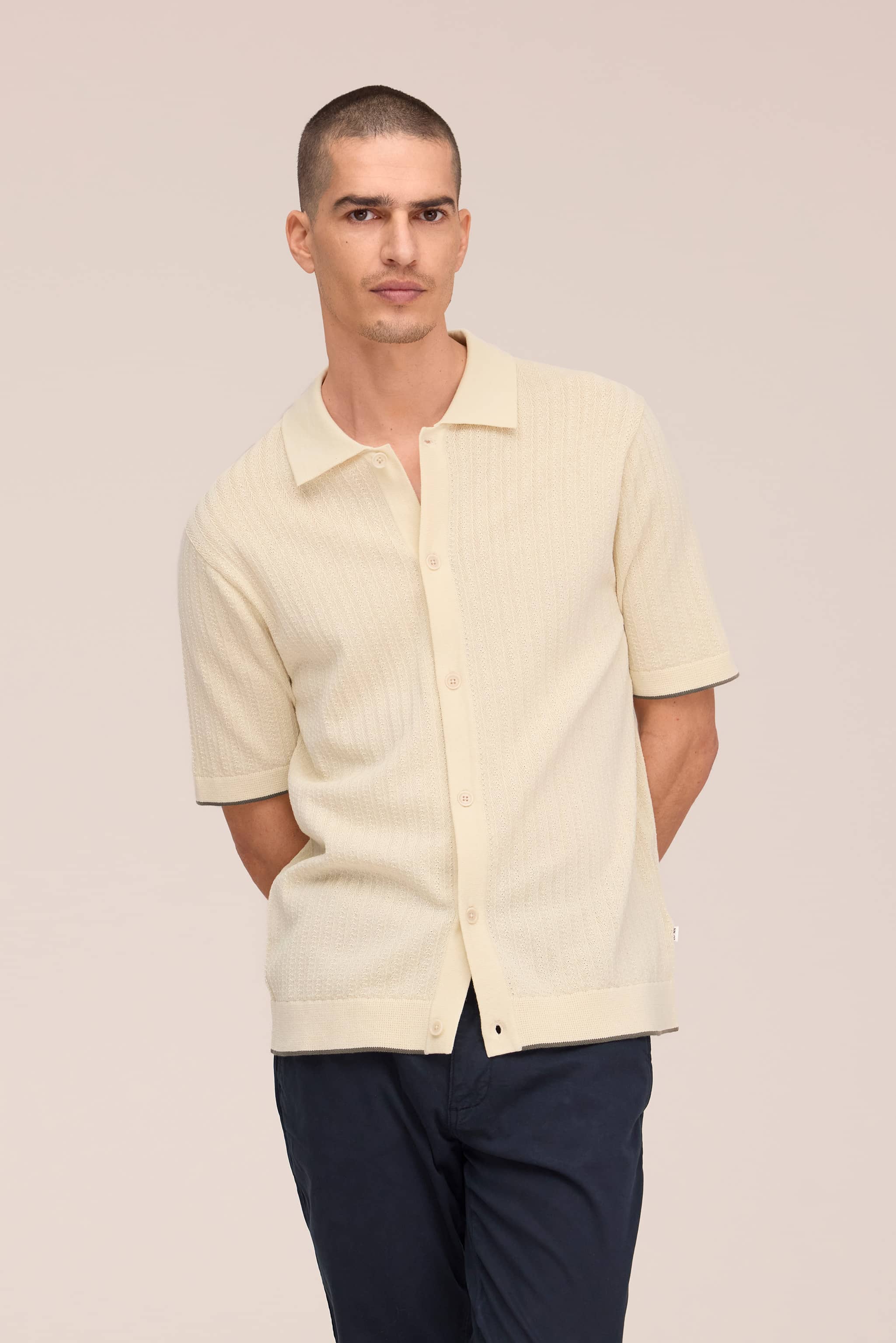 Short sleeve knitted cardigan polo crafted in cotton. Designed with textured stitching throughout and is complete with Mother-of-Pearl buttons.