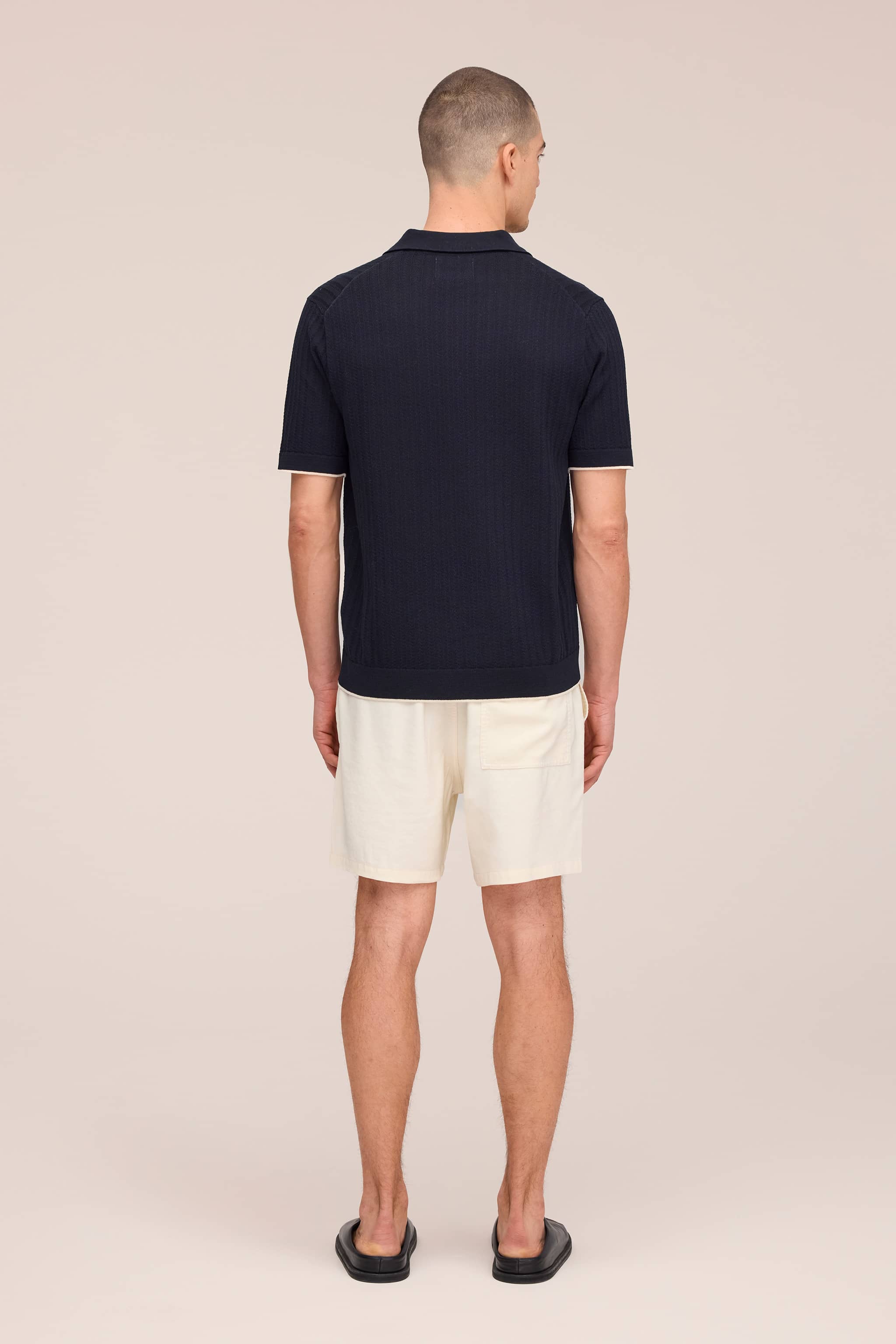 Open-collar polo cardigan crafted in organic cotton with bouclé yarn and textured rib stitch.