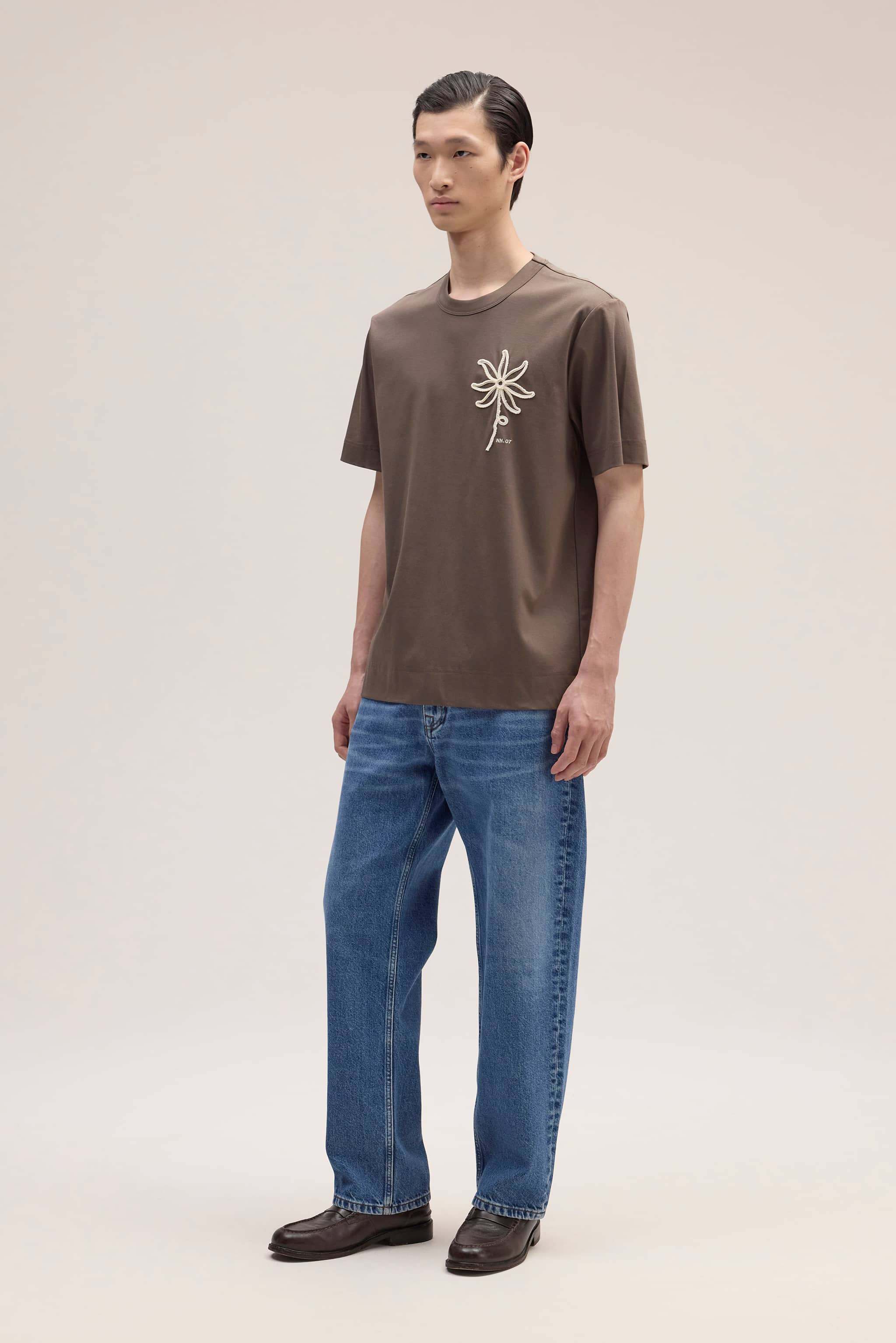Regular fit t-shirt crafted from mercerized organic cotton jersey interlock, providing a smooth, refined handfeel. Designed with a clean neckline, binding details, and a unique chest application.